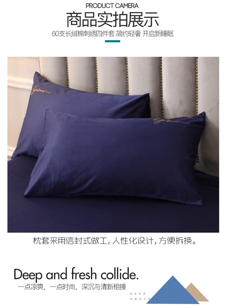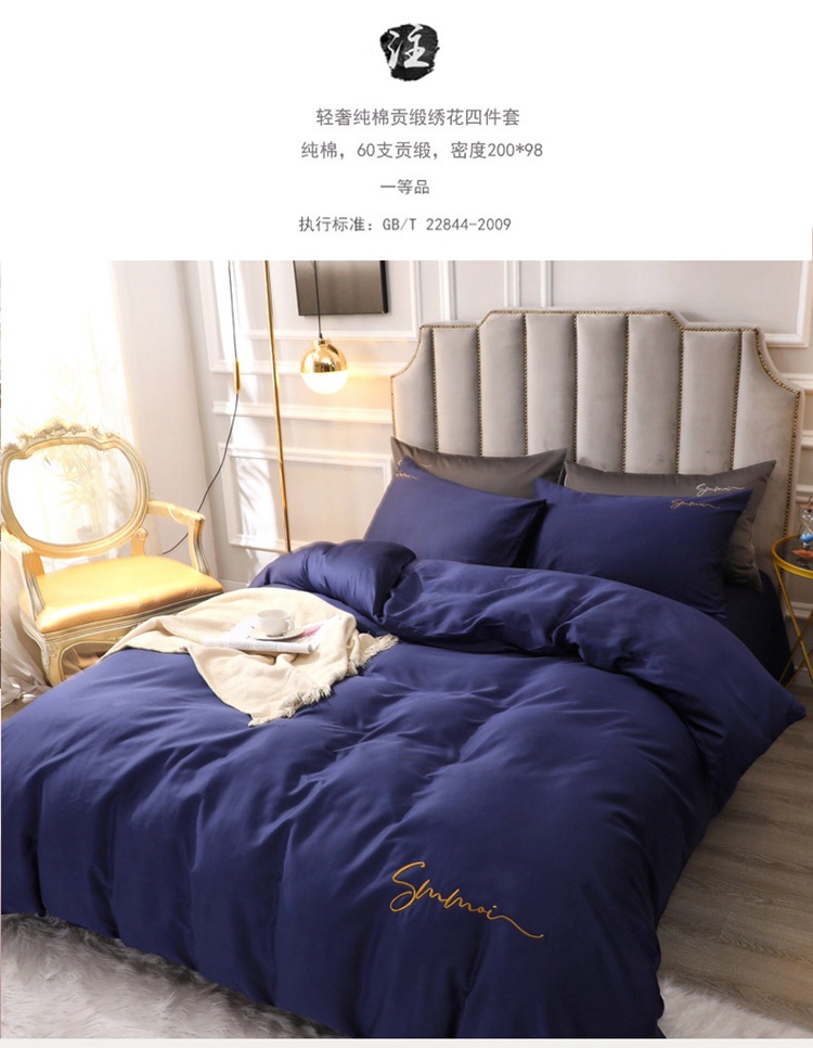 2021新款纯色拼色纯棉全棉60S贡缎长绒棉绣花四件套 丈青
