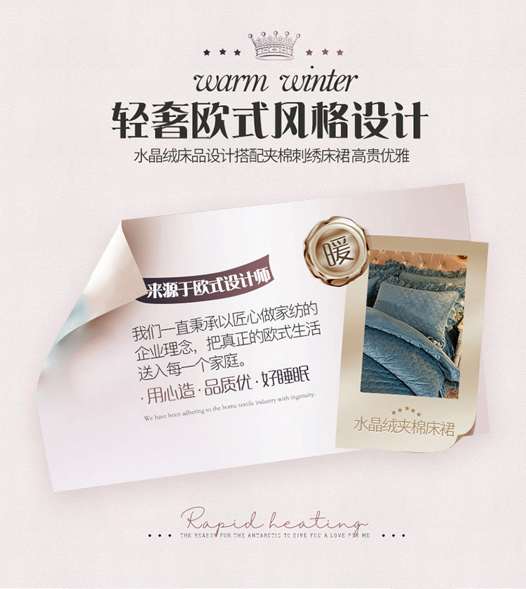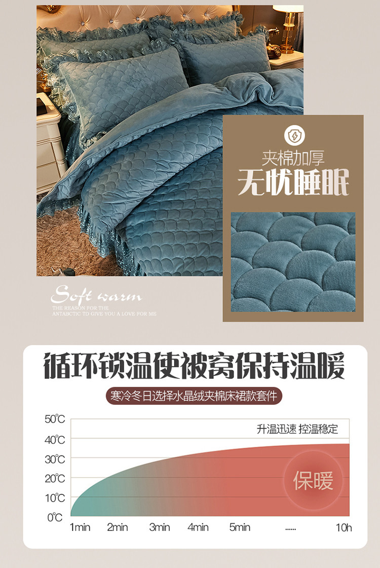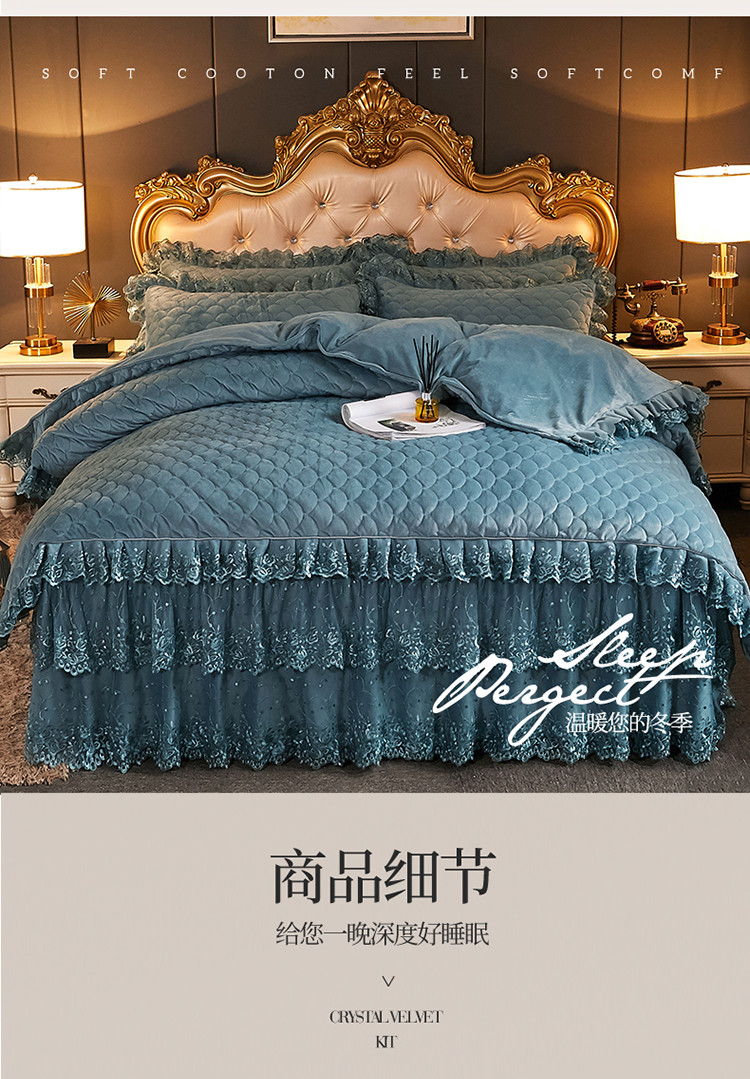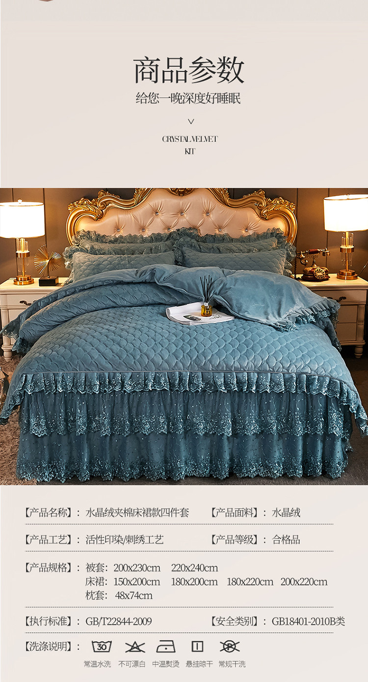 当前位置: 91家纺网 > 商品网购 > 床品套件 > 四件套 > 水晶绒四件套 > 恒爱2021新款水晶绒夹棉床裙款翩翩花舞系列四件套 孔雀绿