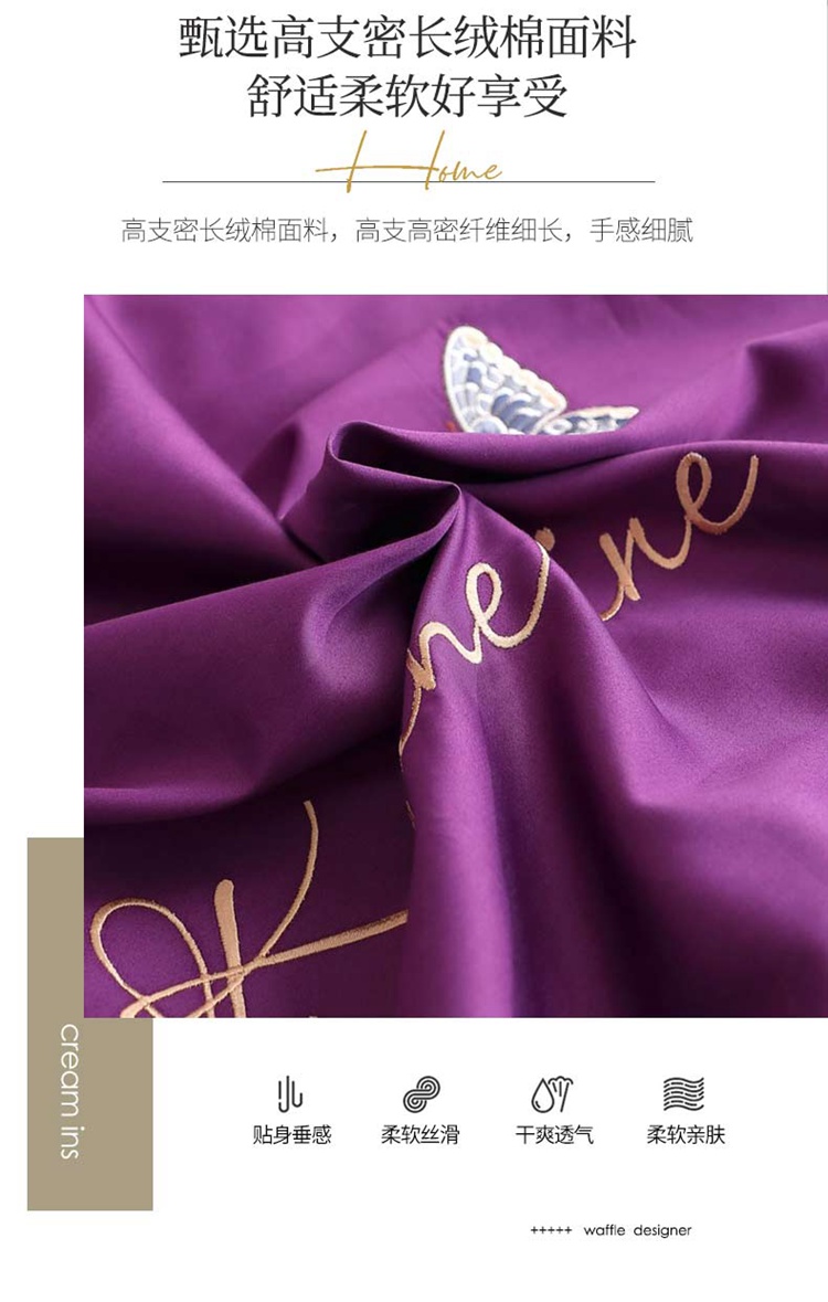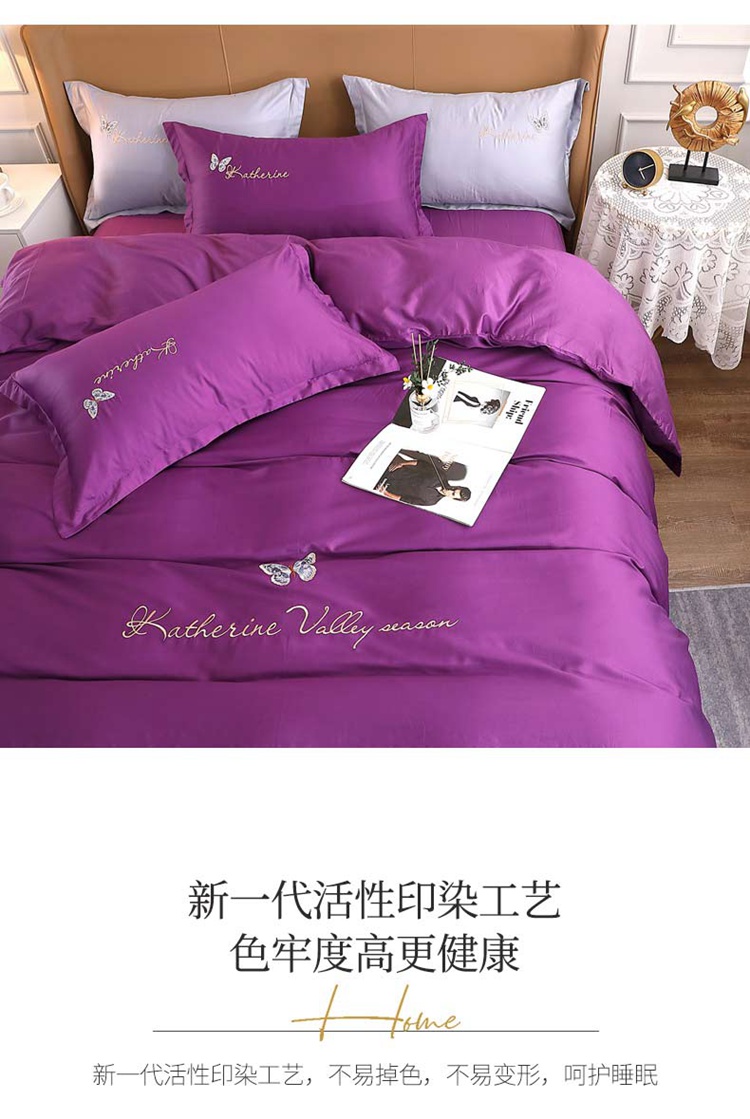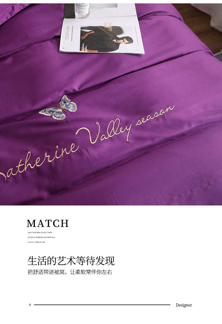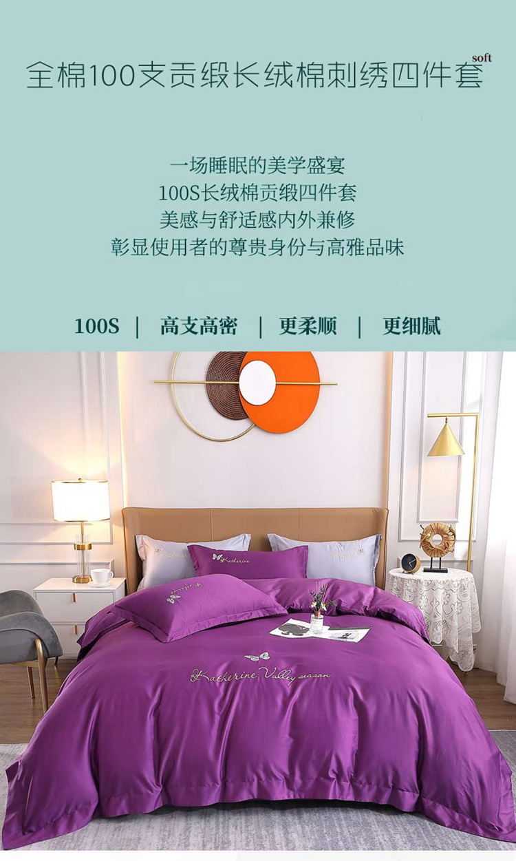 晶缦家纺 2022全棉双股50支双股贡缎长绒棉绣花四件套-蝶舞 高雅紫