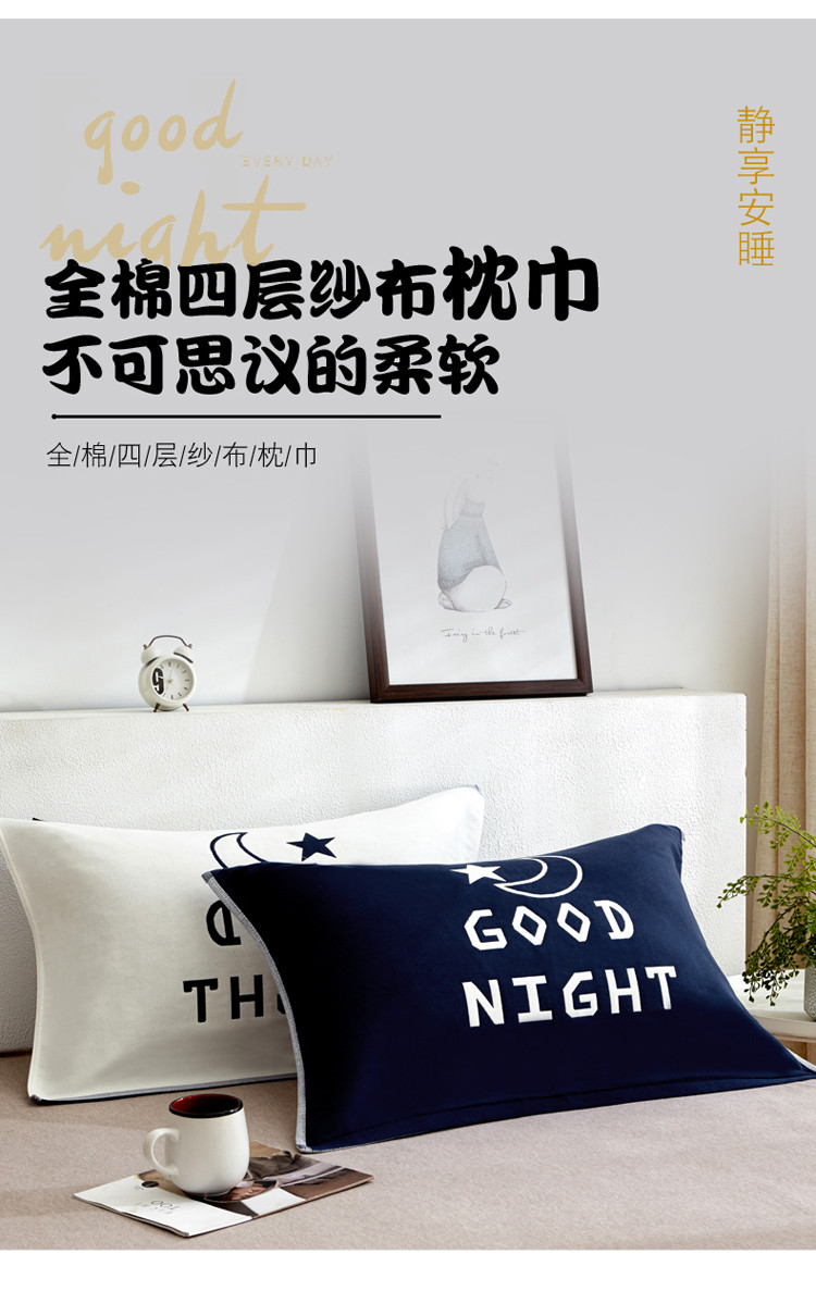 朴尔 2022新款全棉四层纱布大版花独版枕巾(一对) 晚安先生-藏青(50*80)