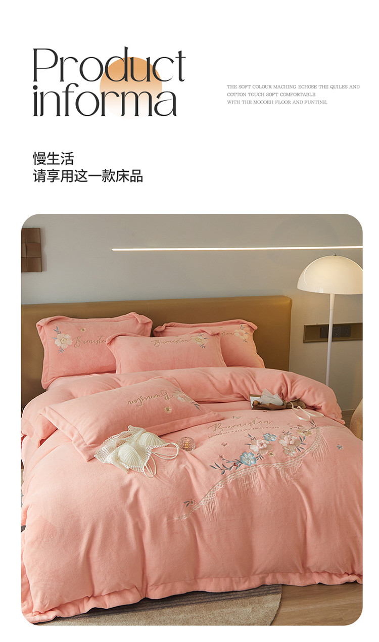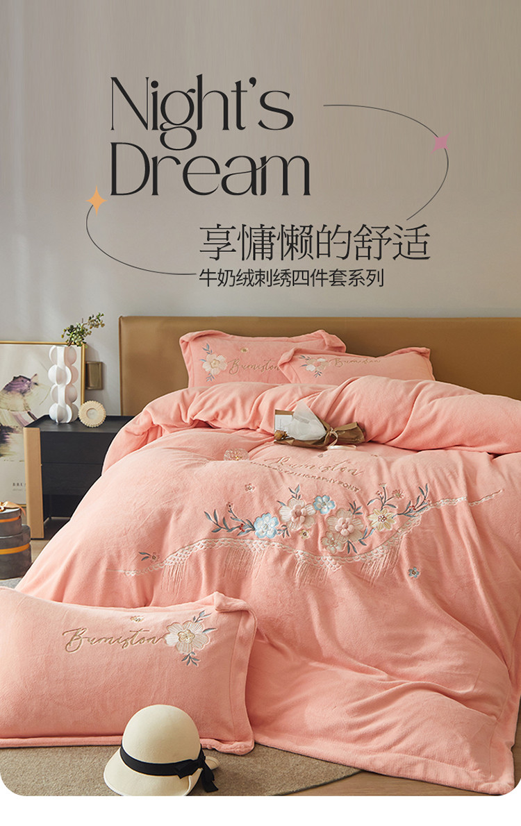 商品名称:名品优仓 新款230g牛奶绒刺绣四件套-贝拉花园 柔粉