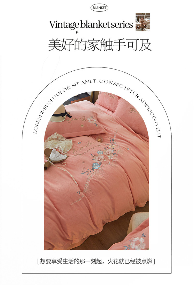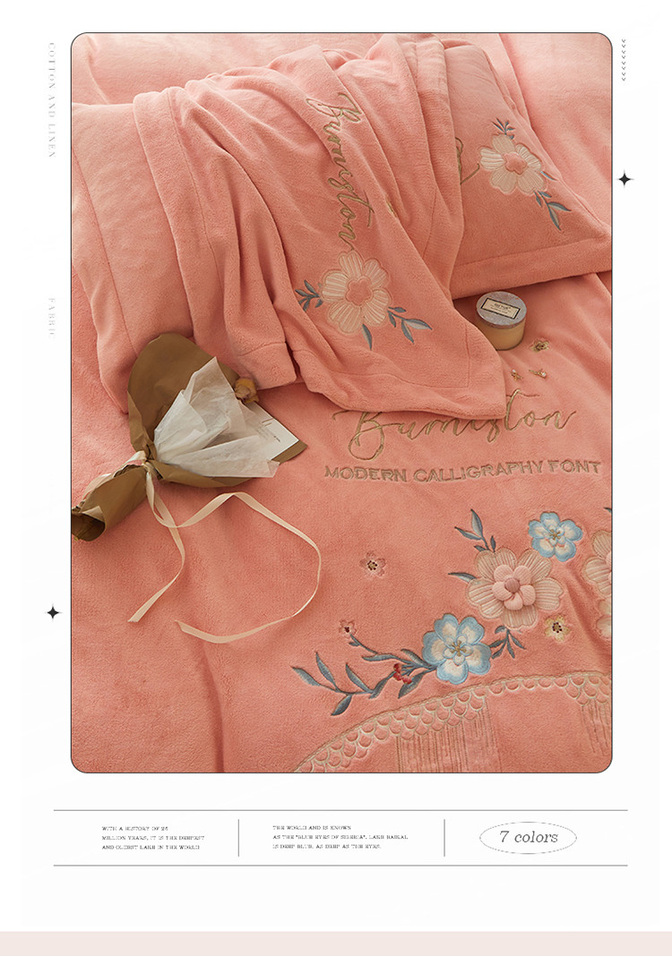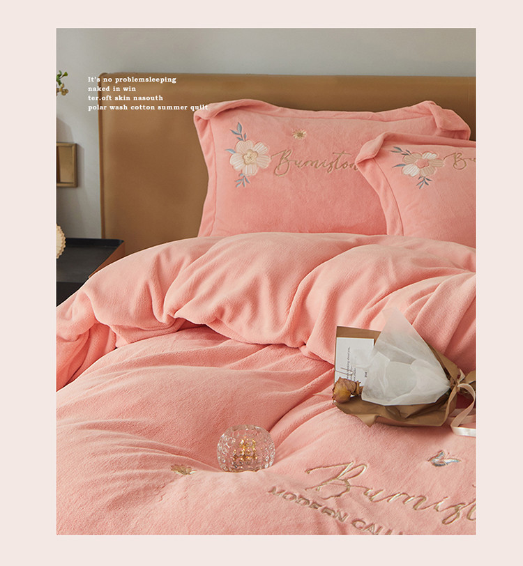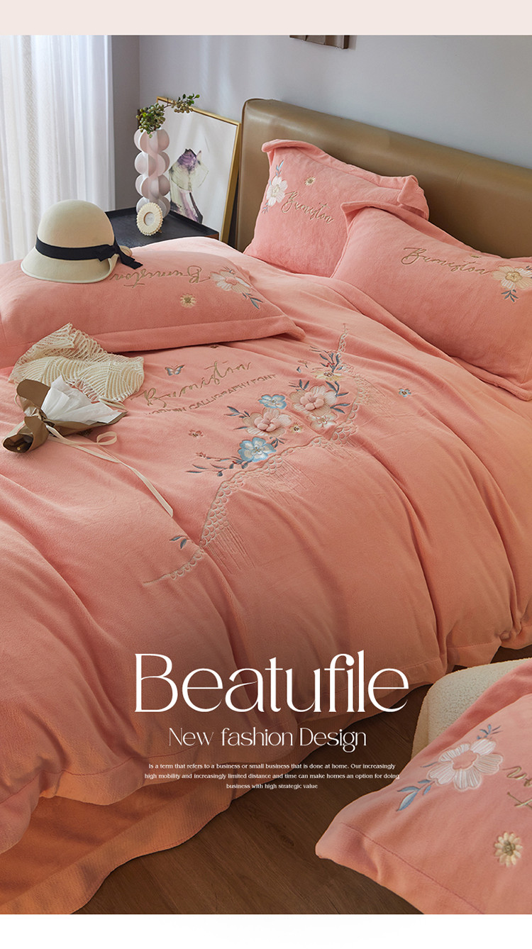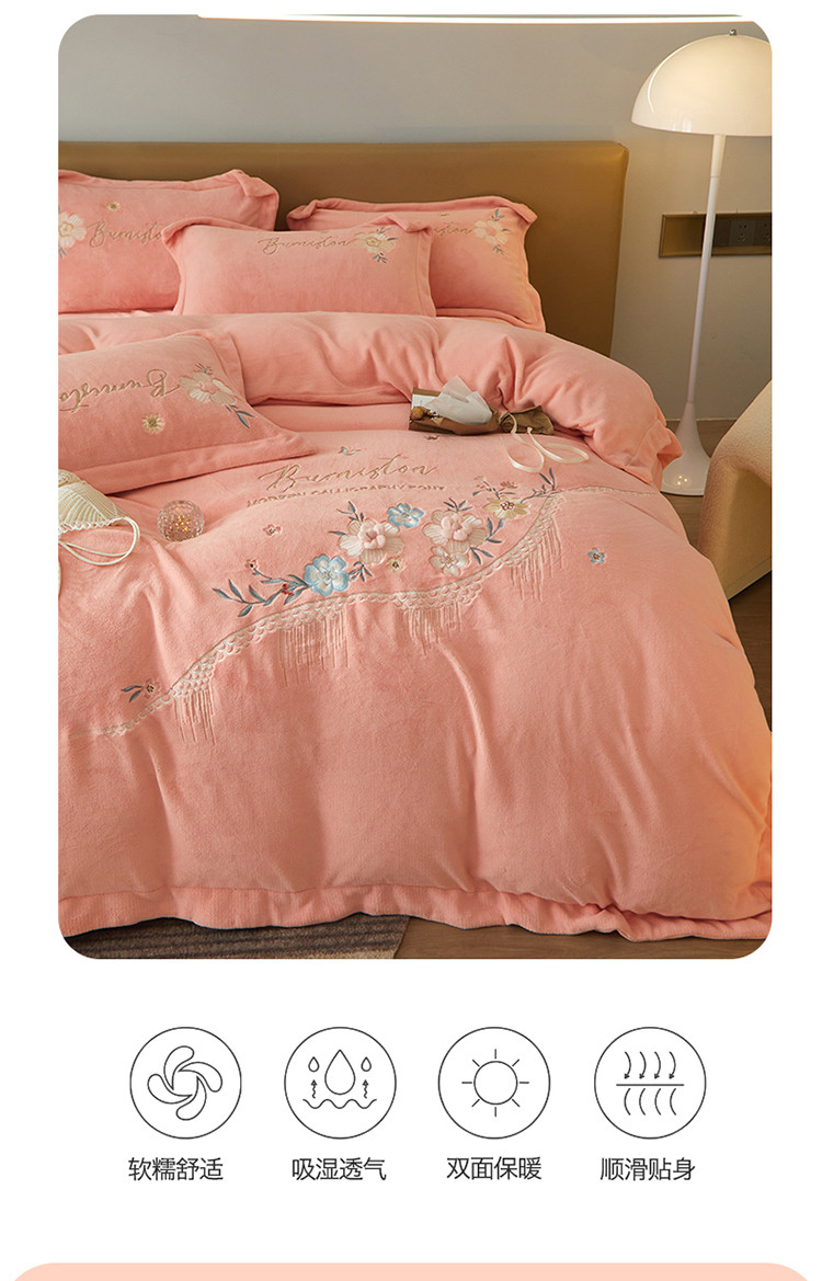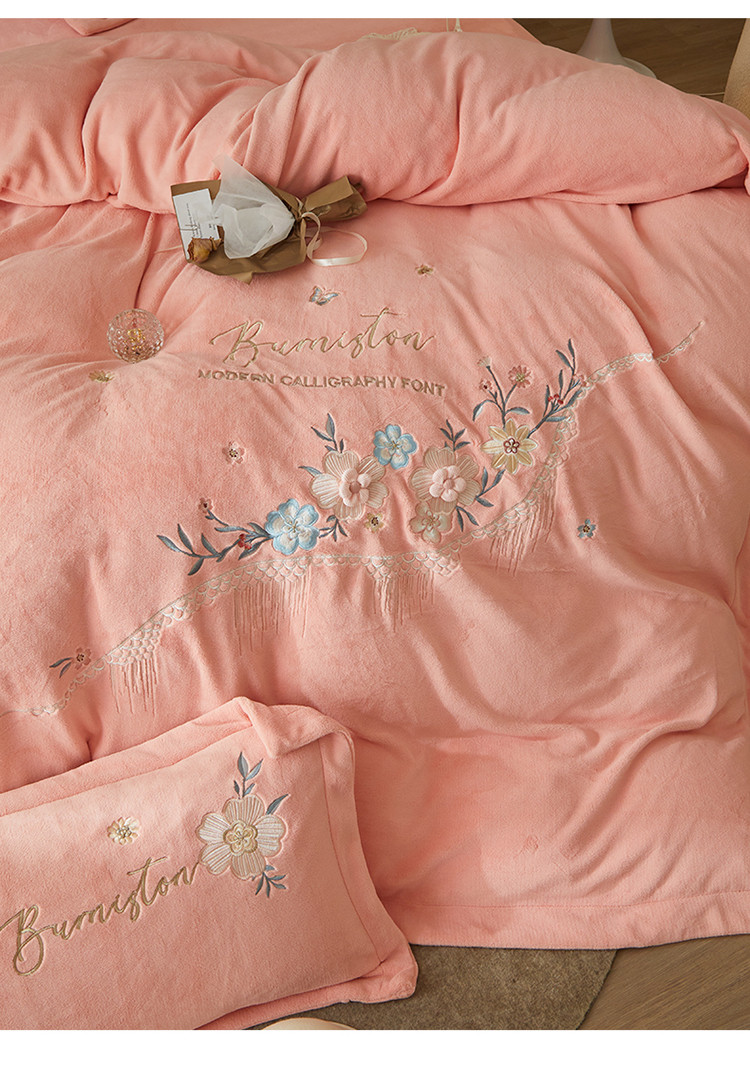 名品优仓 新款230g牛奶绒刺绣四件套-贝拉花园 柔粉