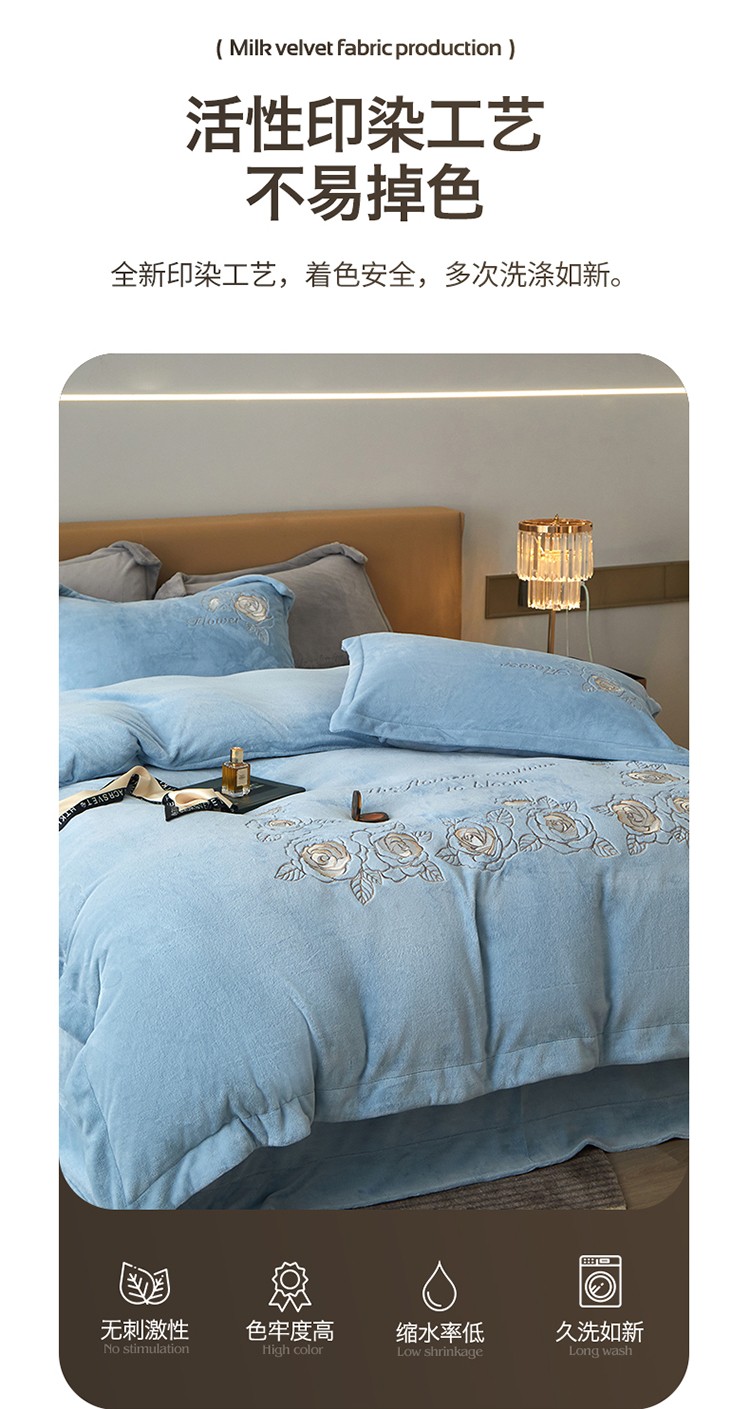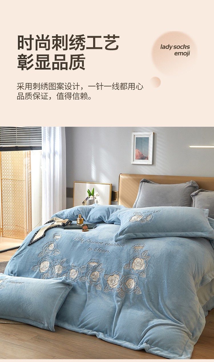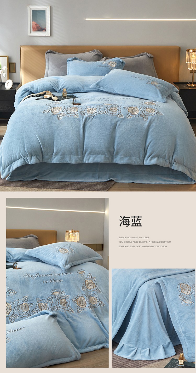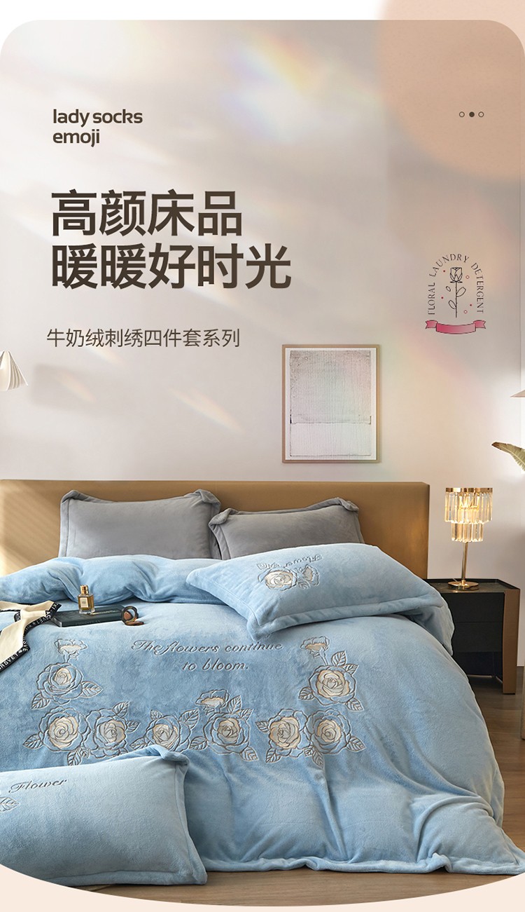 商品名称:名品优仓2022新款牛奶绒刺绣四件套-花恋 海蓝