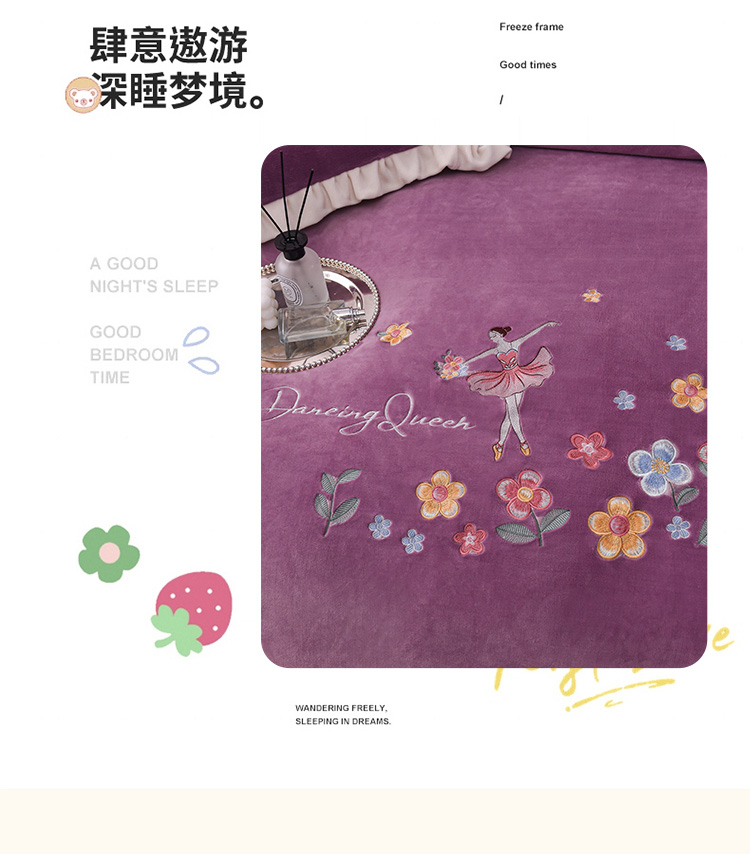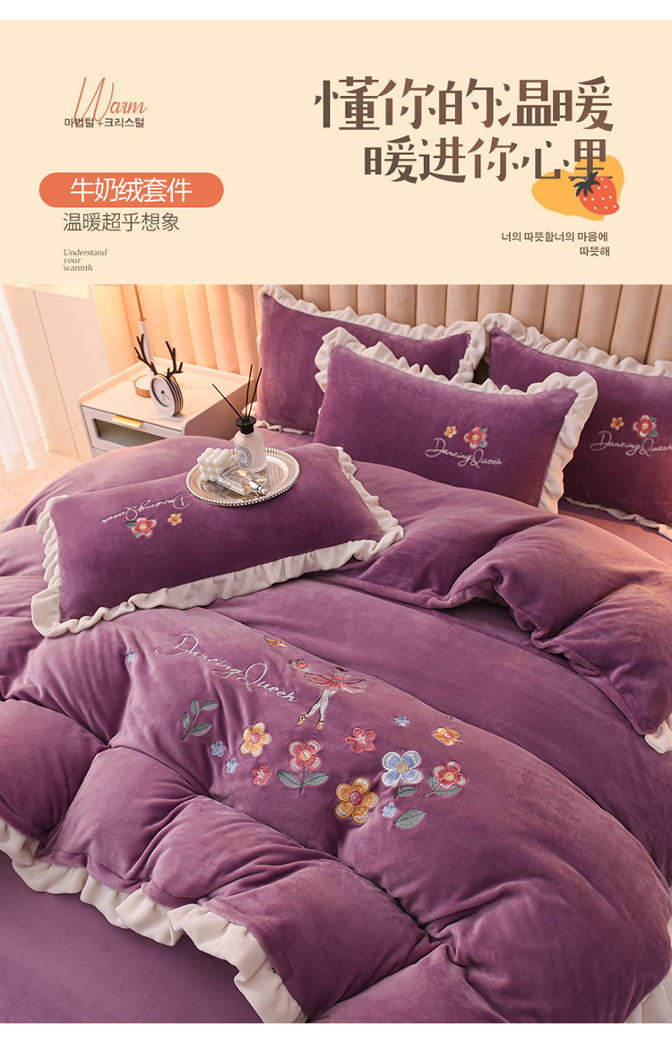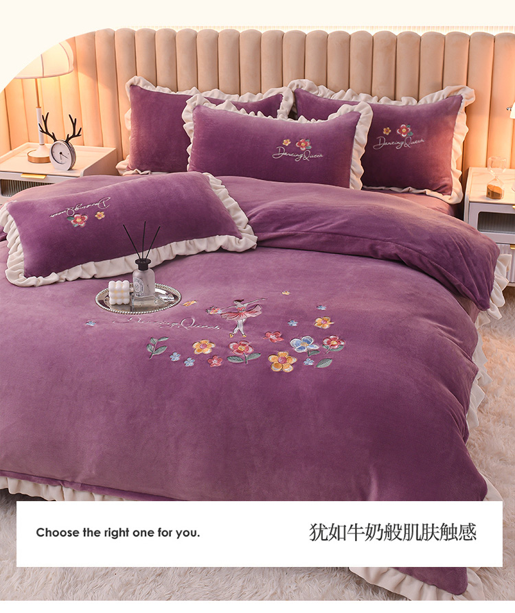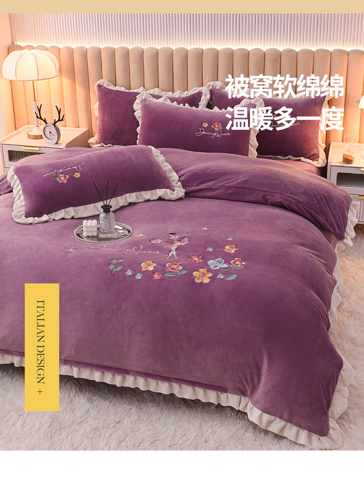 芃成 2022新款加厚保暖牛奶绒绣花四件套 芭蕾女孩 玫瑰紫
