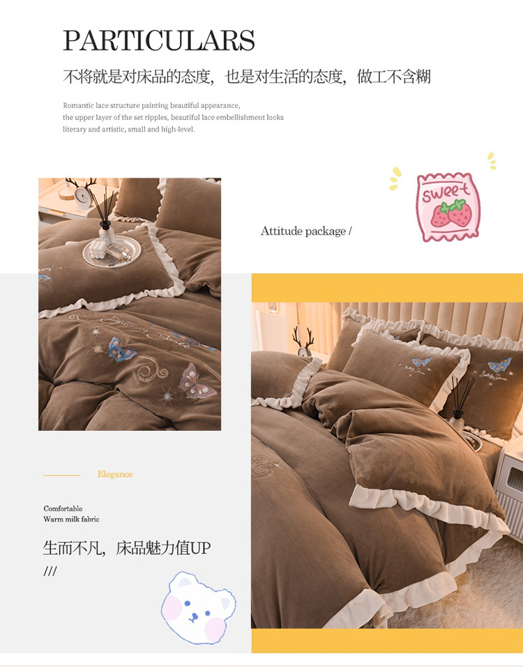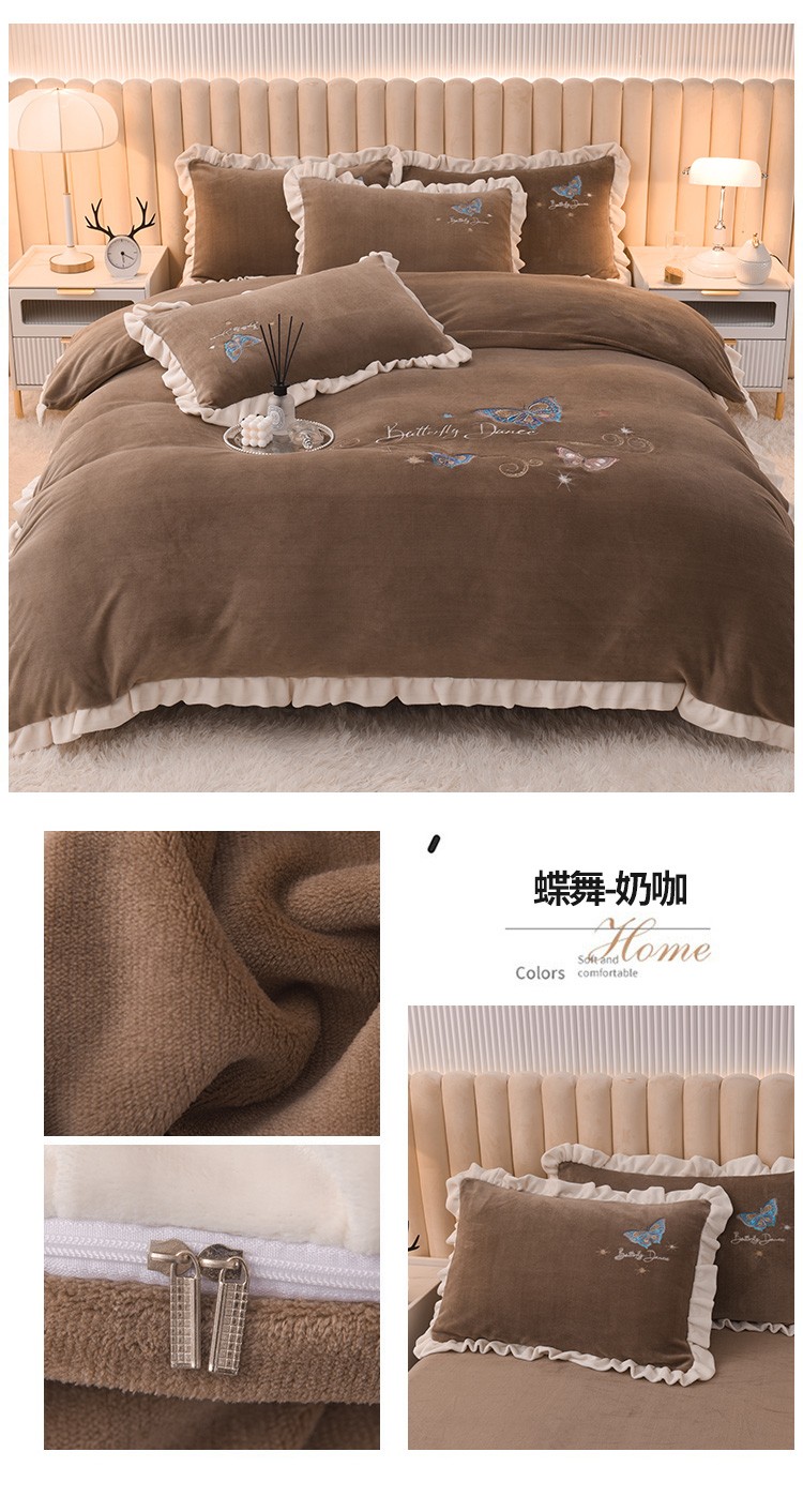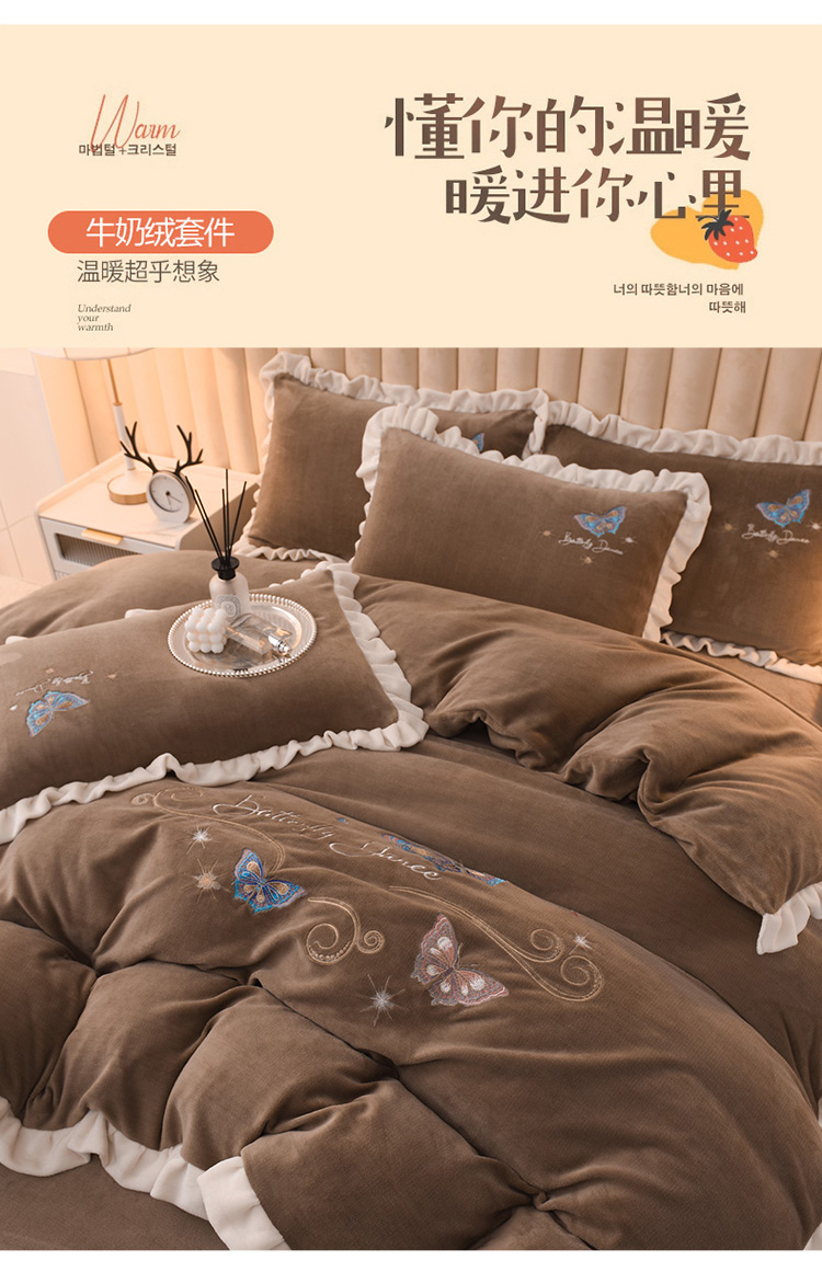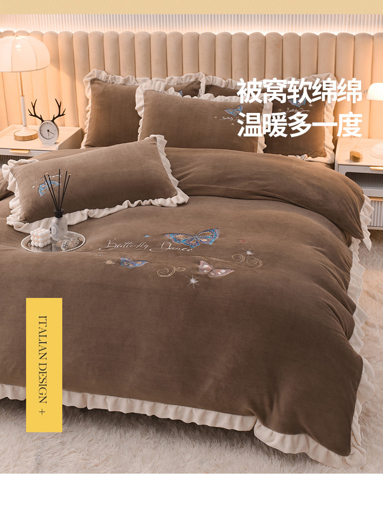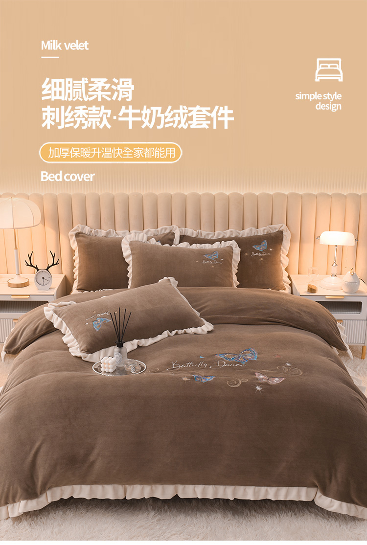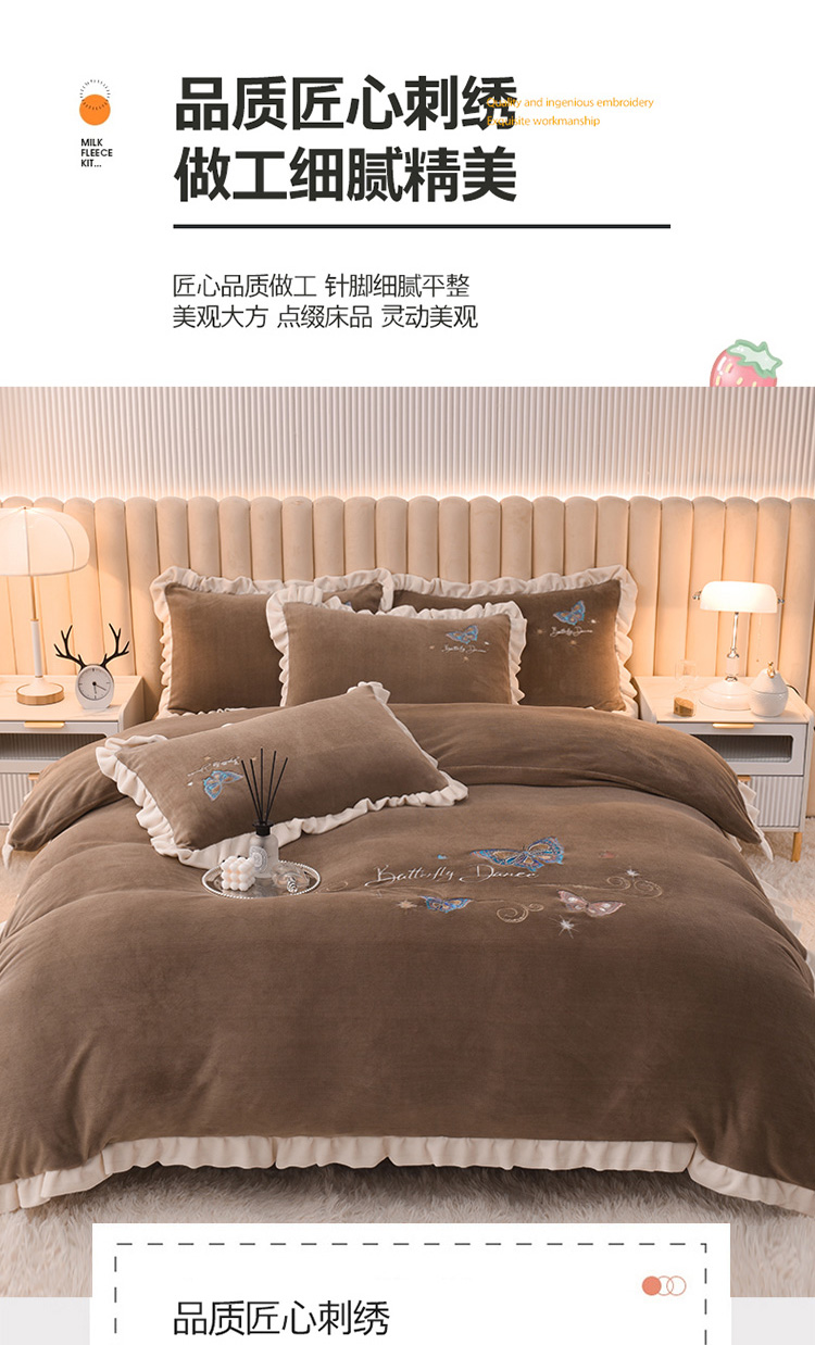 商品名称:芃成 2022新款加厚保暖牛奶绒绣花四件套 蝶舞 奶咖