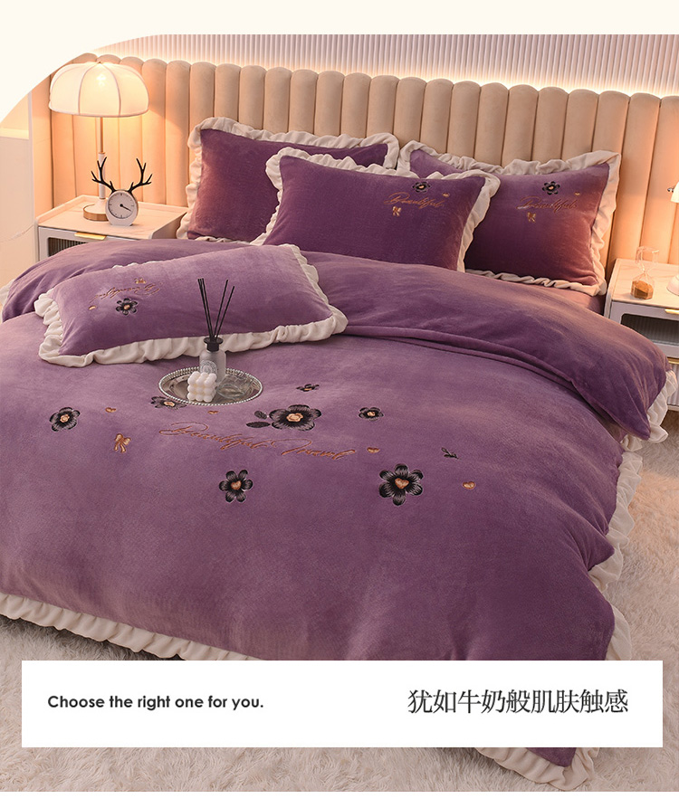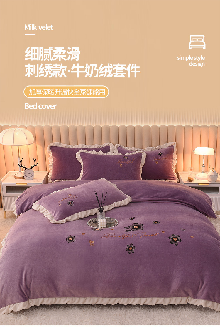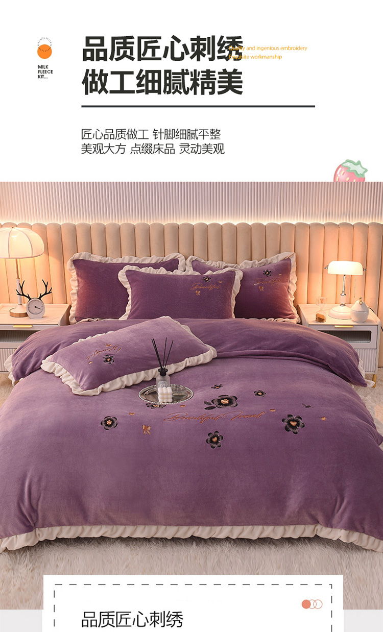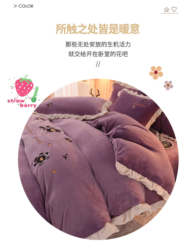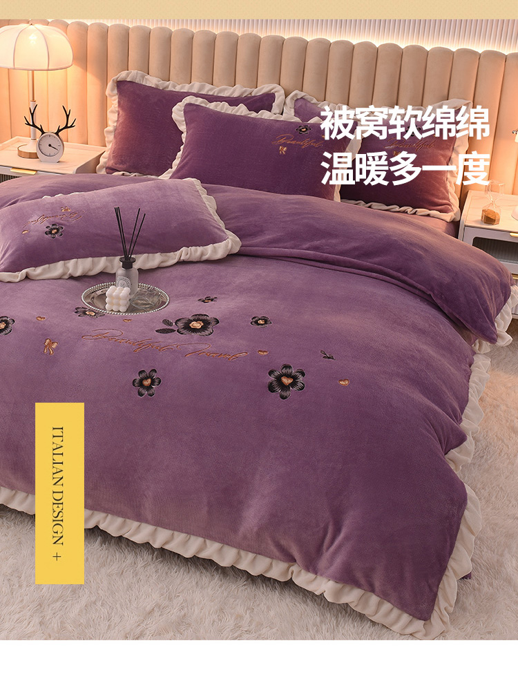 芃成 2022新款加厚保暖牛奶绒绣花四件套 花漾 玫瑰紫