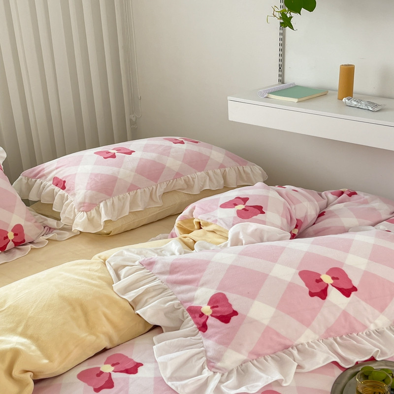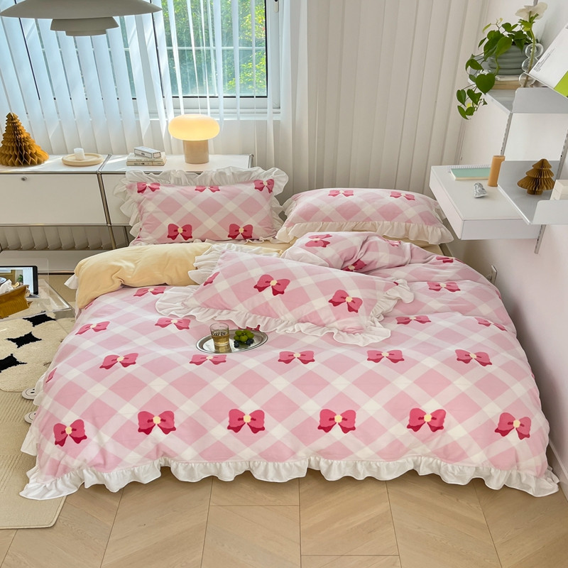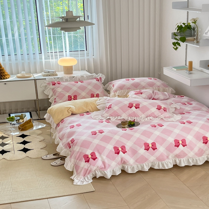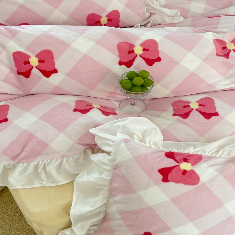 昔可 2022新款花边牛奶绒四件套 菱格蝴蝶结粉