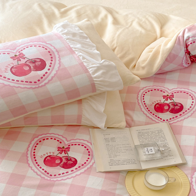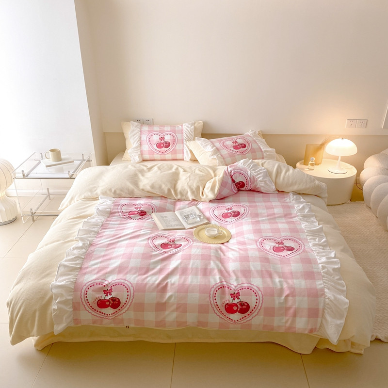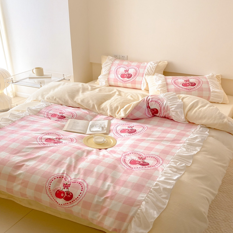 昔可 2022新款数码印花花边款牛奶绒四件套 粉格樱桃