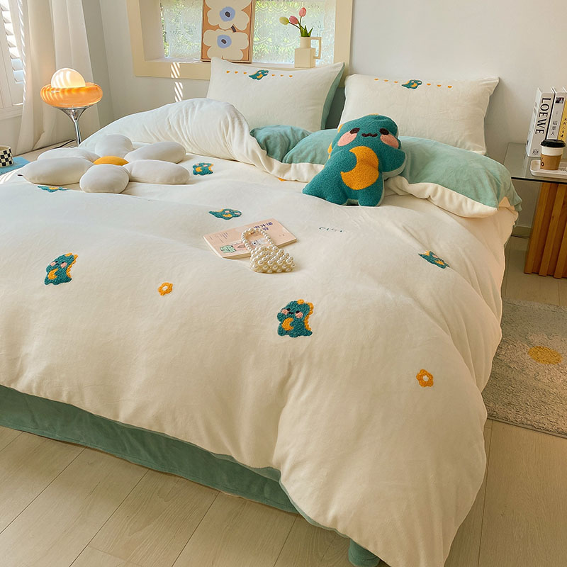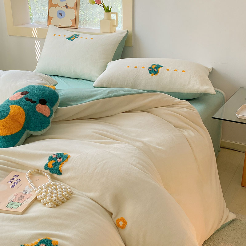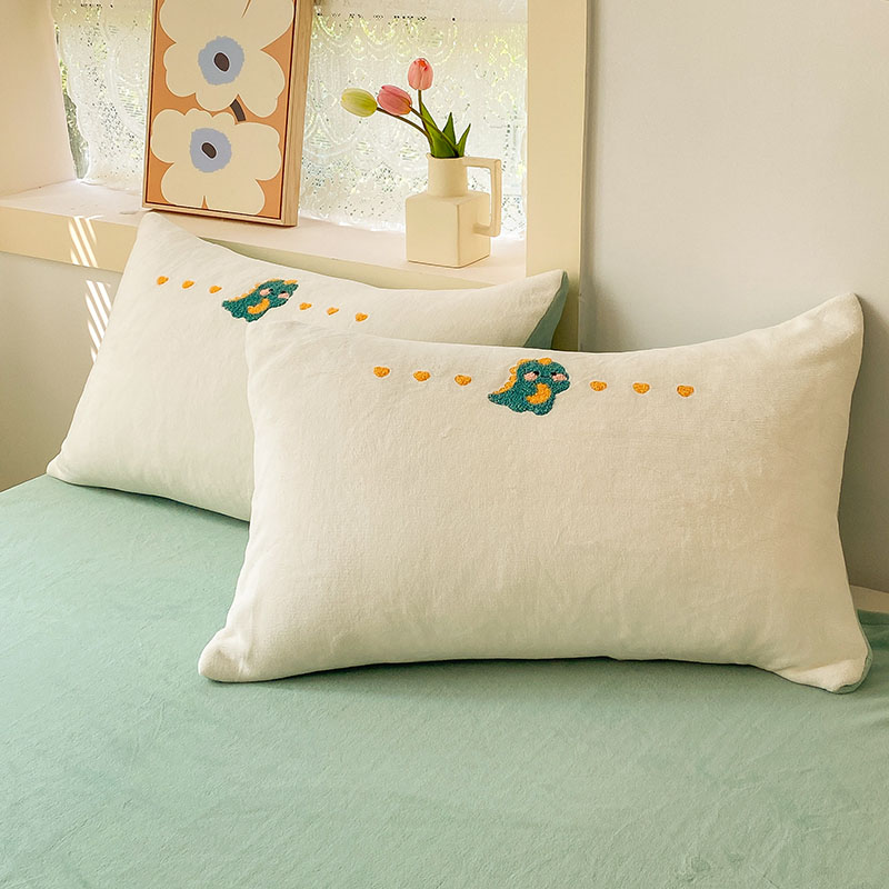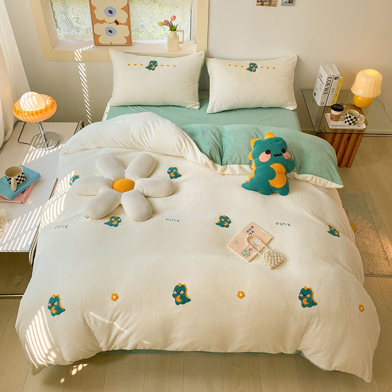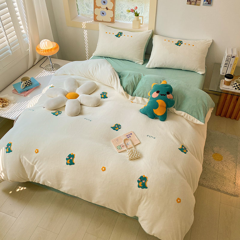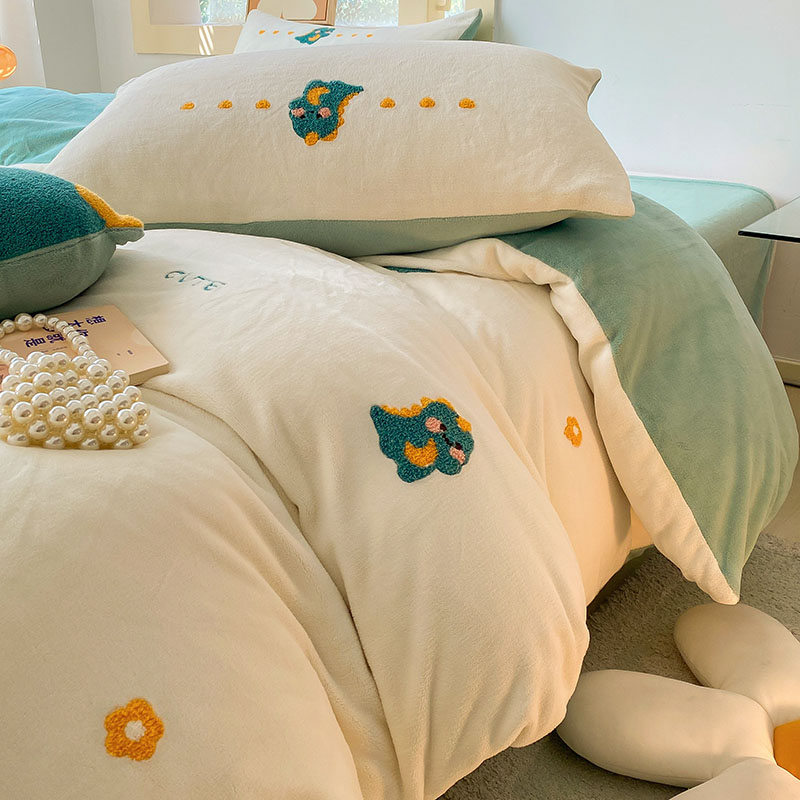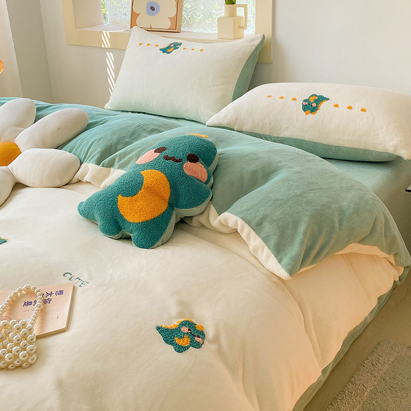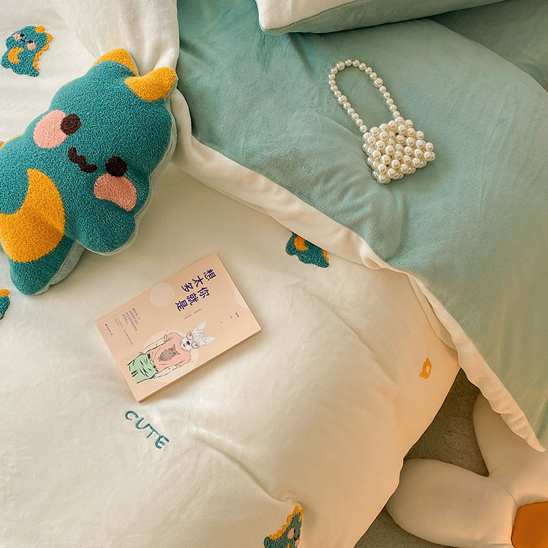 商品名称:寐居2022新款毛巾绣牛奶绒单被套 萌宠恐龙-绿