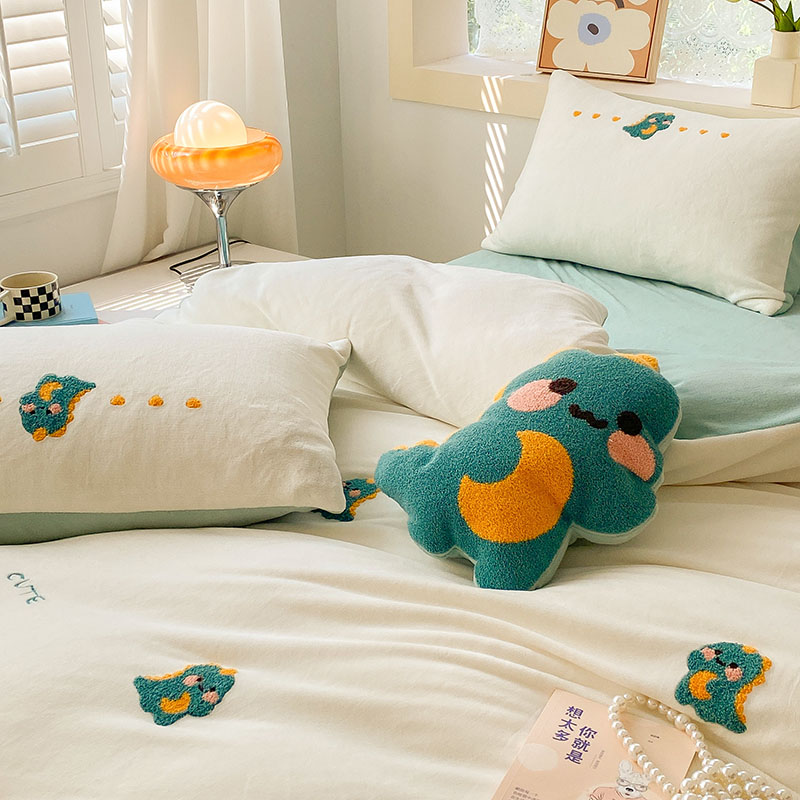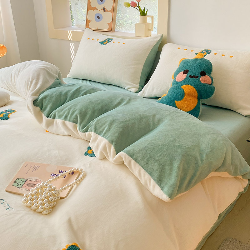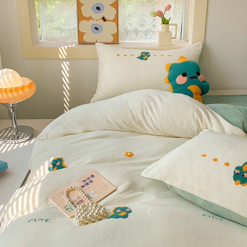 寐居2022新款毛巾绣牛奶绒单被套 萌宠恐龙-绿