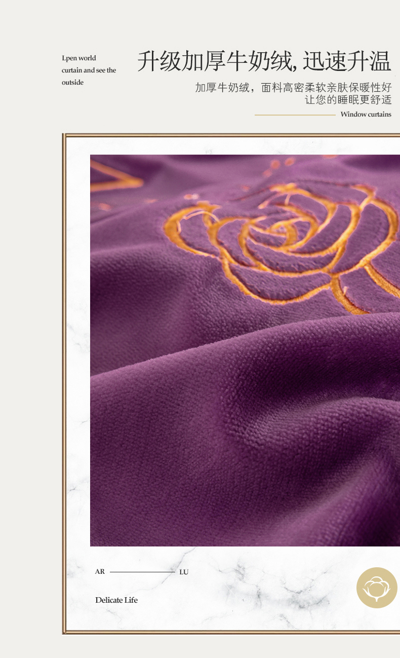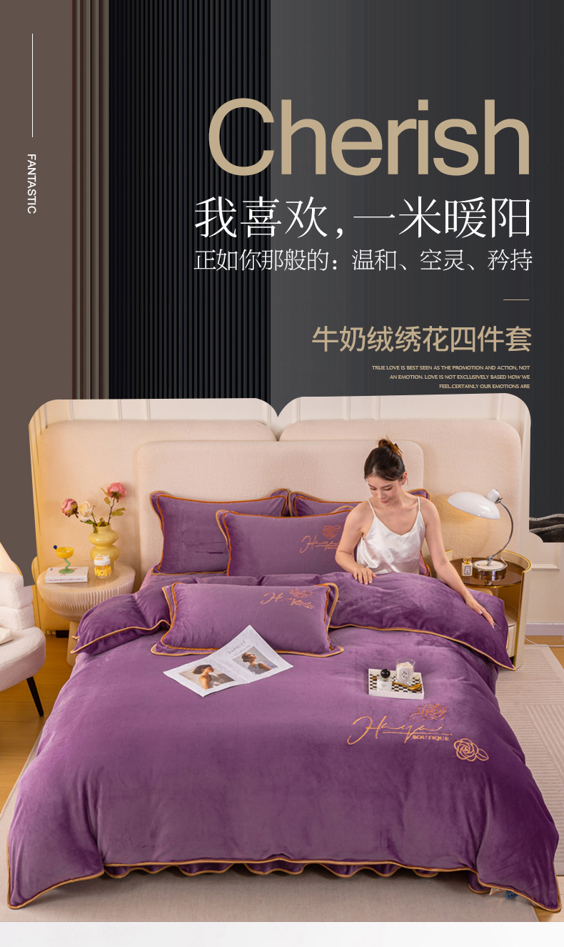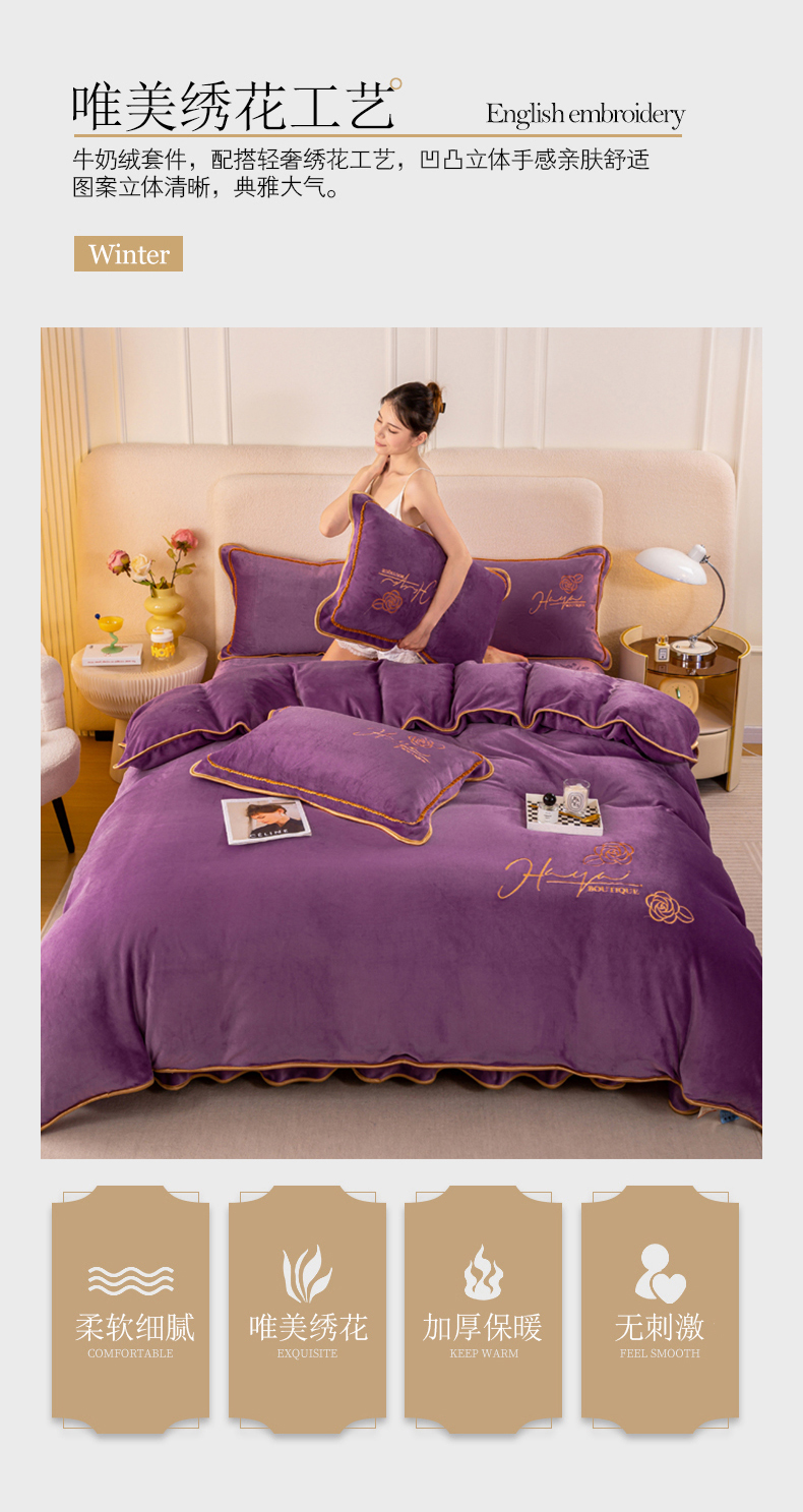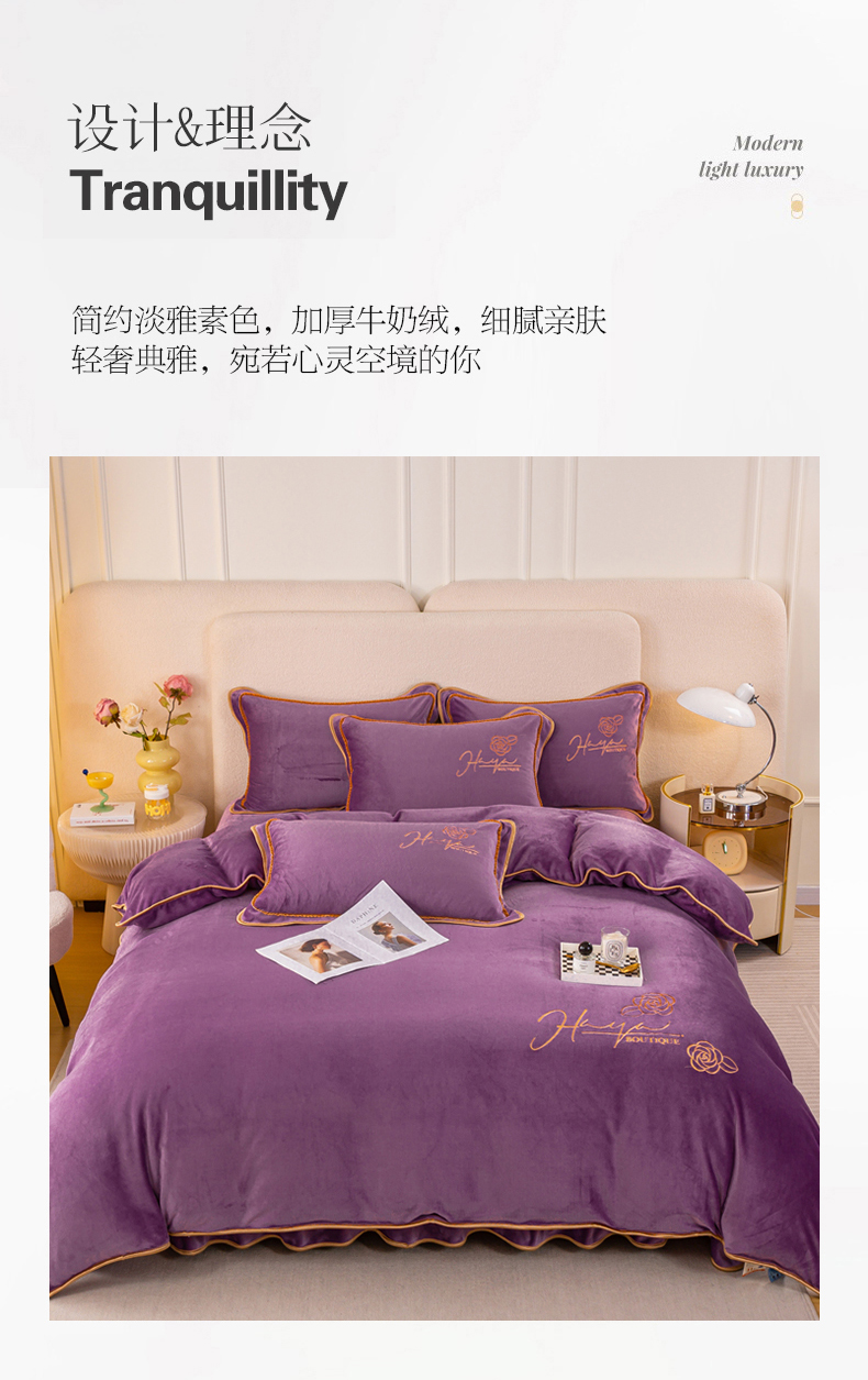 博兰蒂 2025秋冬新款高克重纯色牛奶绒床裙款四件套墨紫,墨紫