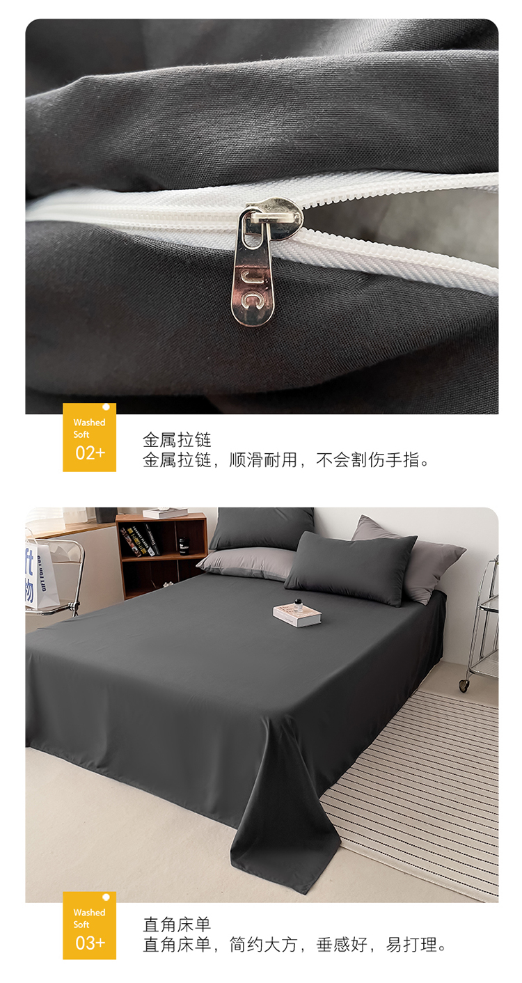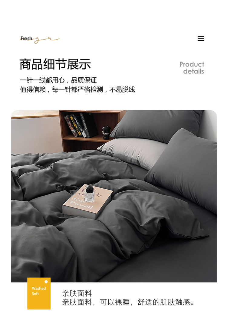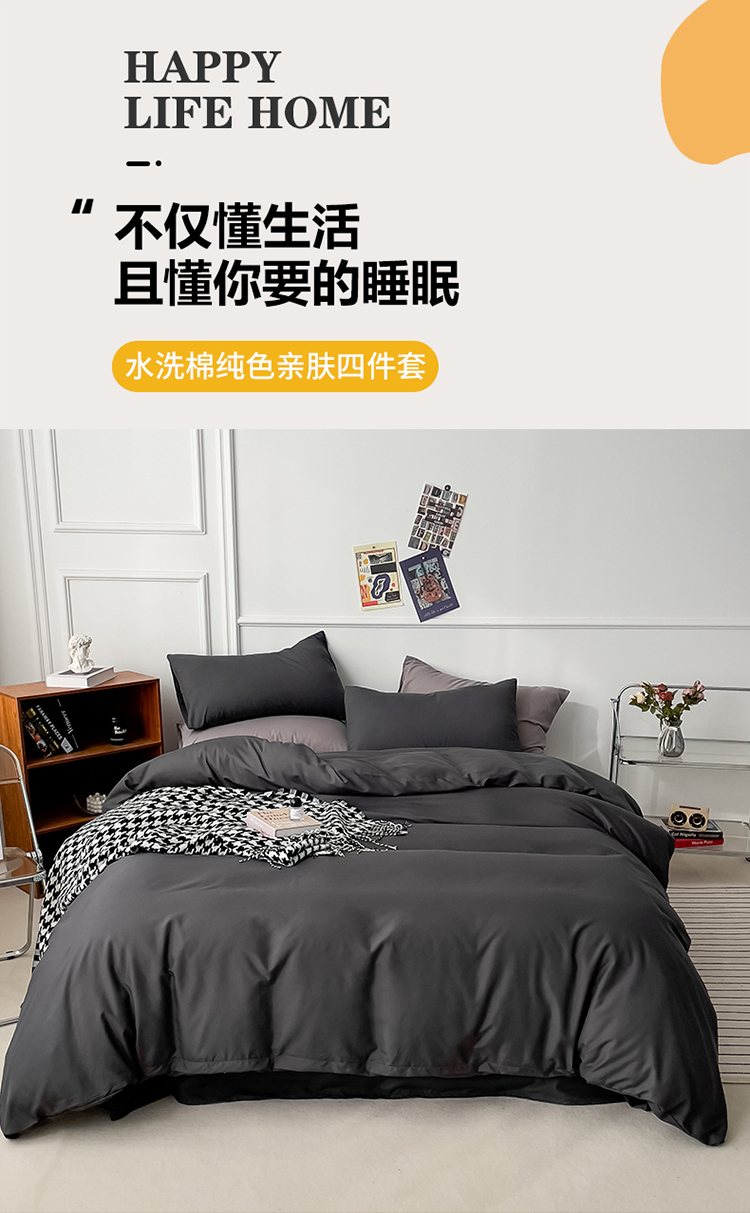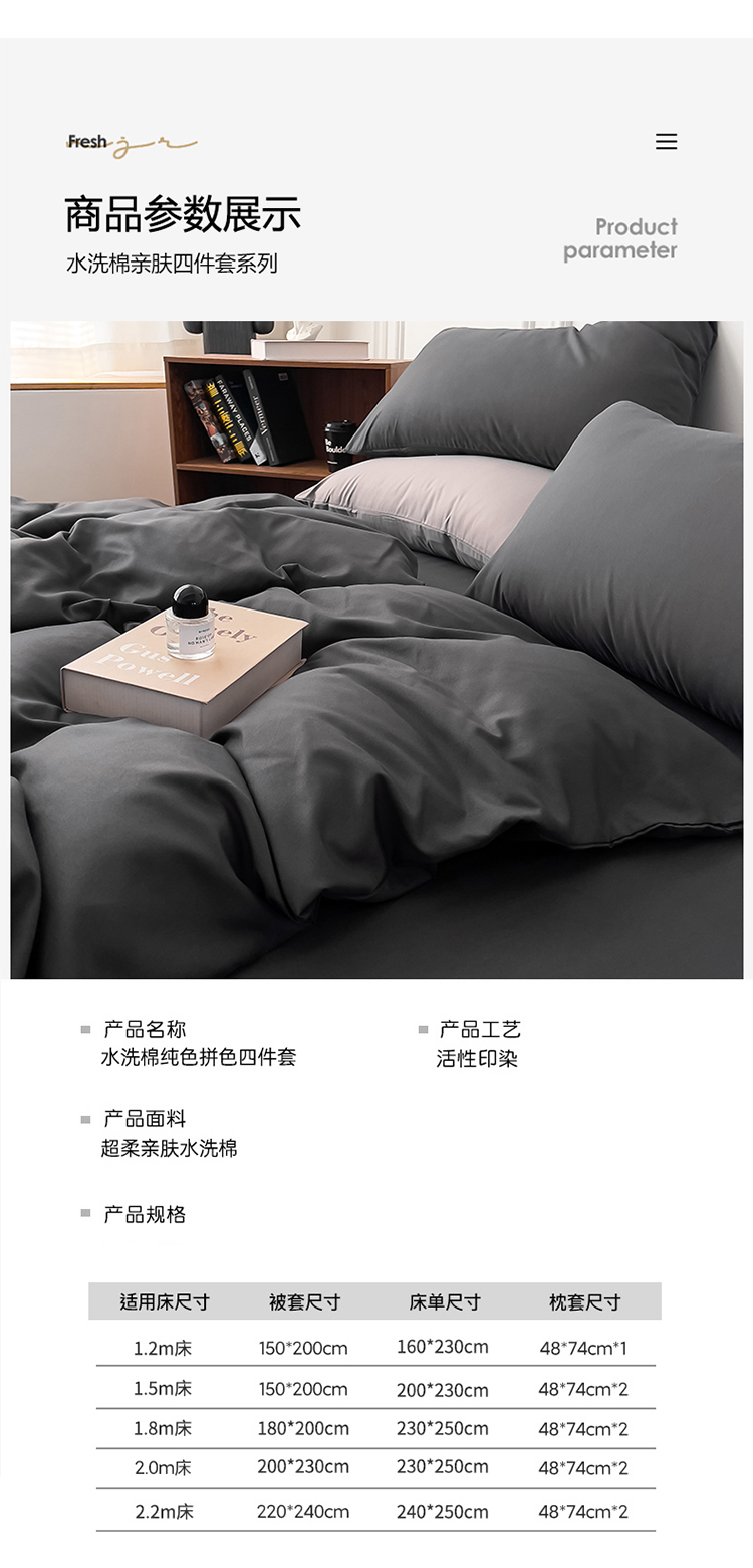 商品名称:棠颂 2023春夏新款水洗棉亲肤纯色双拼四件套 深灰