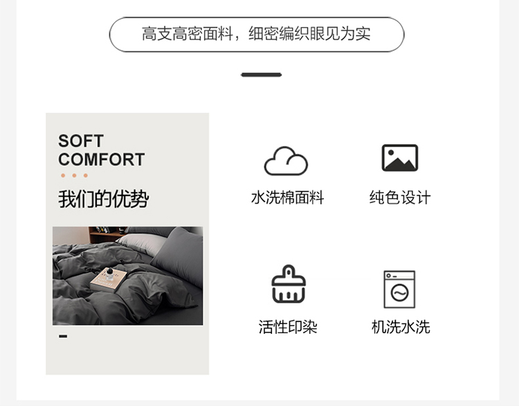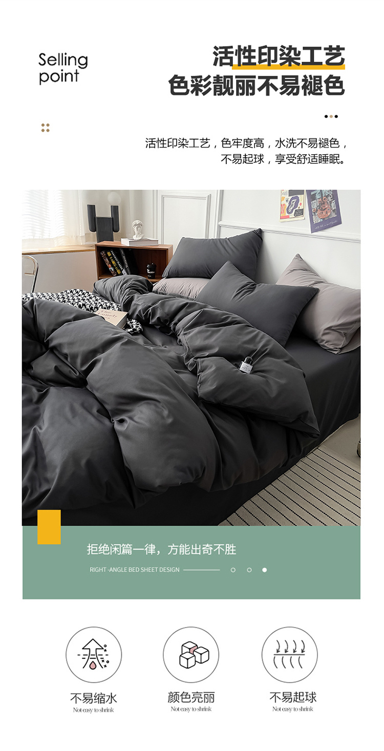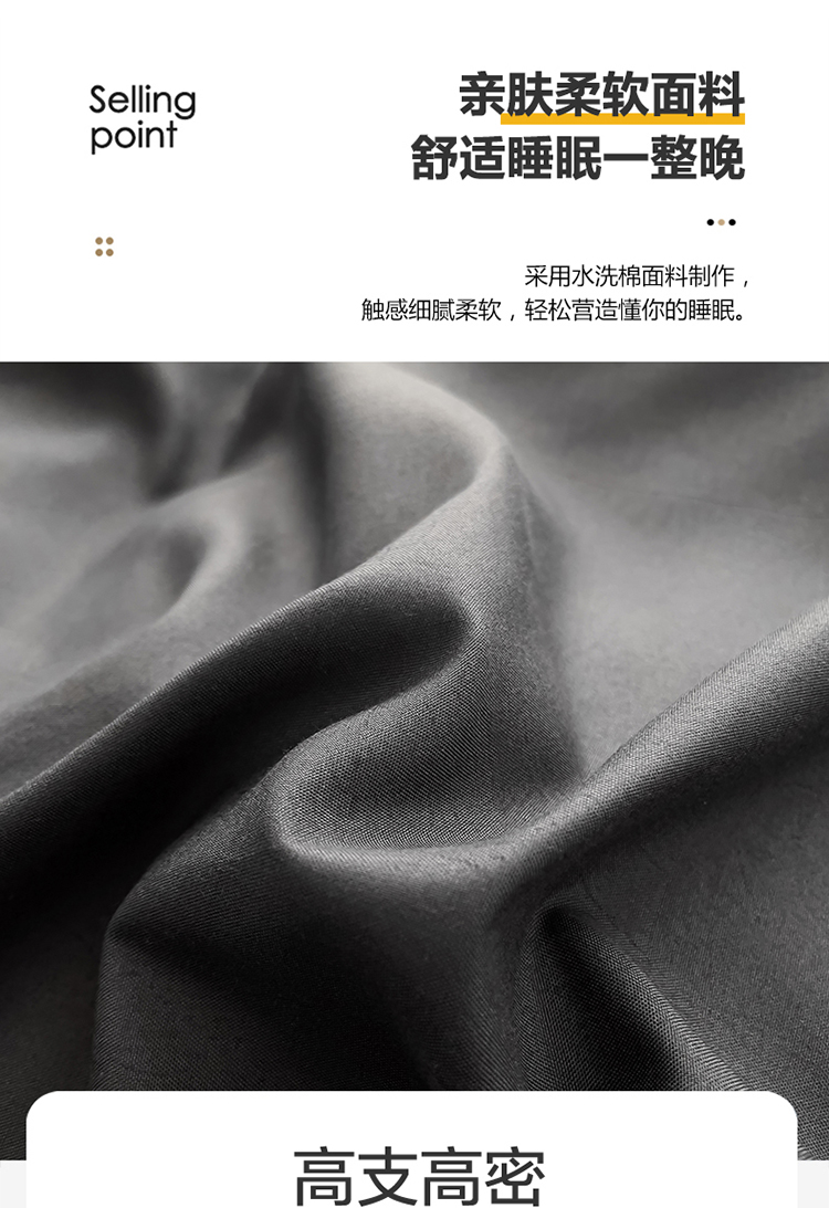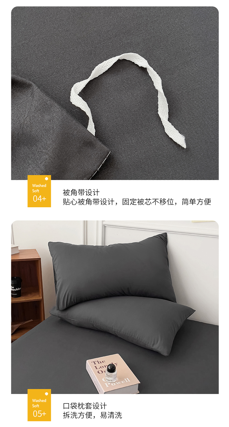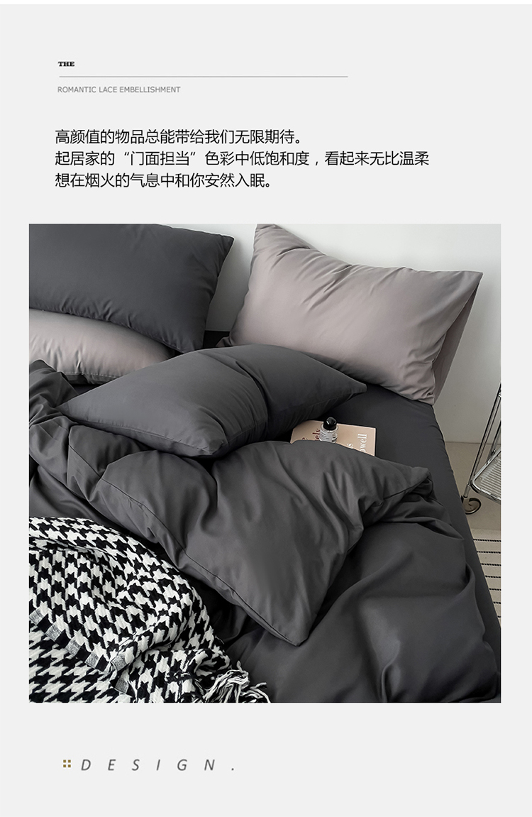 商品名称:棠颂 2023春夏新款水洗棉亲肤纯色双拼四件套 深灰