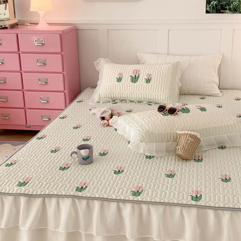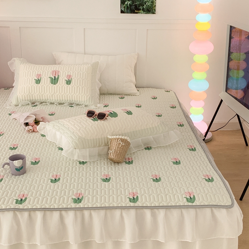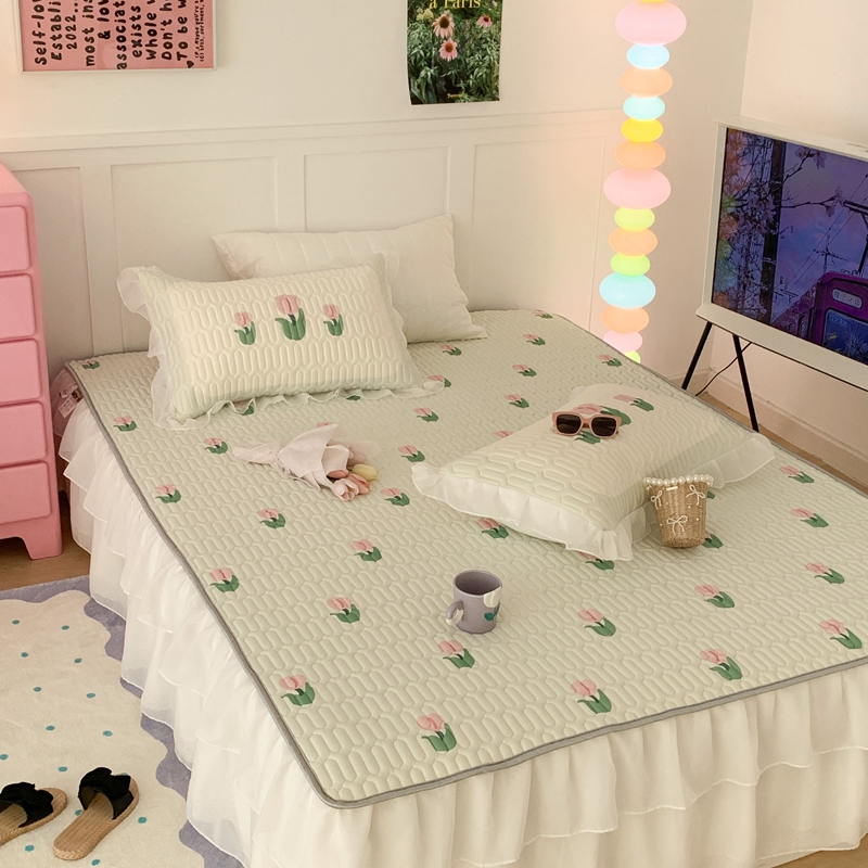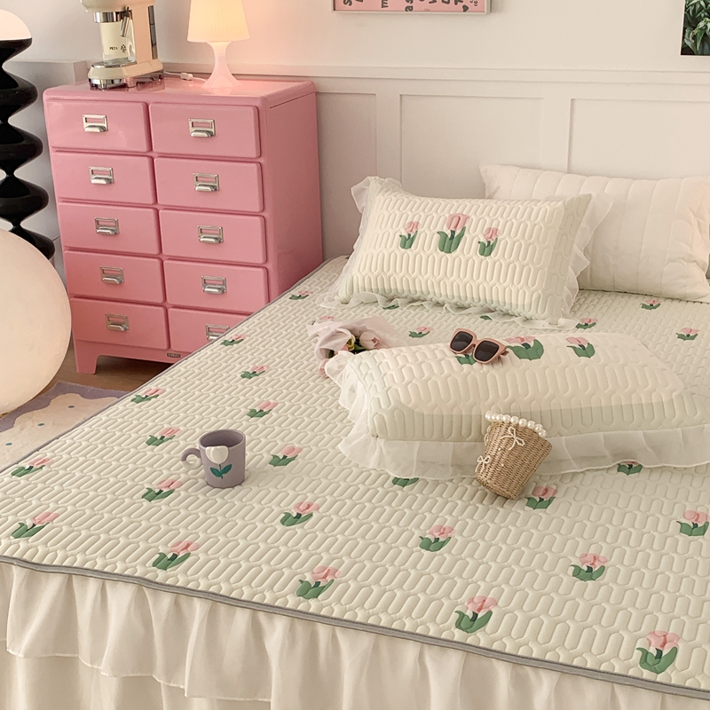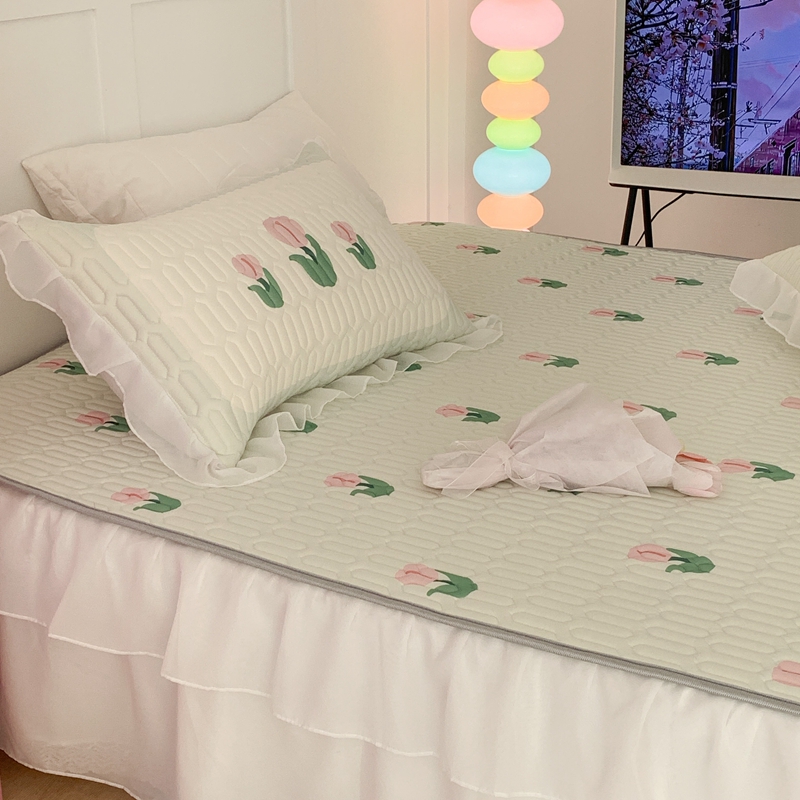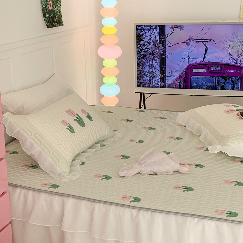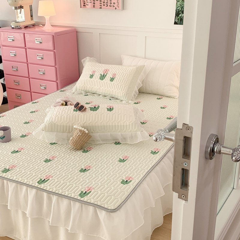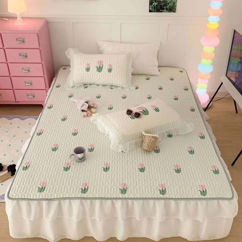 昔可家纺 2023新款双层雪纺纱乳胶床裙 淡绿底郁金香