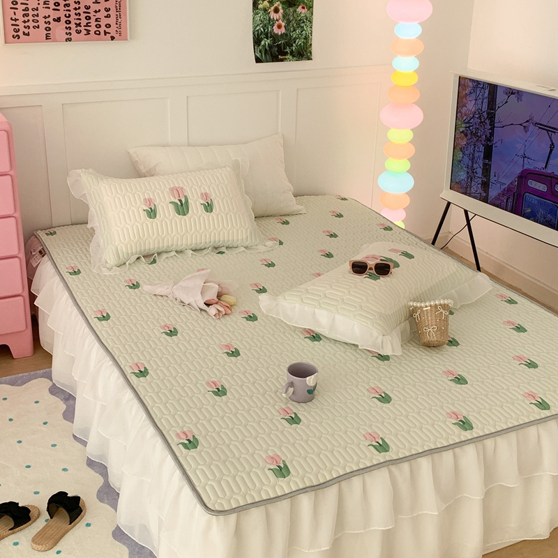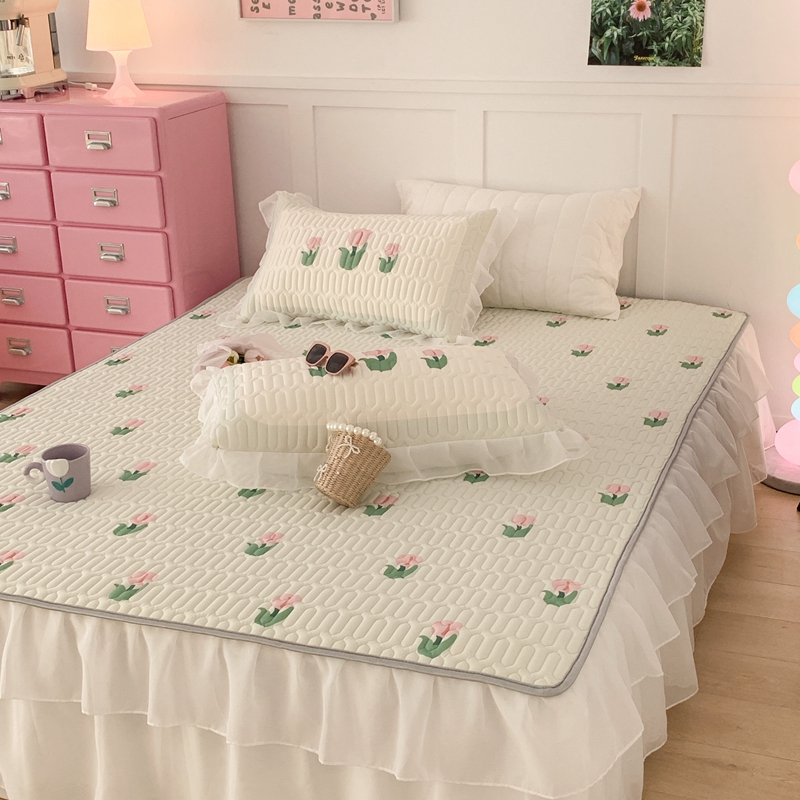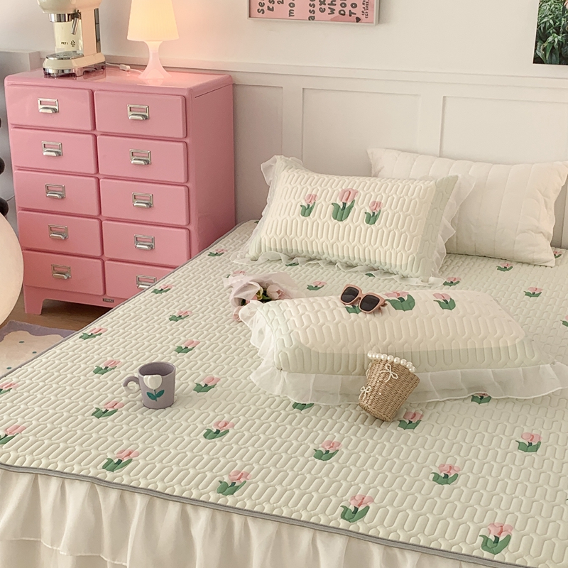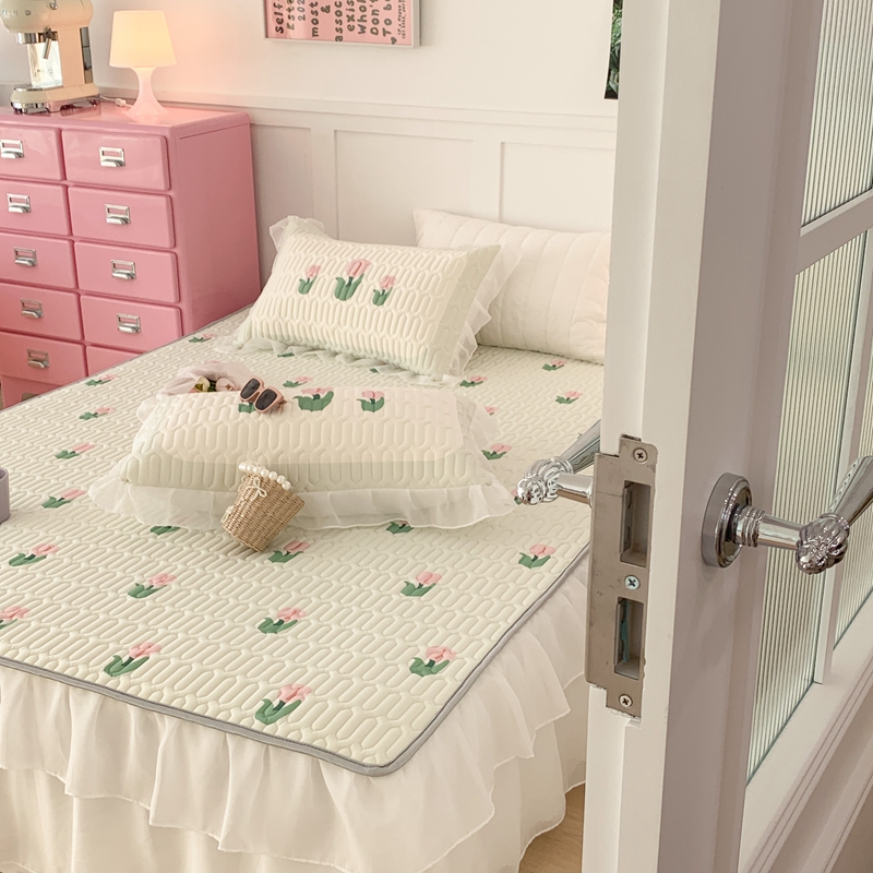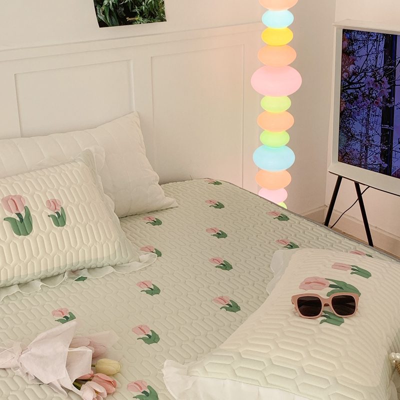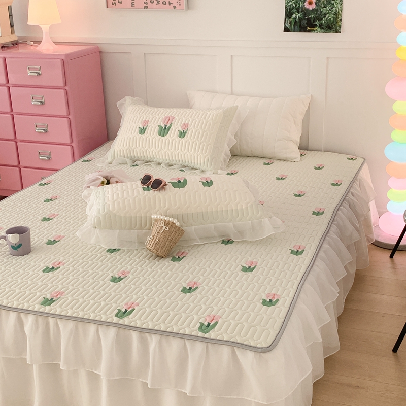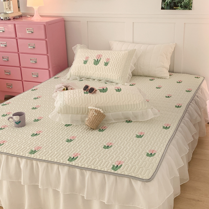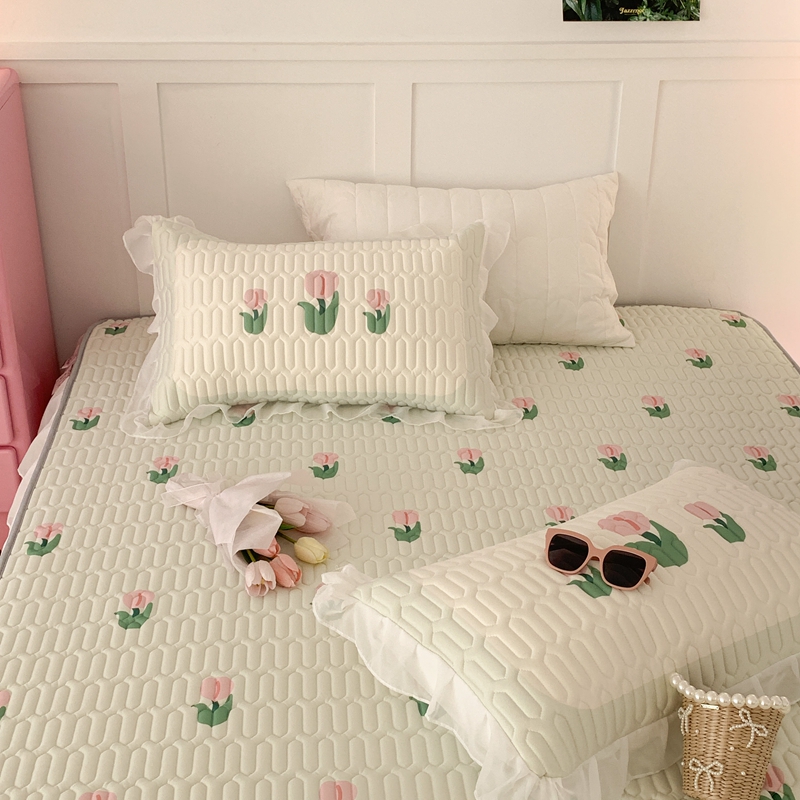 昔可家纺 2023新款双层雪纺纱乳胶床裙 淡绿底郁金香