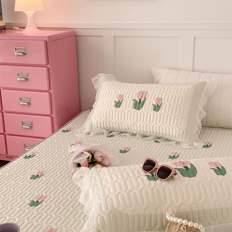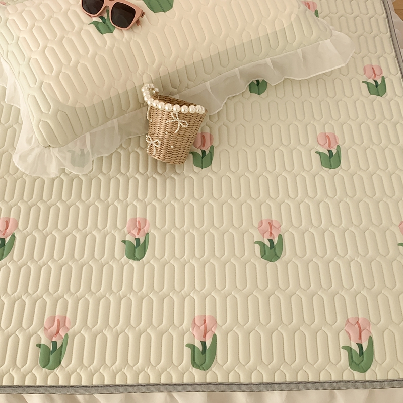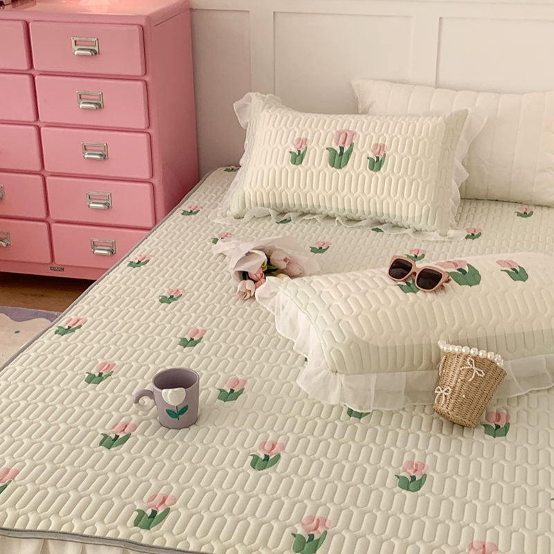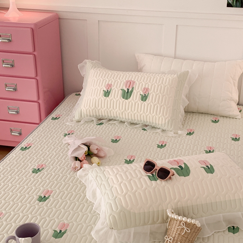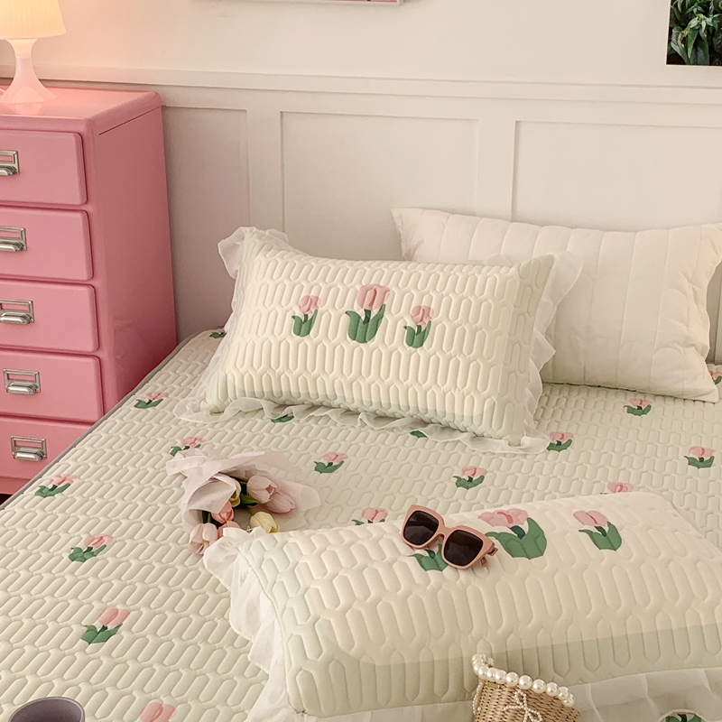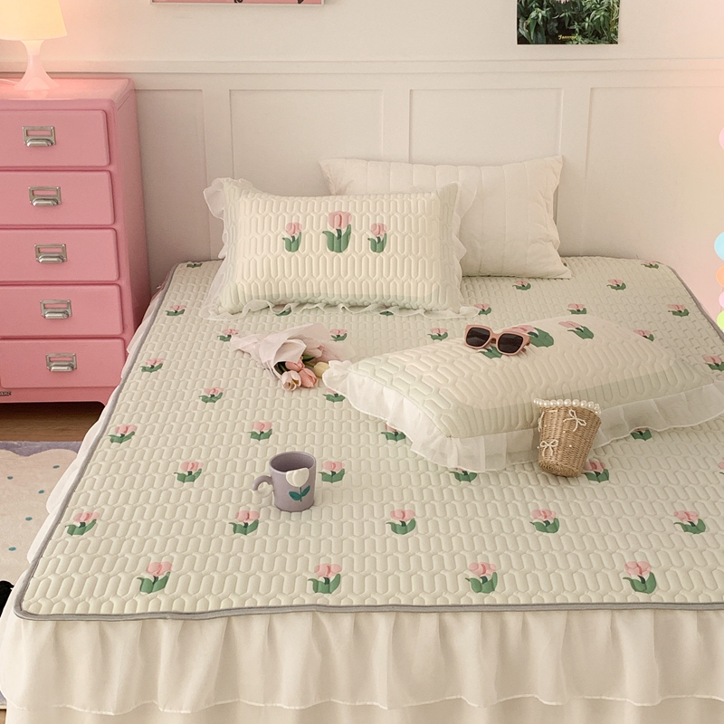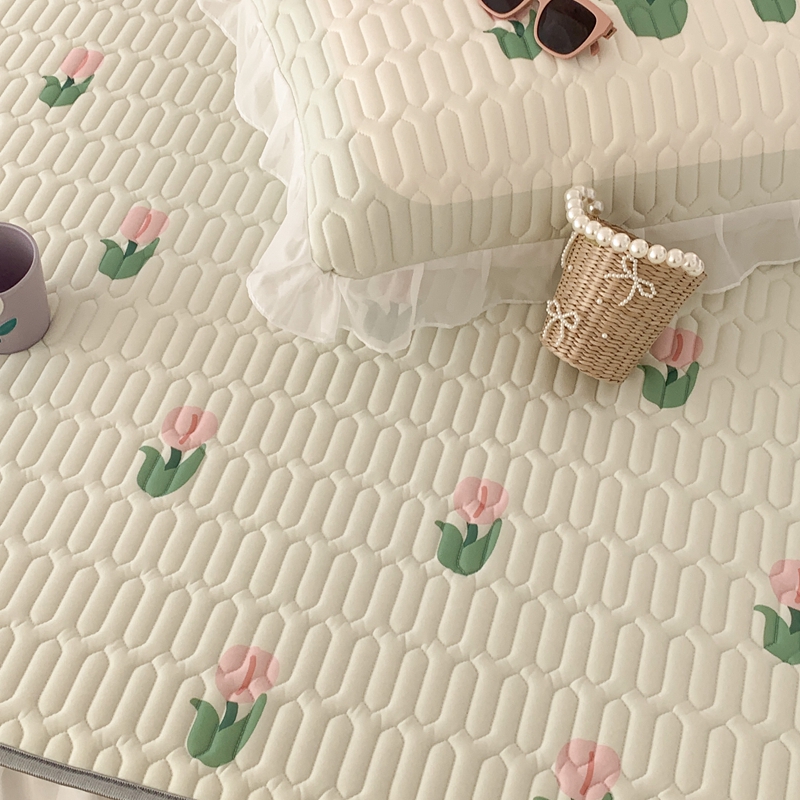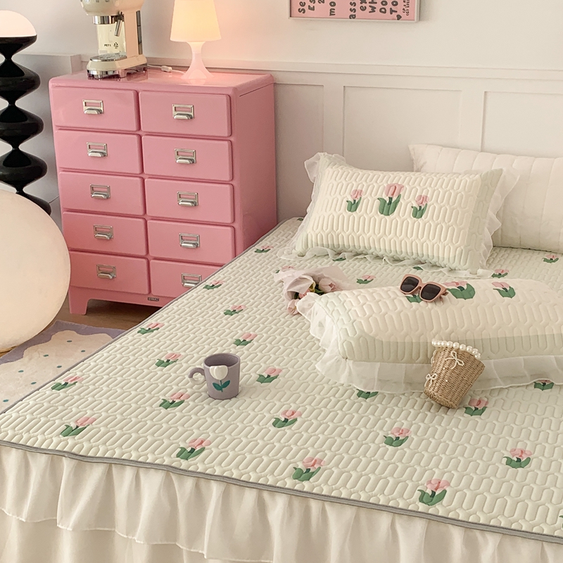 昔可家纺 2023新款双层雪纺纱乳胶床裙 淡绿底郁金香
