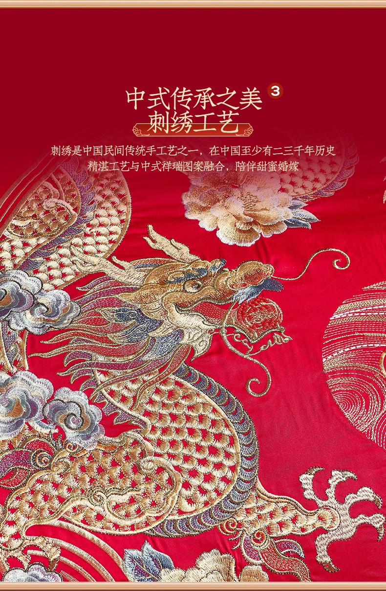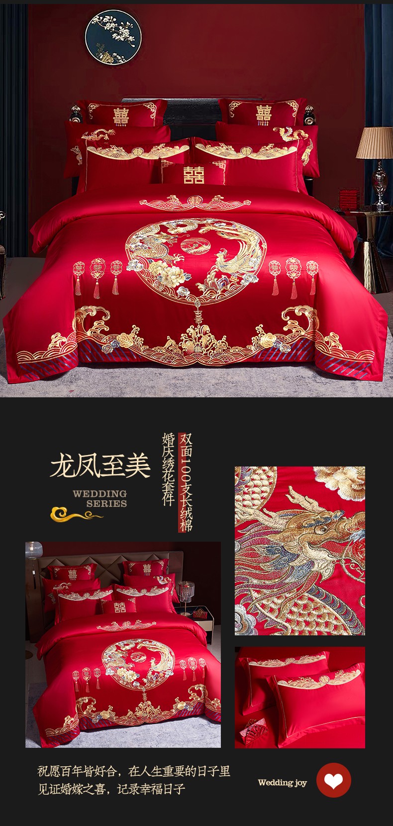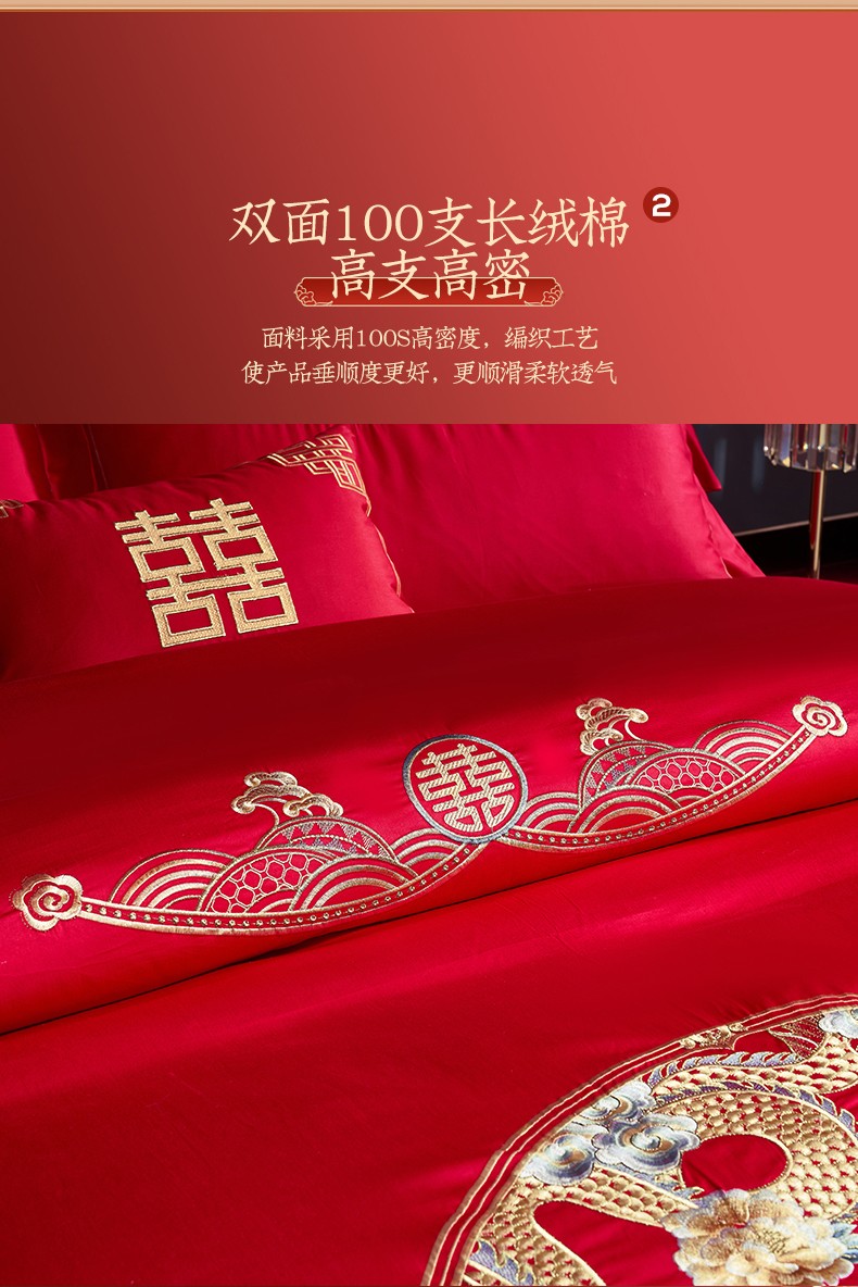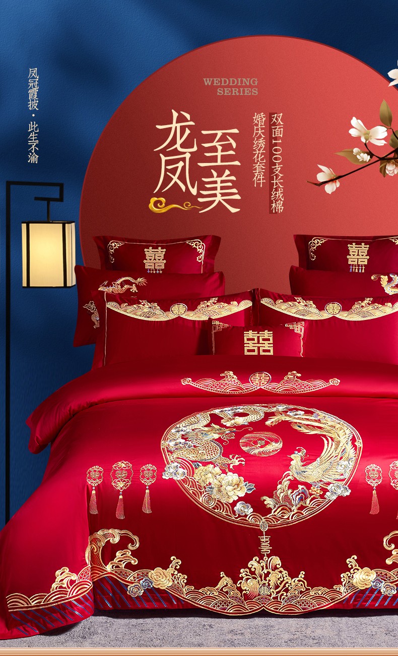 当前位置: 91家纺网 > 商品网购 > 床品套件 > 多件套 > 多件套 > 千禧 2023新款婚庆双面100支长绒棉婚庆绣花套件 龙凤至美