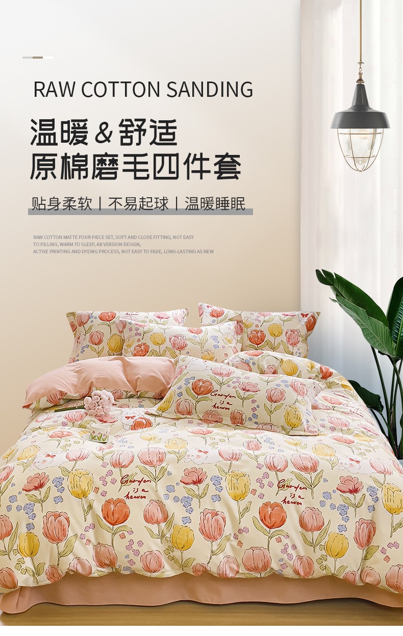 金丝鸟 2023新款原棉磨毛四件套小清新系列 长岛花兔