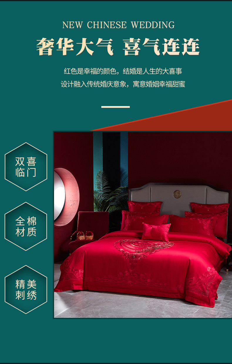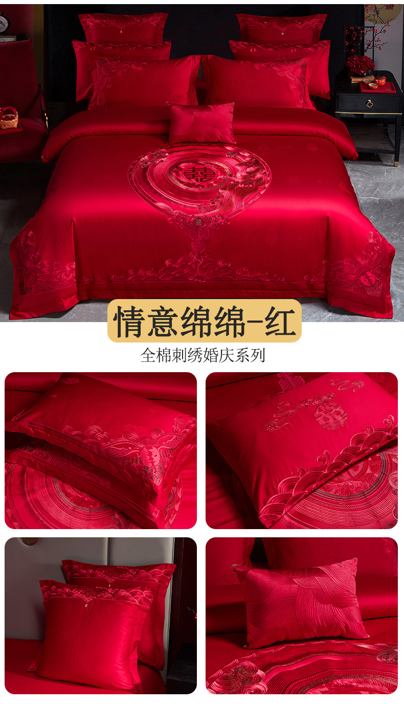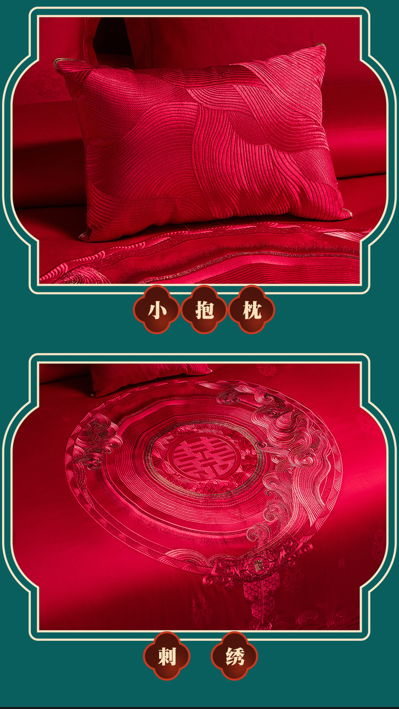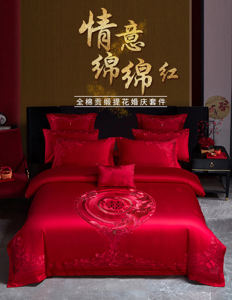 当前位置: 91家纺网 > 商品网购 > 床品套件 > 四件套 > 婚庆四件套 > 宏羽纺 2023新款高支高密全棉贡缎提花婚庆套件 全棉情意绵绵-红
