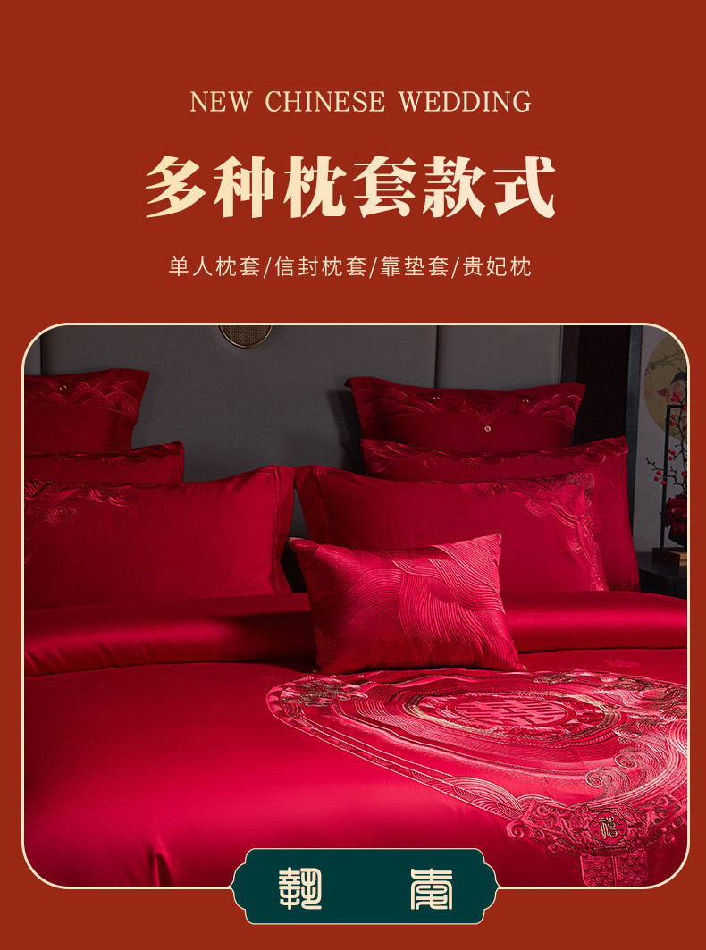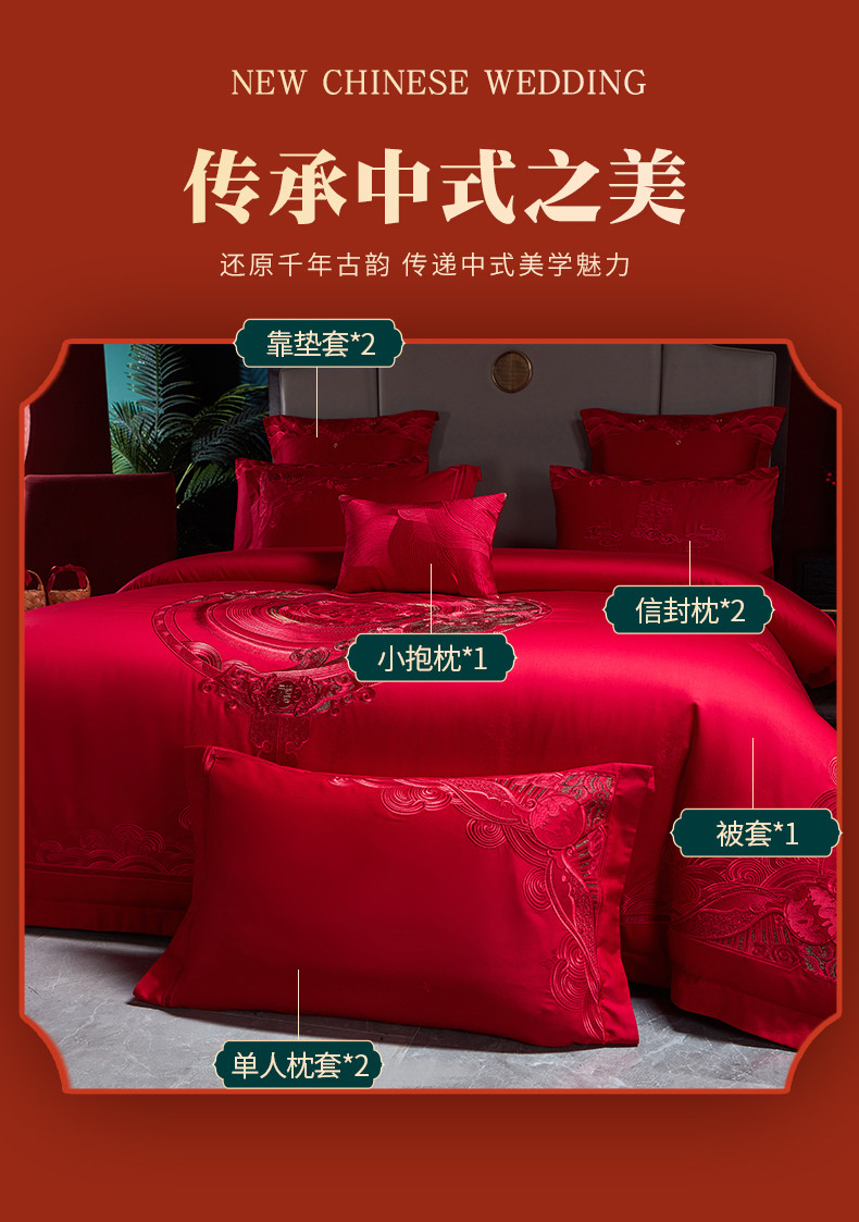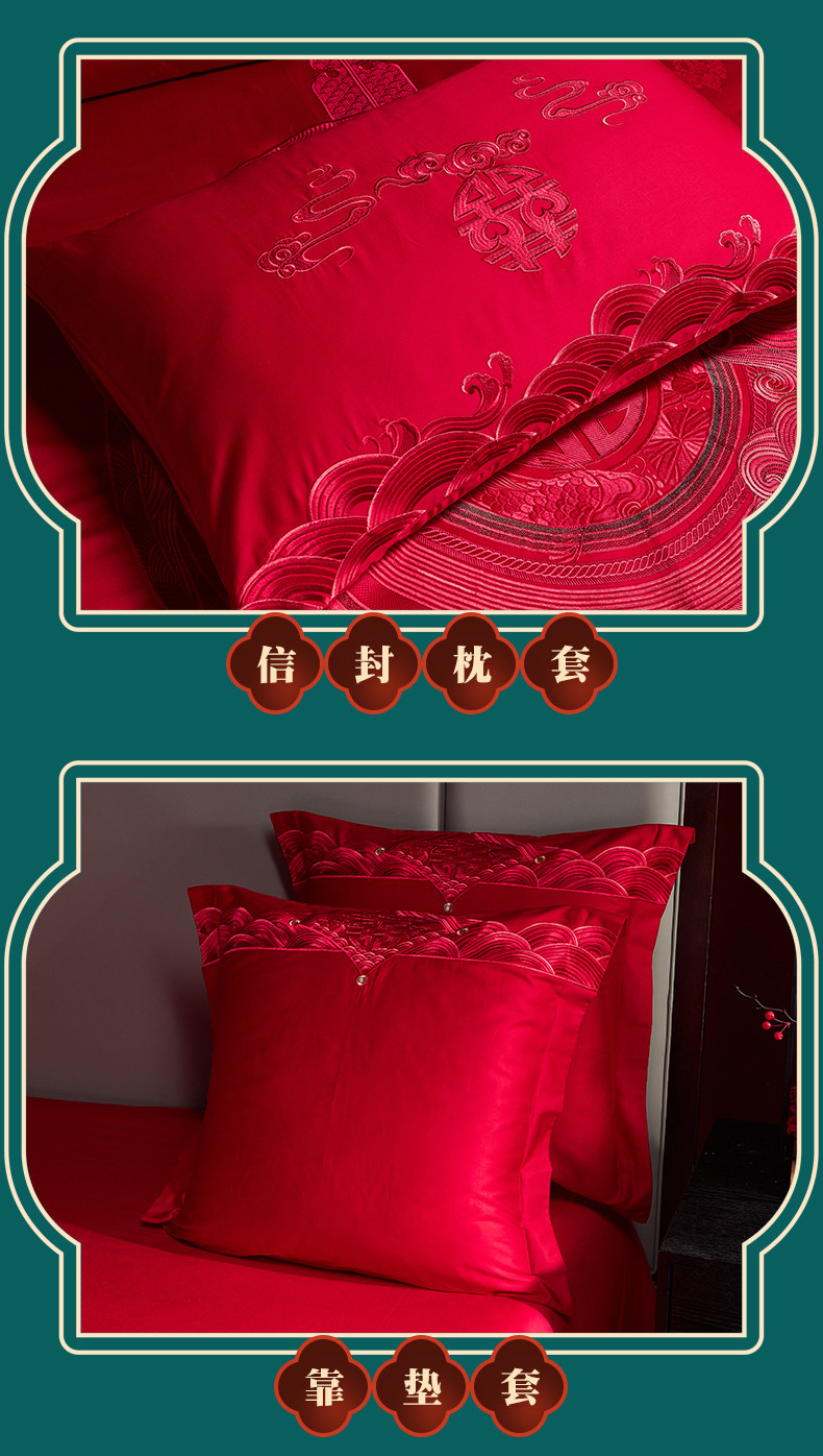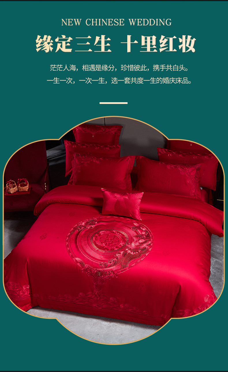 当前位置: 91家纺网 > 商品网购 > 床品套件 > 四件套 > 婚庆四件套 > 宏羽纺 2023新款高支高密全棉贡缎提花婚庆套件 全棉情意绵绵-红