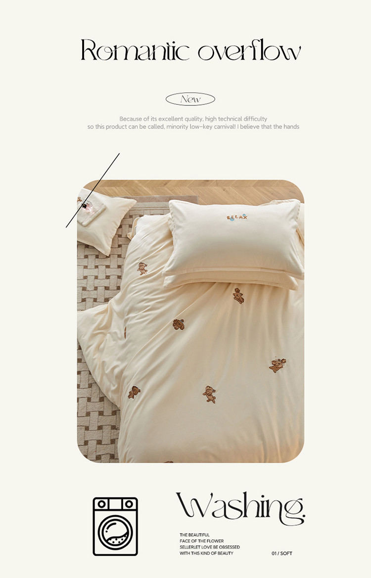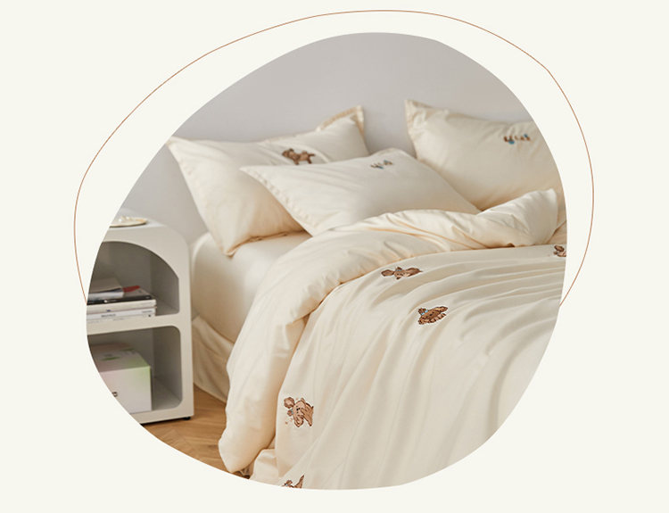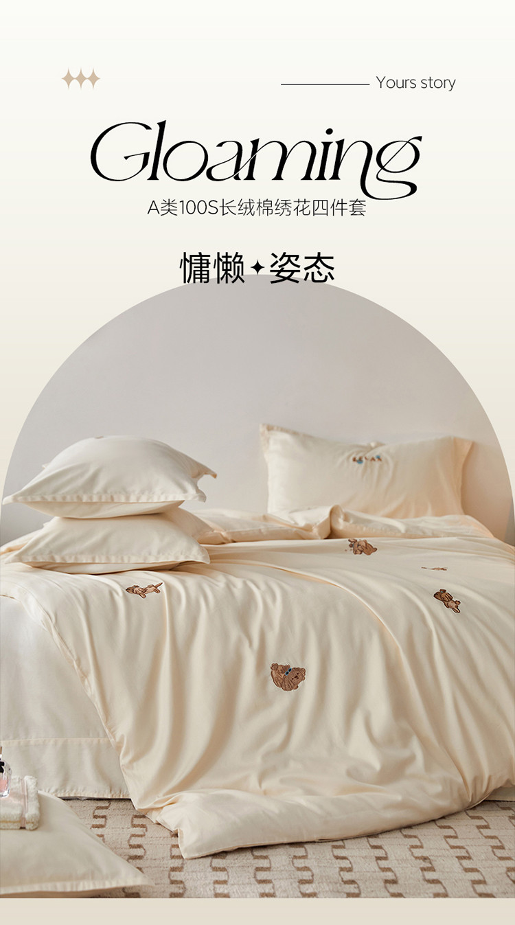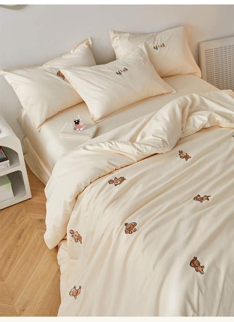 秀色60支可爱刺绣贡缎长绒棉四件套全棉纯棉床上被套奶油狗-奶昔白香槟金