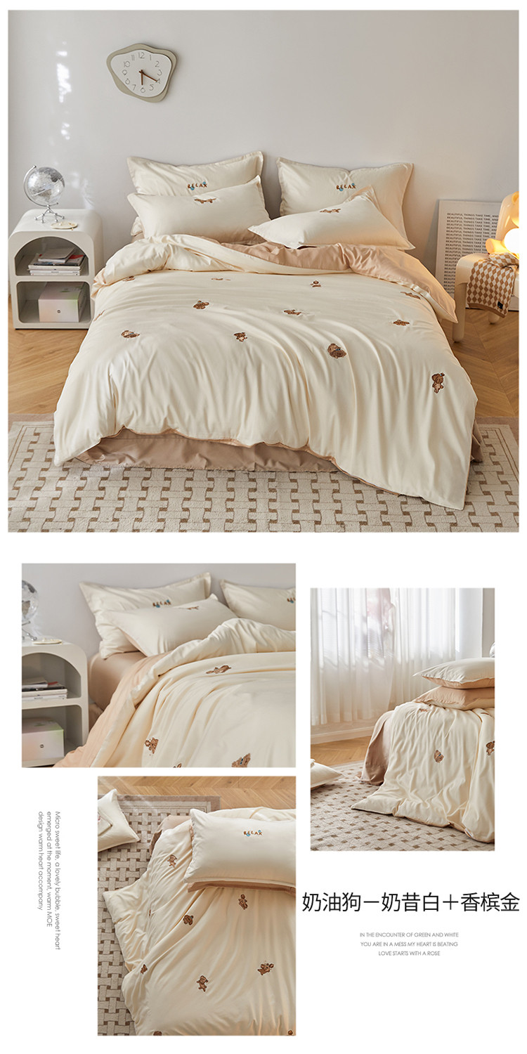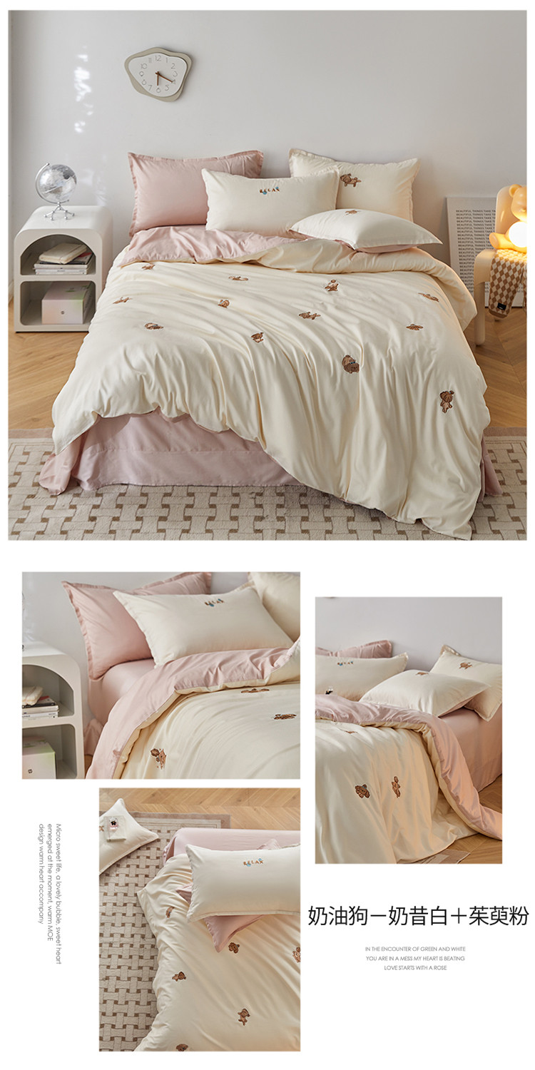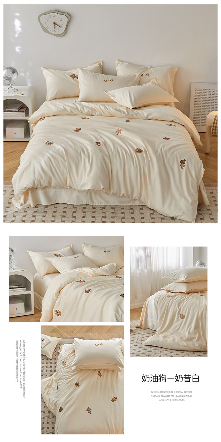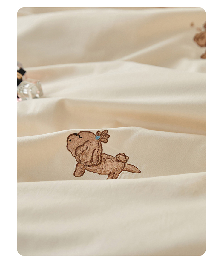 商品名称:秀色60支可爱刺绣贡缎长绒棉四件套全棉纯棉床上被套奶油狗-奶昔白香槟金