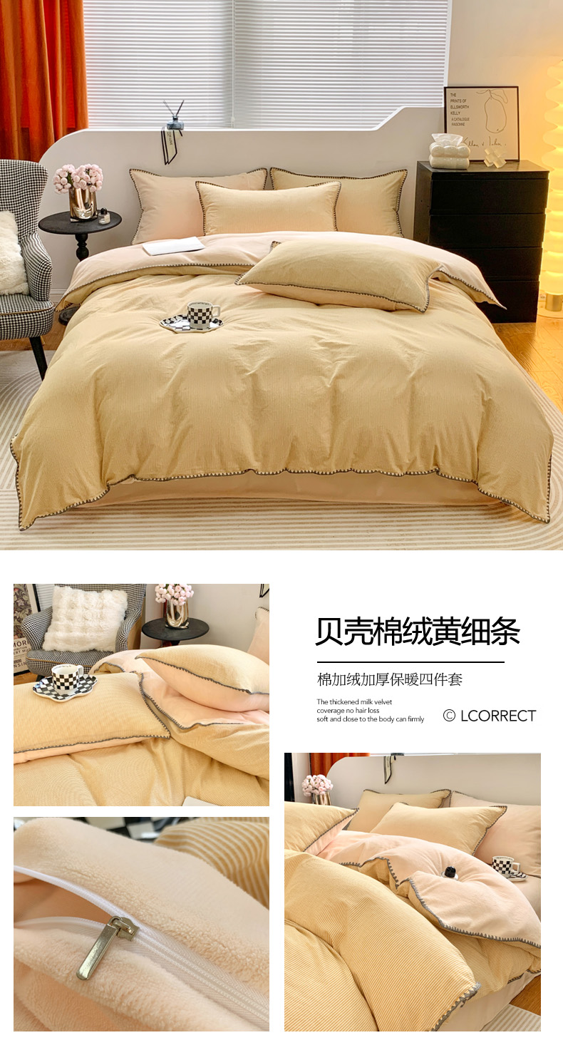 当前位置: 91家纺网 > 商品网购 > 床品套件 > 四件套 > 牛奶绒四件套 > 柠馨 2023贝壳边全棉水洗棉牛奶绒四件套含买家秀 贝壳棉绒黄细条