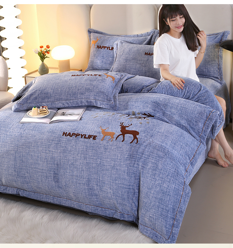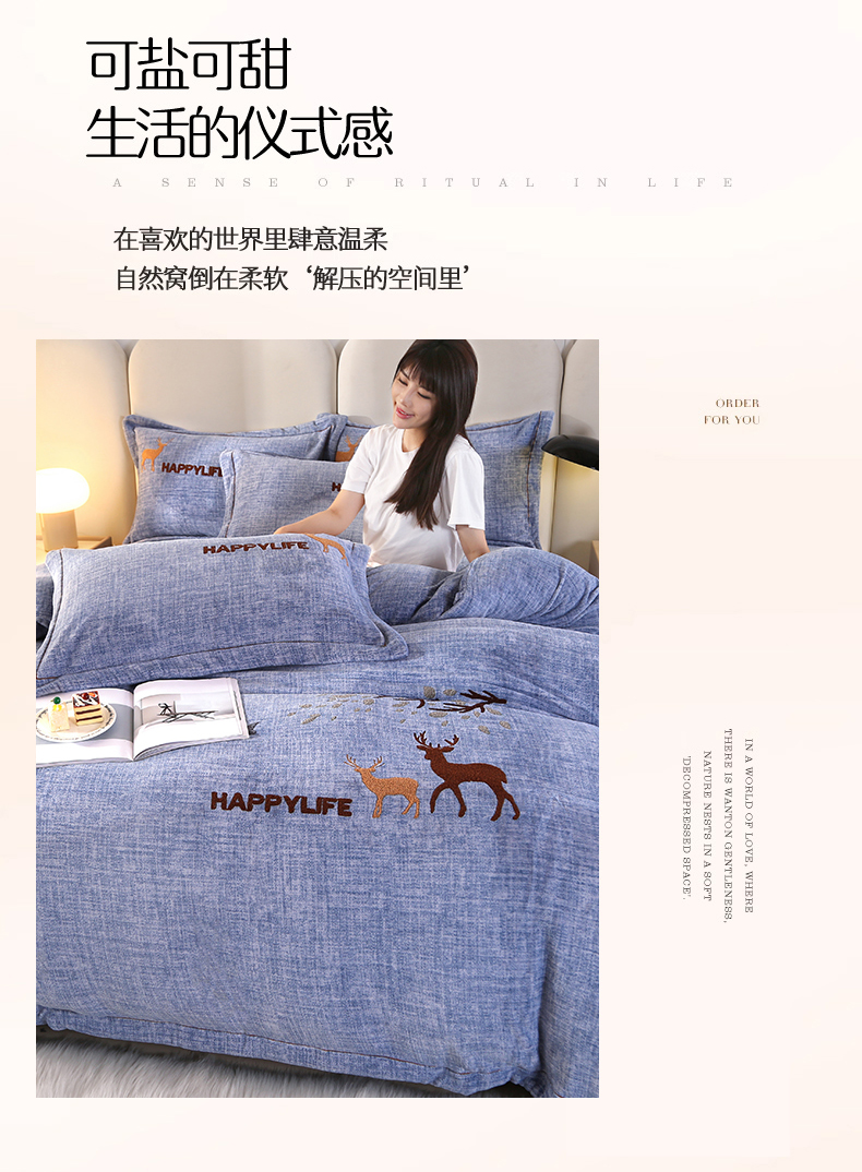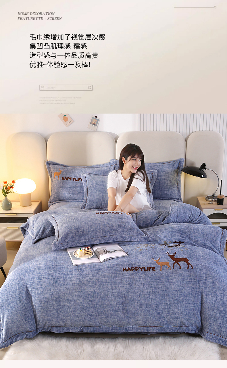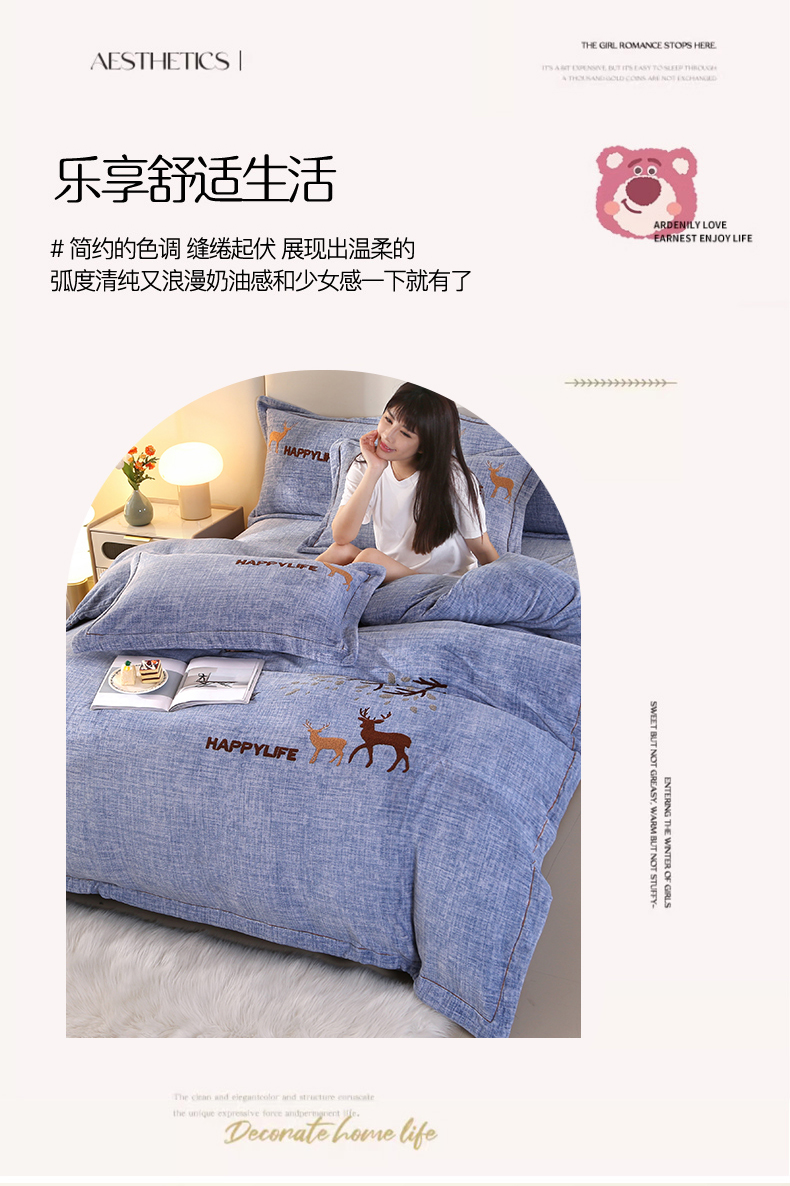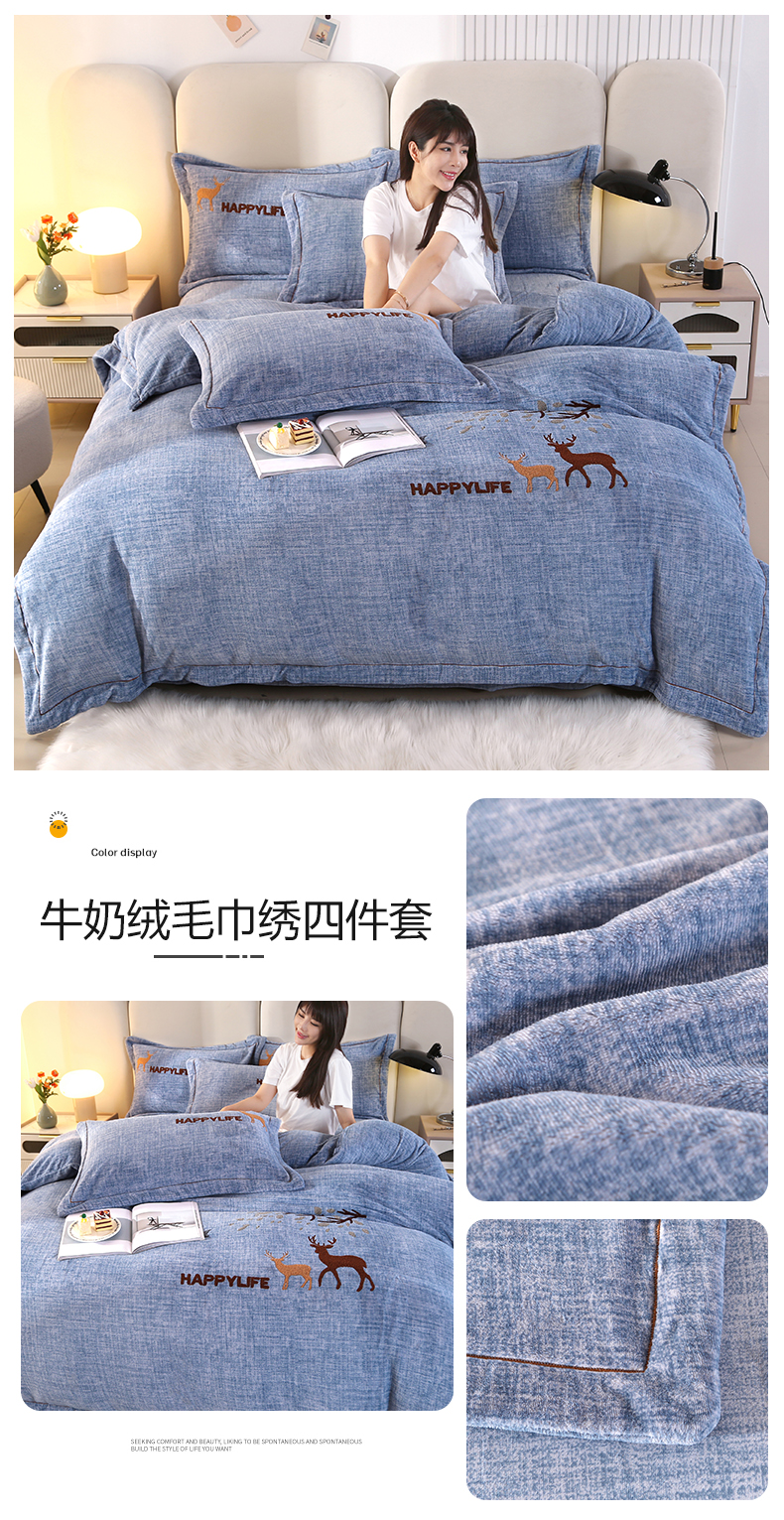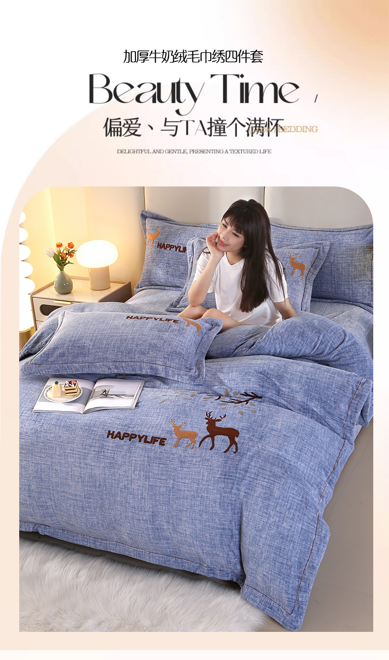 代芙家纺 2023秋冬新品全消光8.5斤牛奶绒加厚保暖毛巾绣四件套 小鹿-蓝