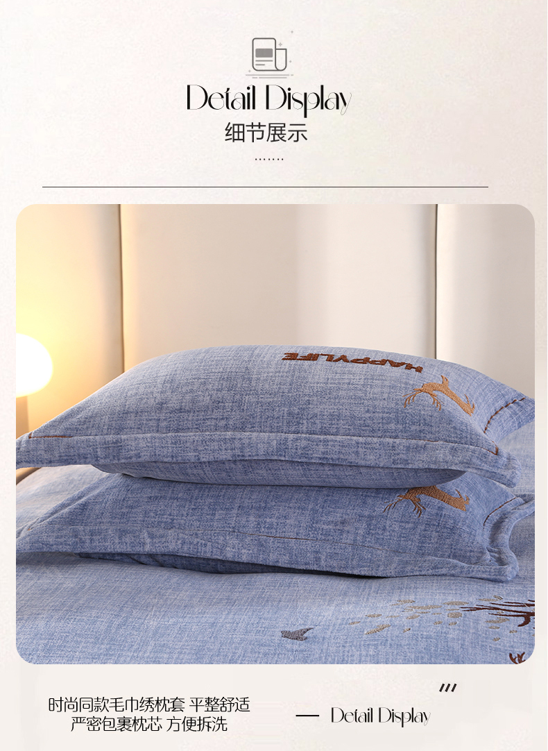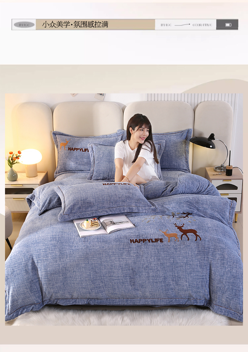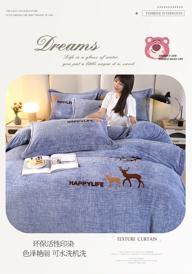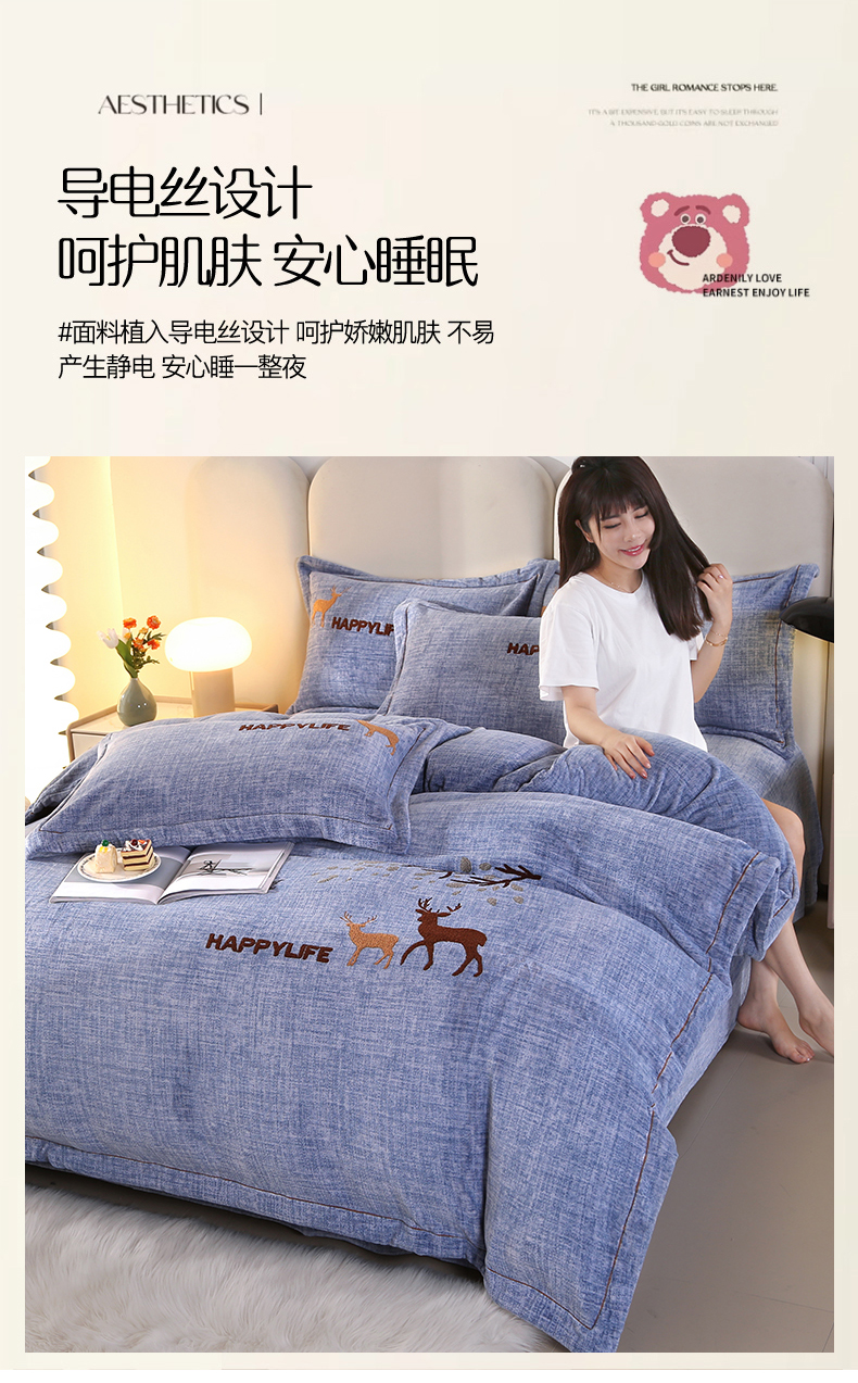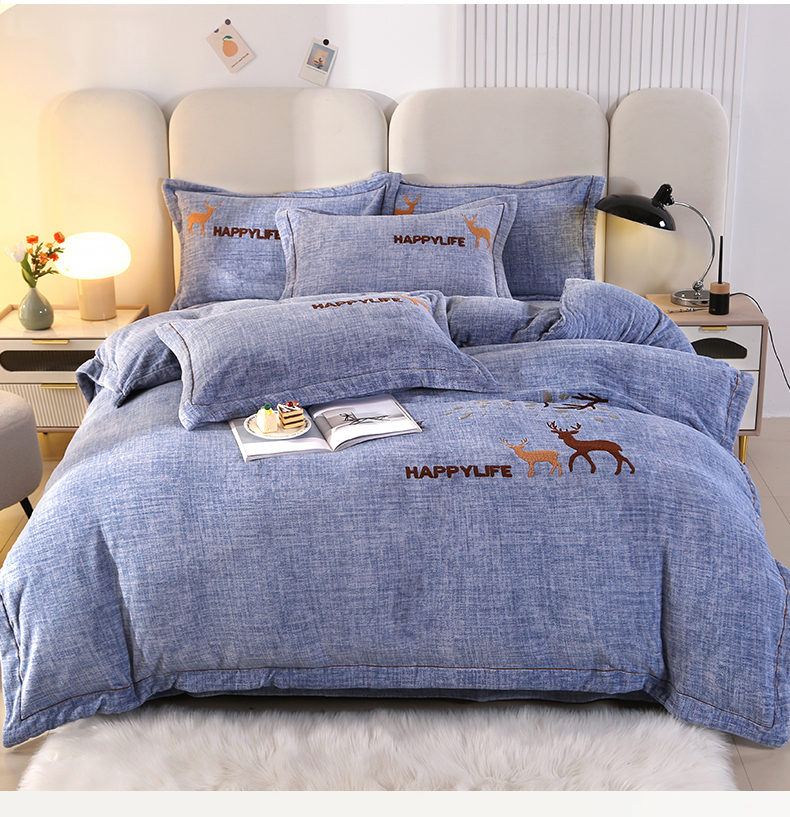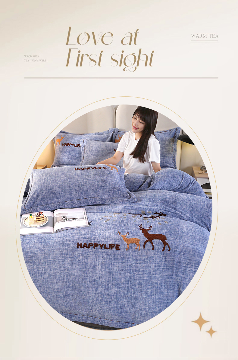 代芙家纺 2023秋冬新品全消光8.5斤牛奶绒加厚保暖毛巾绣四件套 小鹿-蓝
