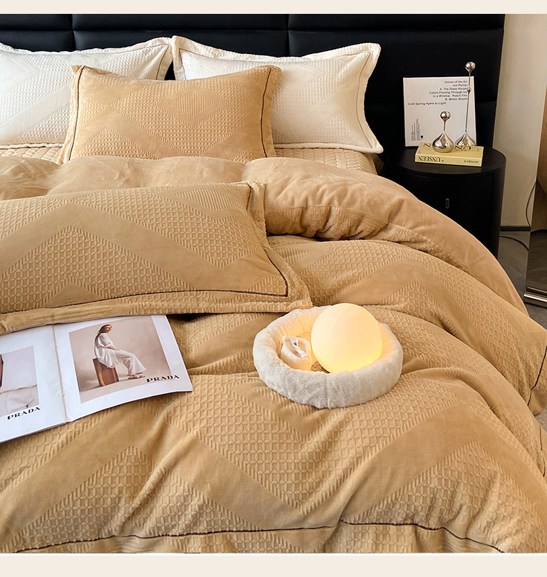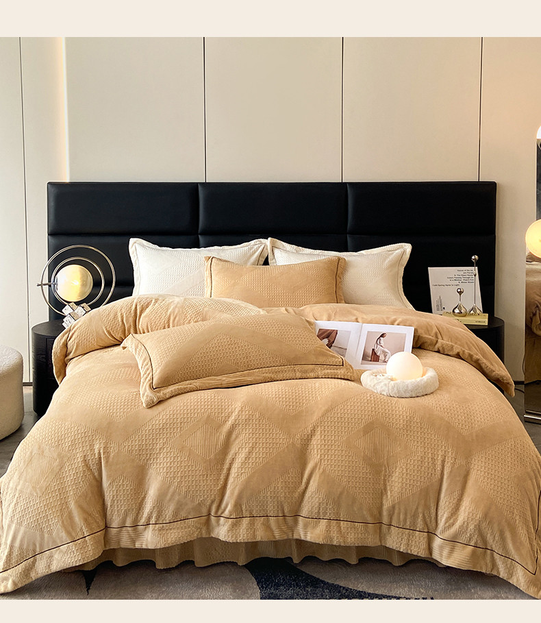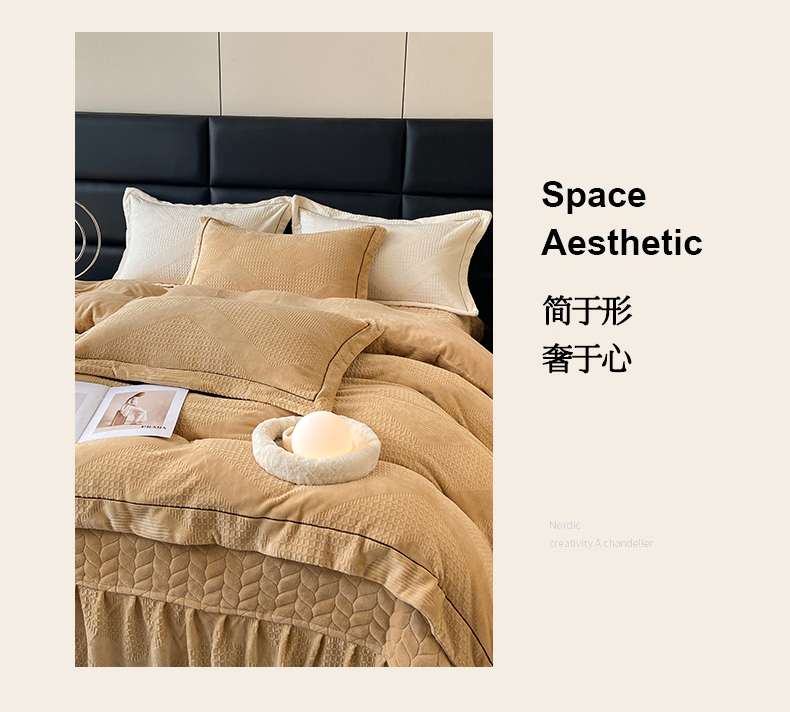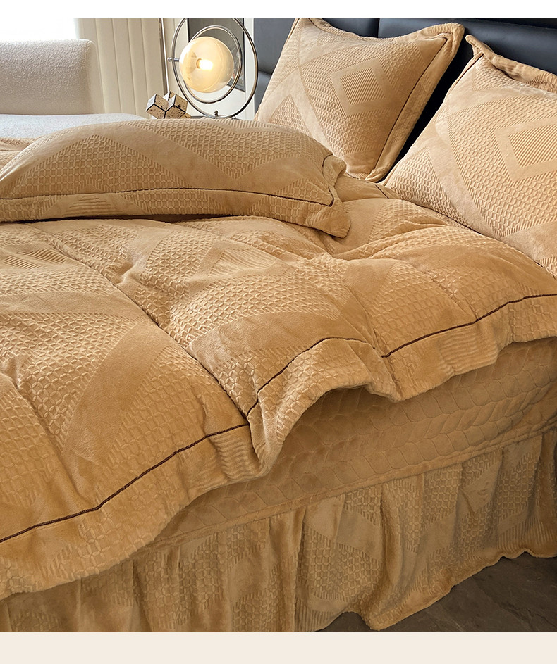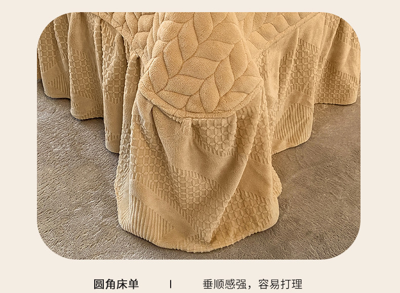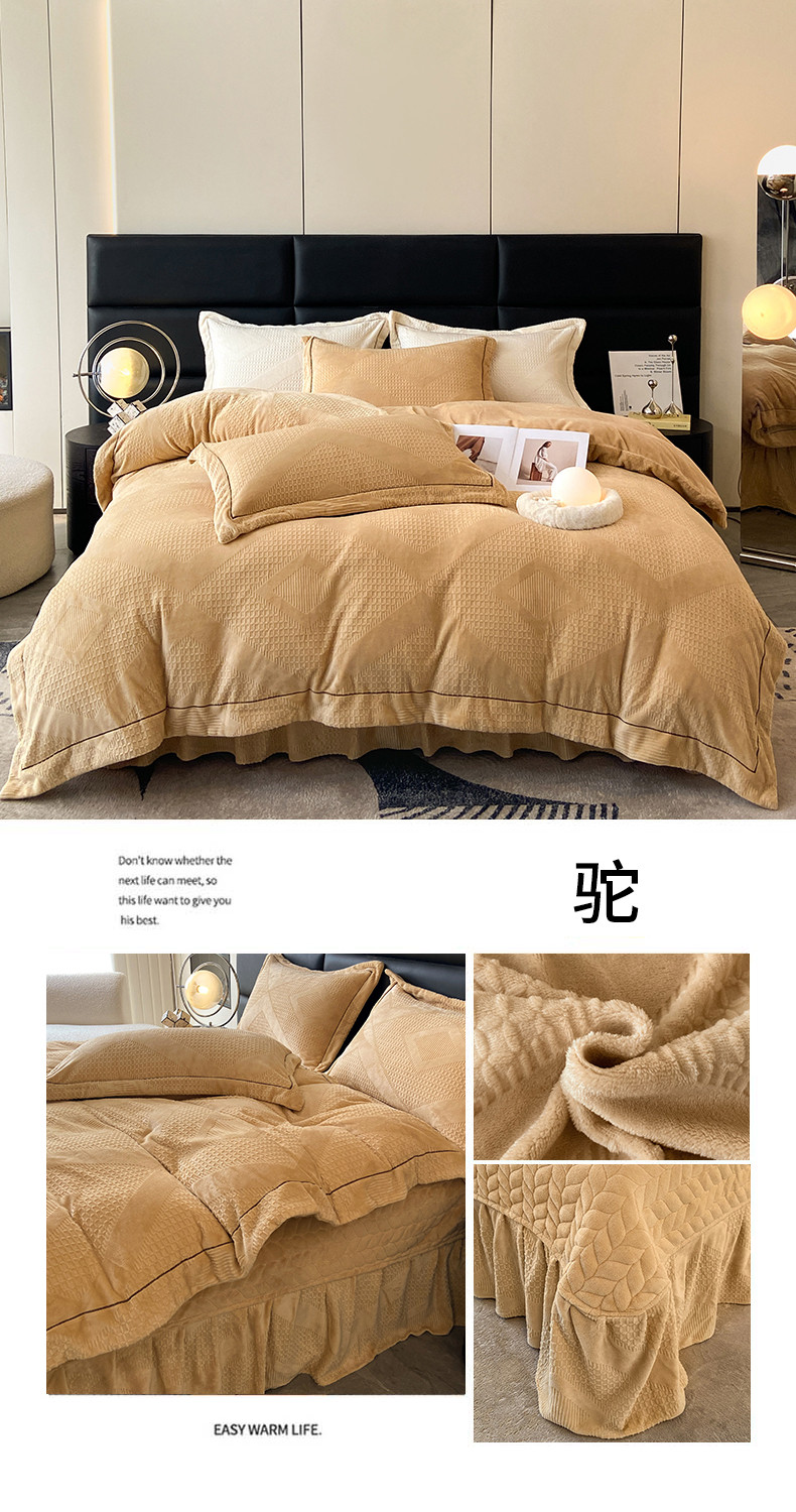 美伦美焕2023新款纯色立体雕花牛奶绒床盖四件套床裙款式 驼色