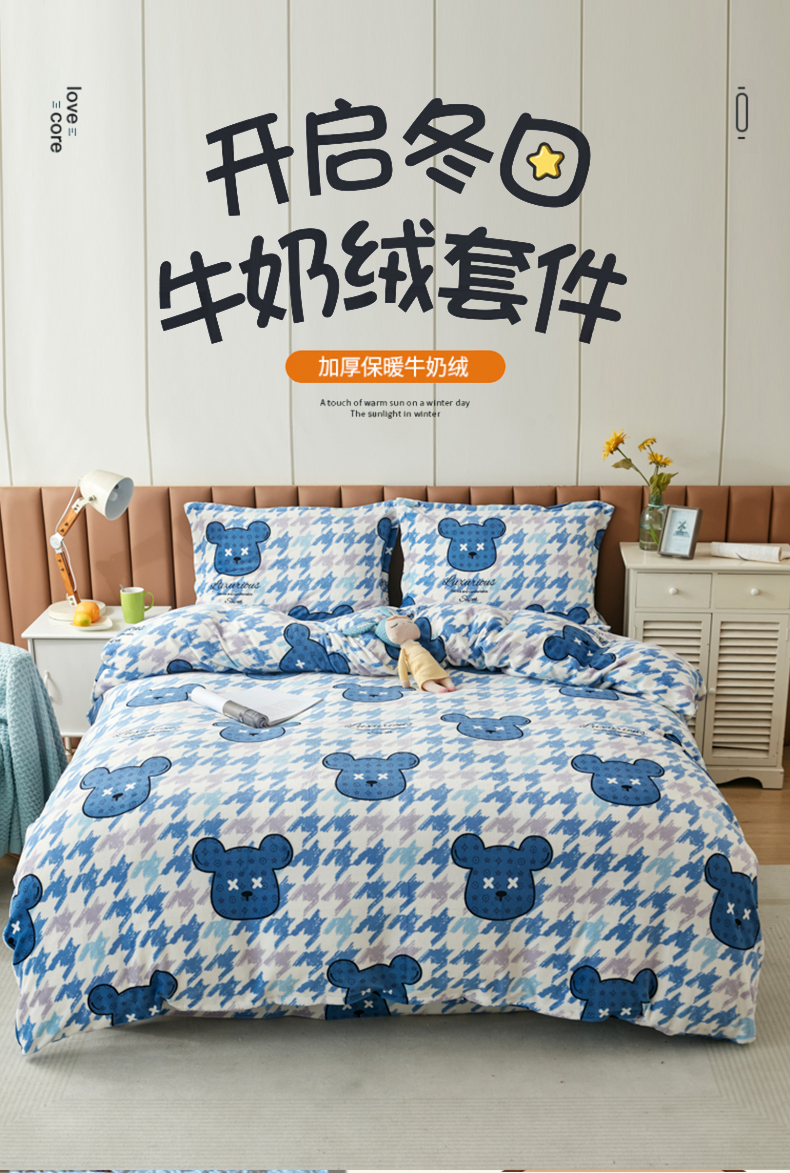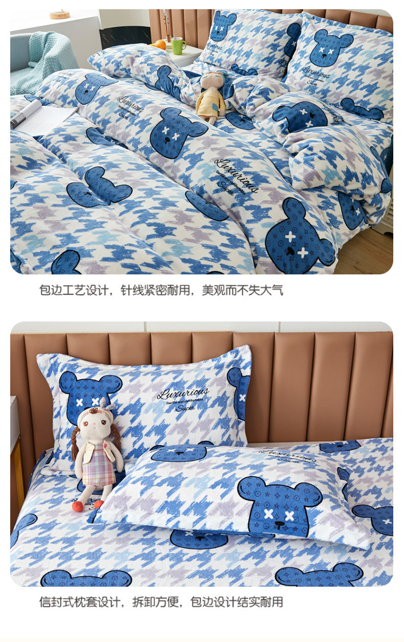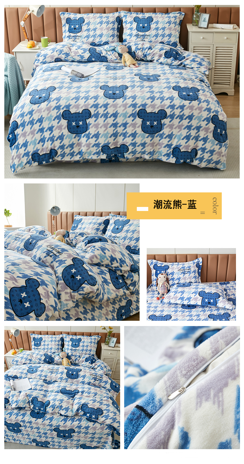 • 91家纺网 家纺一手货源 找家纺 乐居坊 2023新款高克重牛奶绒印花保暖四件套 潮流熊-蓝