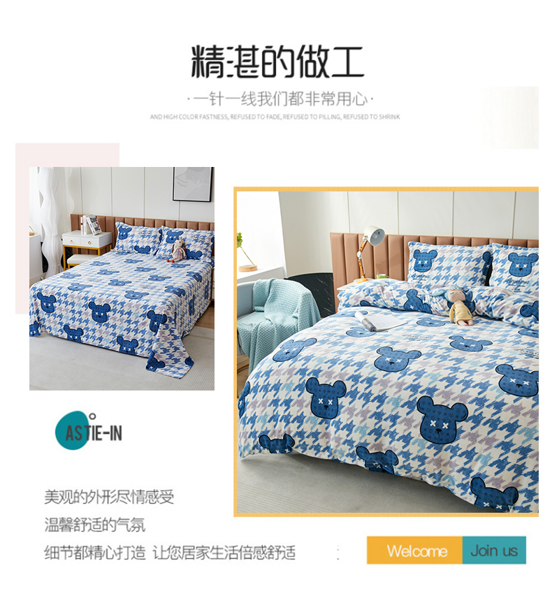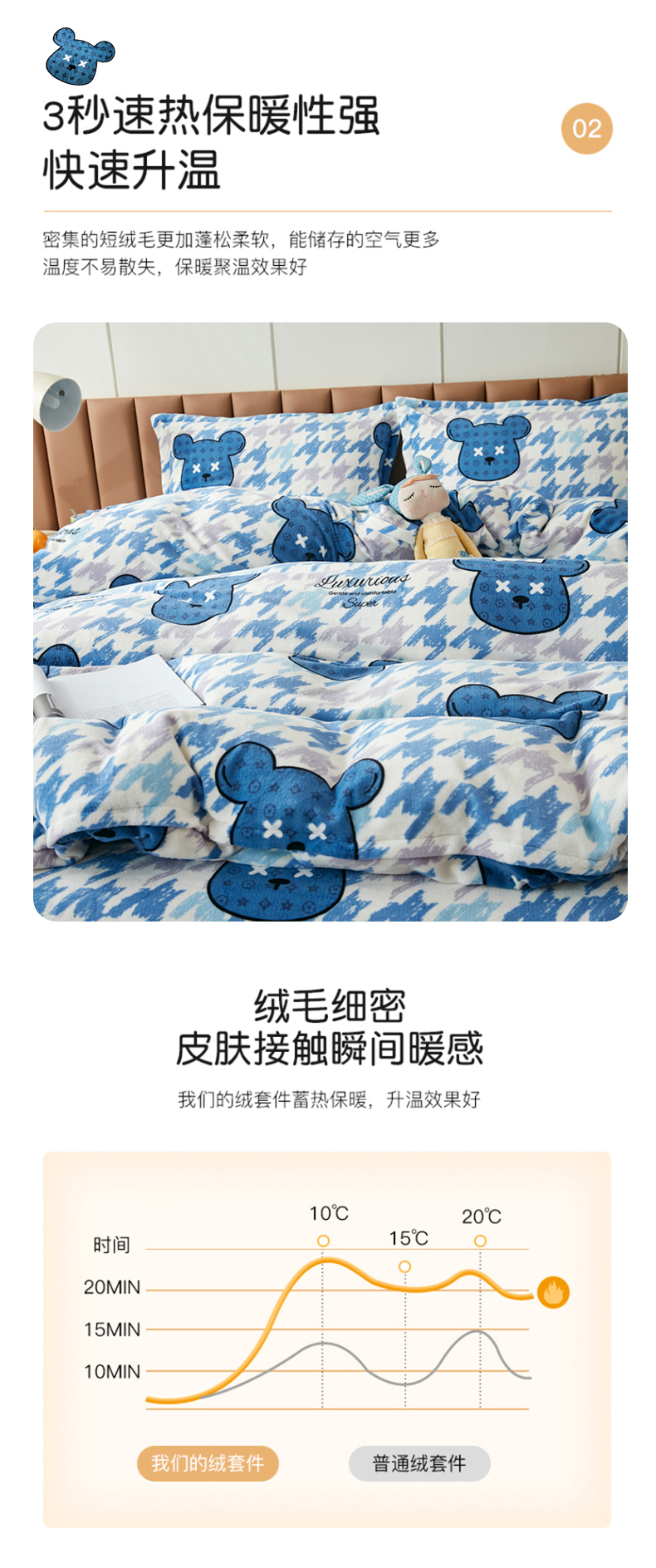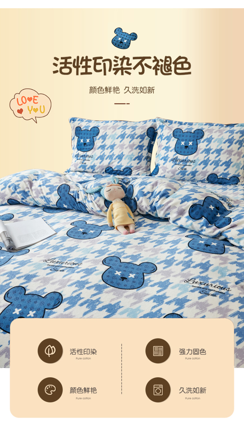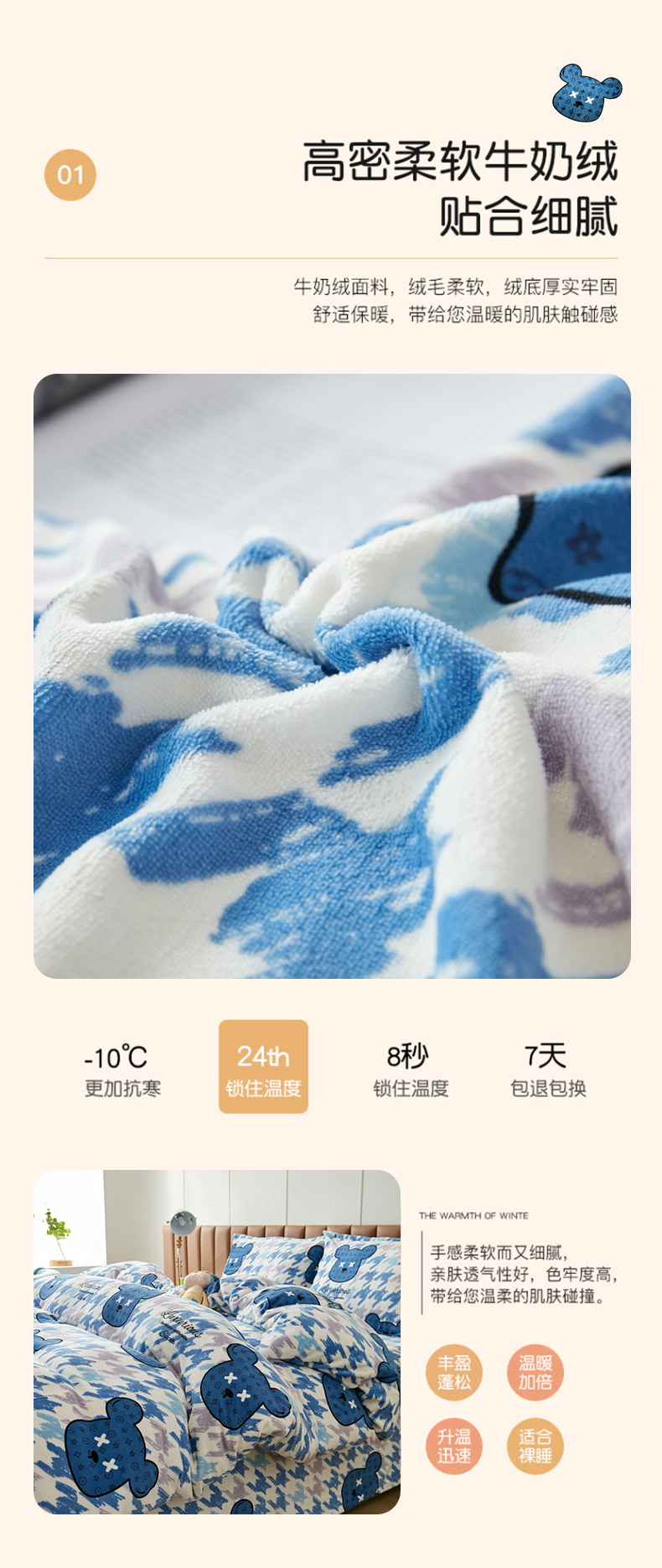 • 91家纺网 家纺一手货源 找家纺 乐居坊 2023新款高克重牛奶绒印花保暖四件套 潮流熊-蓝