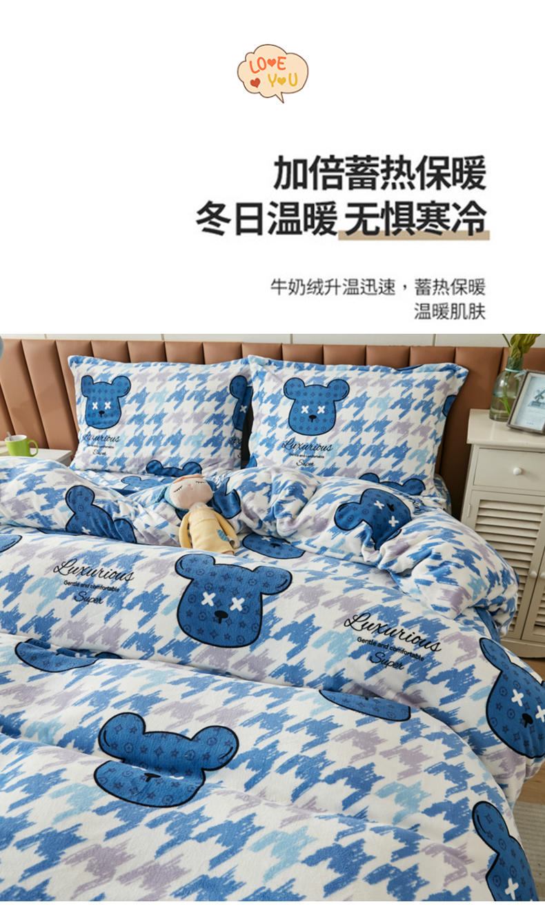乐居坊 2023新款高克重牛奶绒印花保暖四件套 潮流熊-蓝