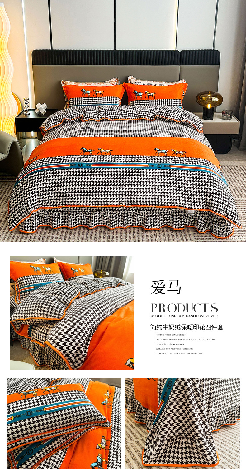 商品名称:欧喜璐 2023新款高克重牛奶绒四件套法莱绒金貂绒8.5斤加厚保暖-印花款 爱马