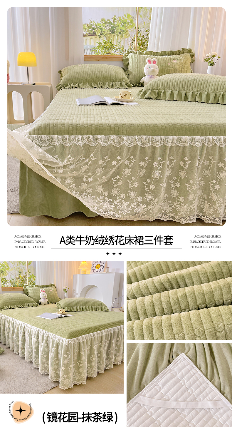 商品名称:宜凡家纺 2023新款高克重牛奶绒绣花夹棉床裙三件套 镜花园-抹茶绿