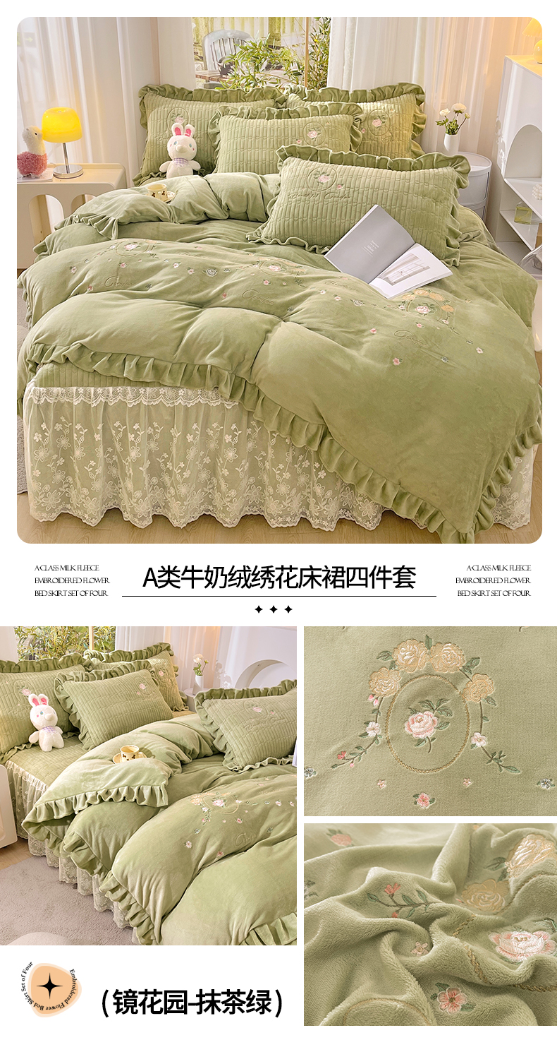 当前位置: 91家纺网 > 商品网购 > 床品套件 > 四件套 > 牛奶绒四件套 > 宜凡家纺 2023新款高克重牛奶绒绣花夹棉床裙四件套 镜花园-抹茶绿
