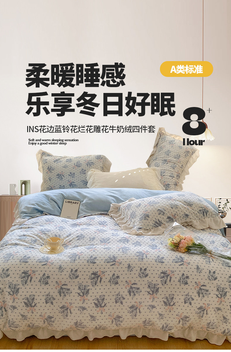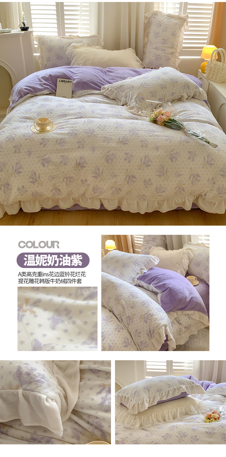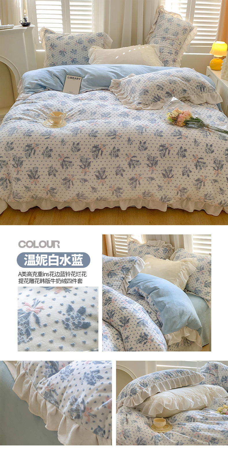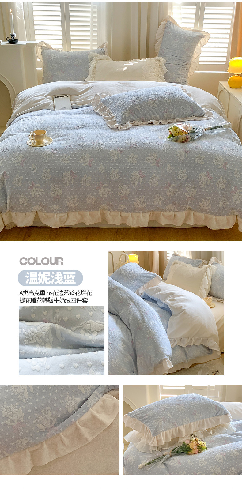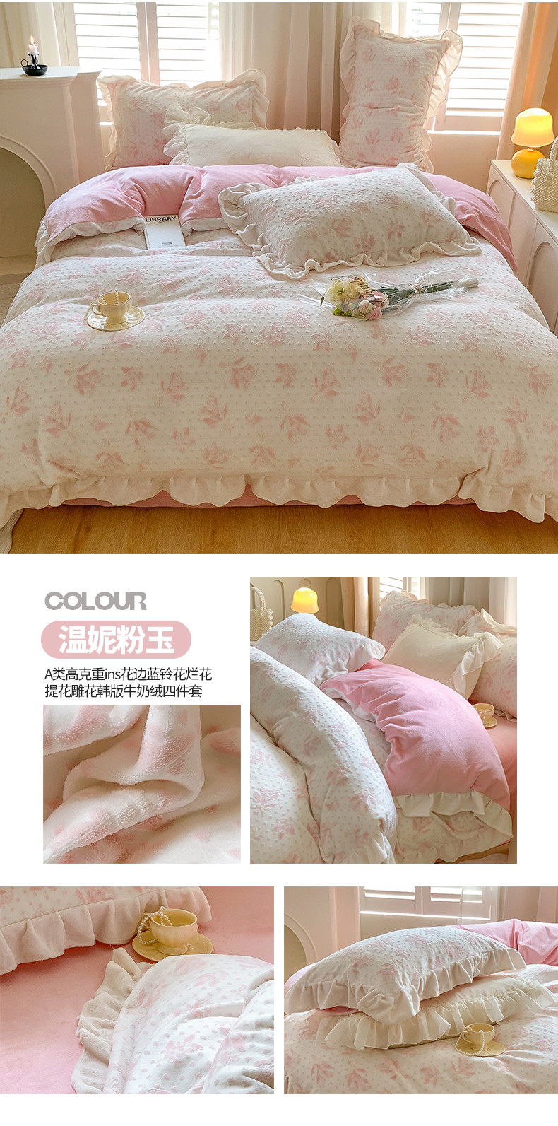 (总)桃子家居2023新款A类高克重ins花边3D立体韩版牛奶绒四件套