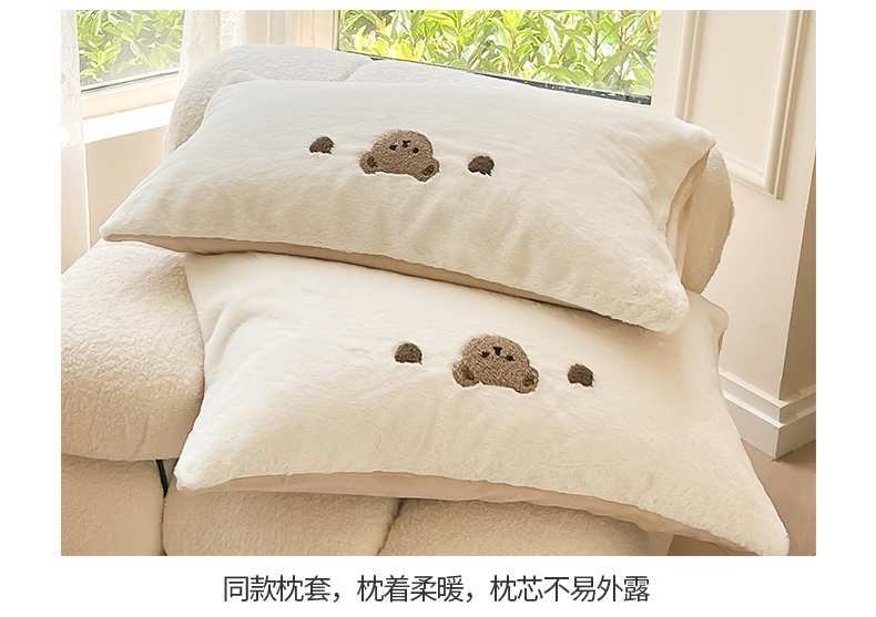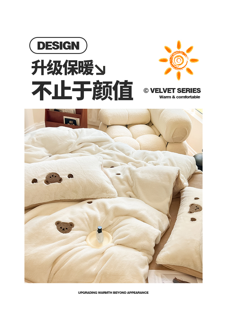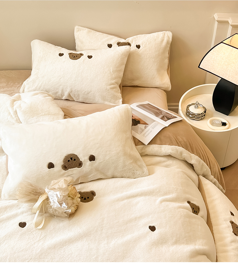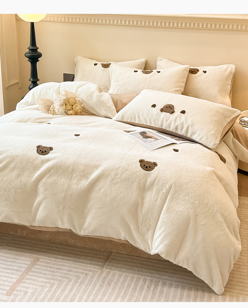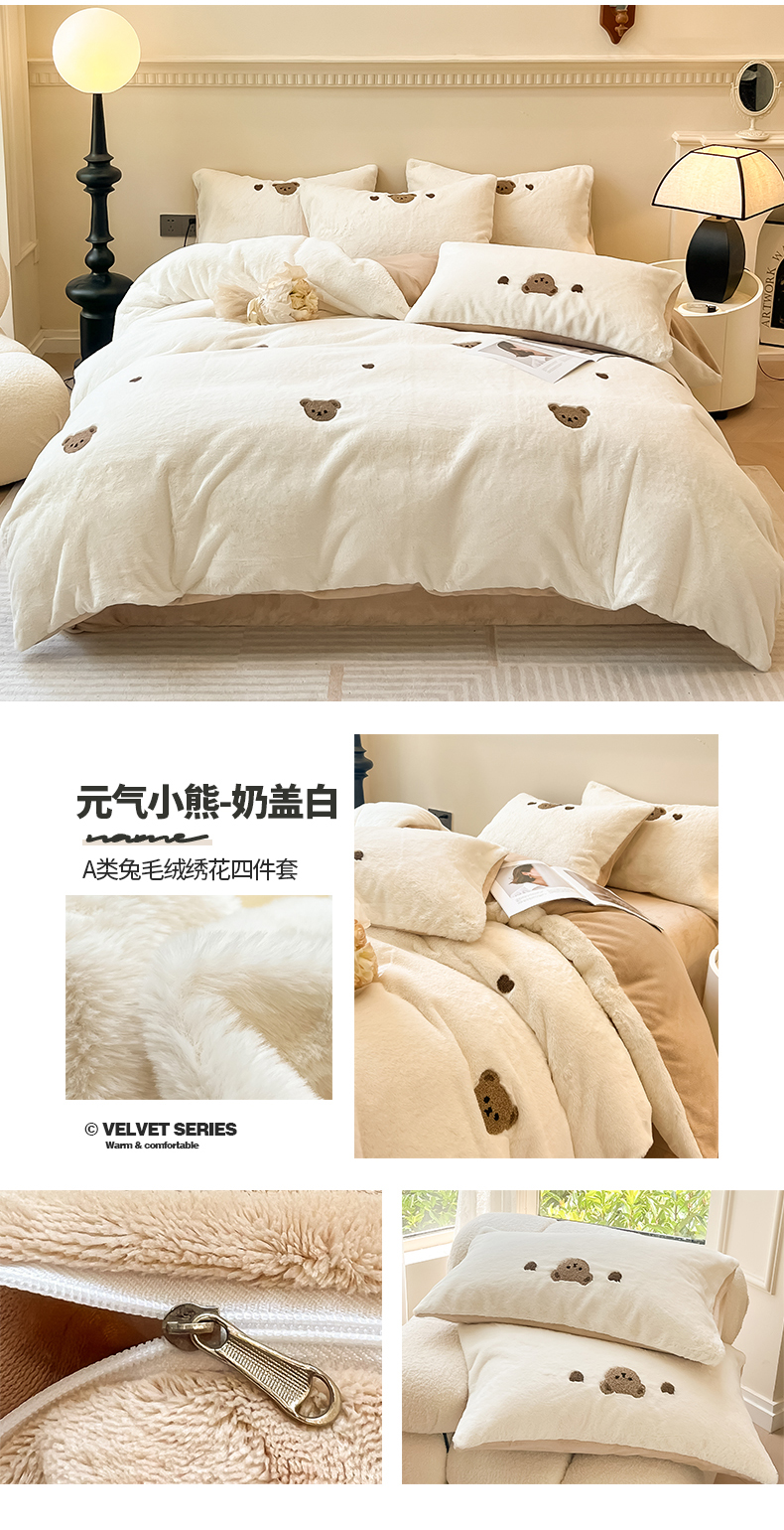 商品名称:懒猫家纺 2024新款兔毛绒毛巾绣四件套 元气小熊-奶盖白