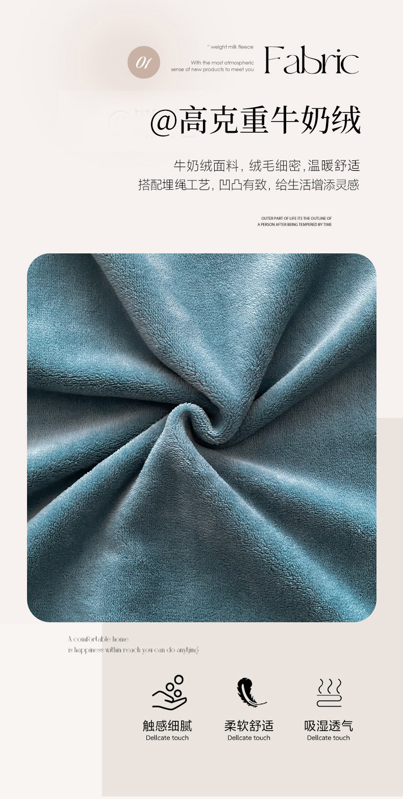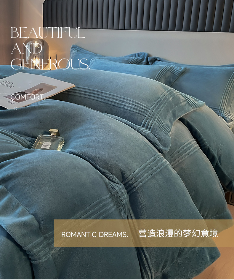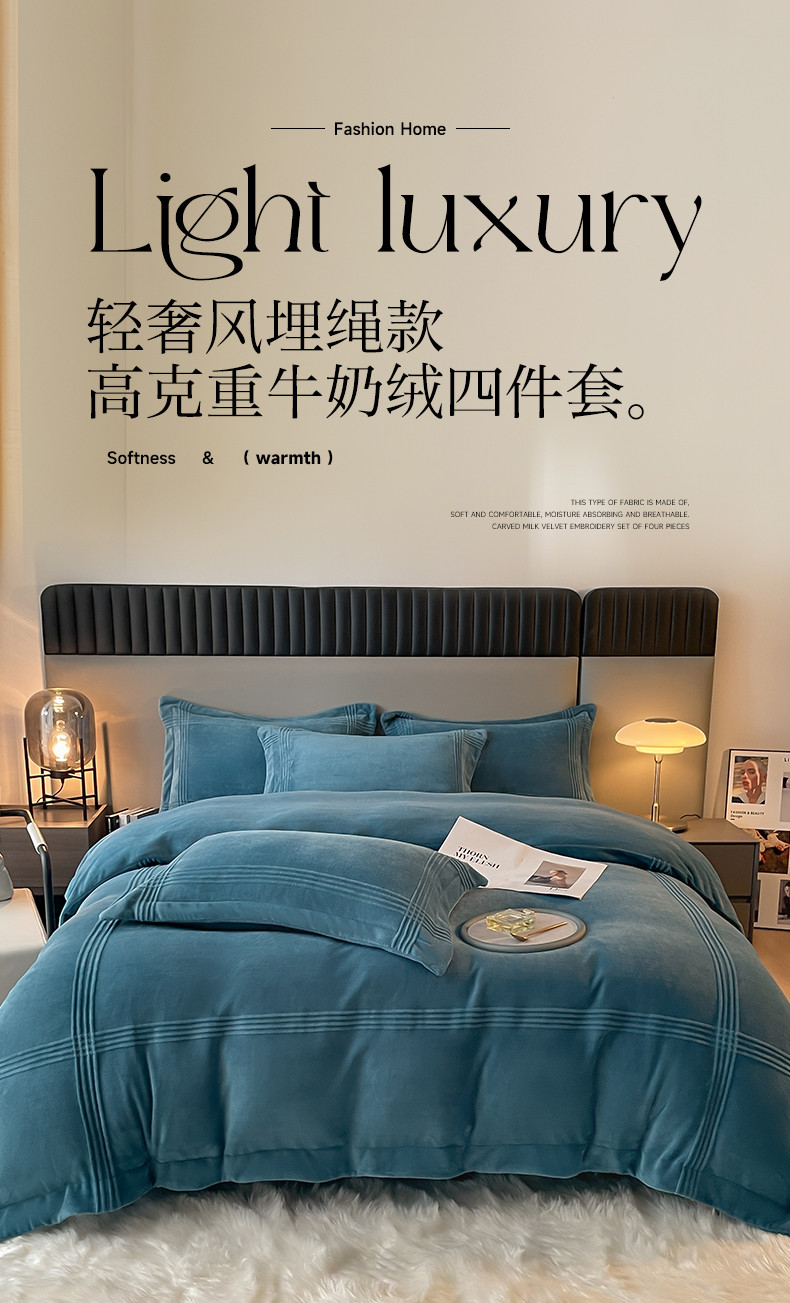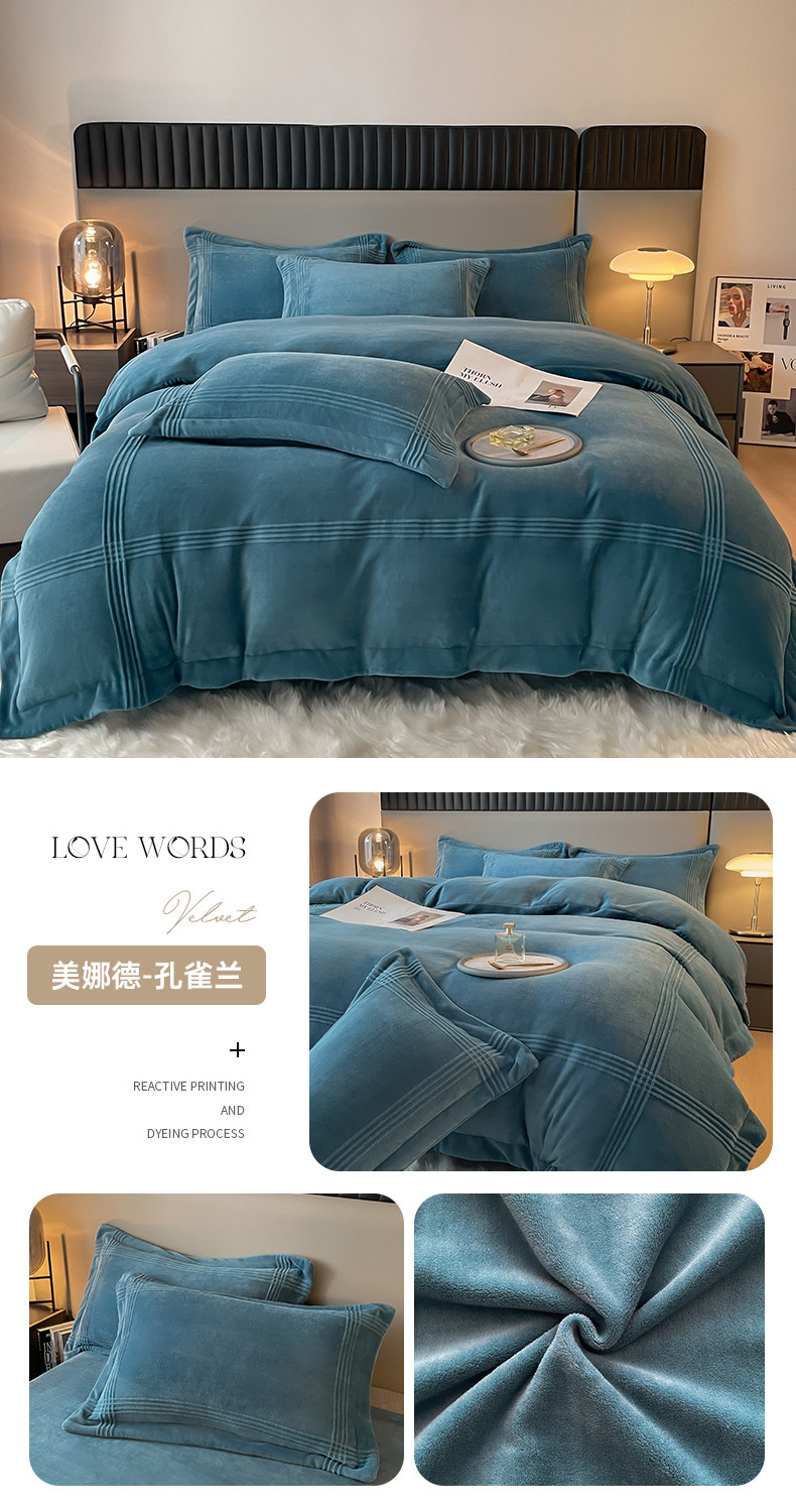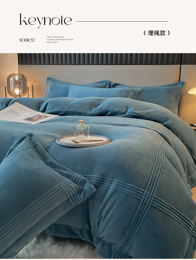 商品名称:米瑞娜 2024新款轻奢风埋绳款高克重牛奶绒四件套 美娜德-孔雀兰