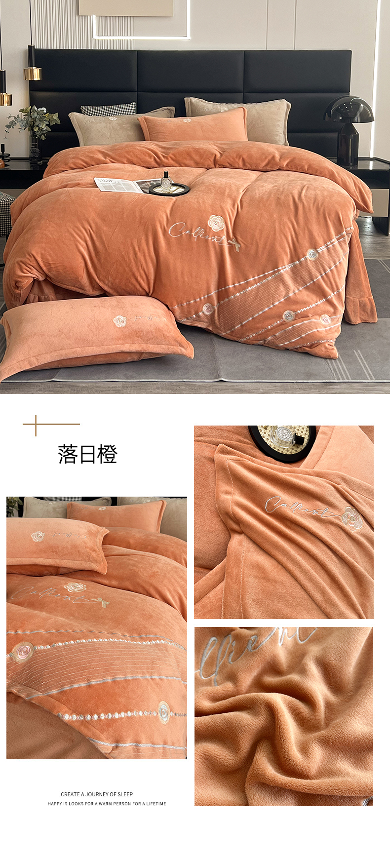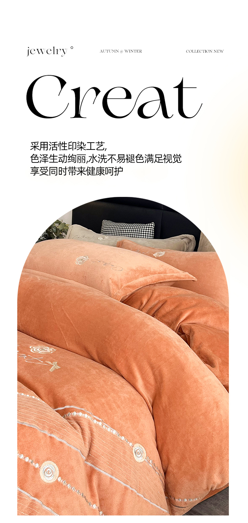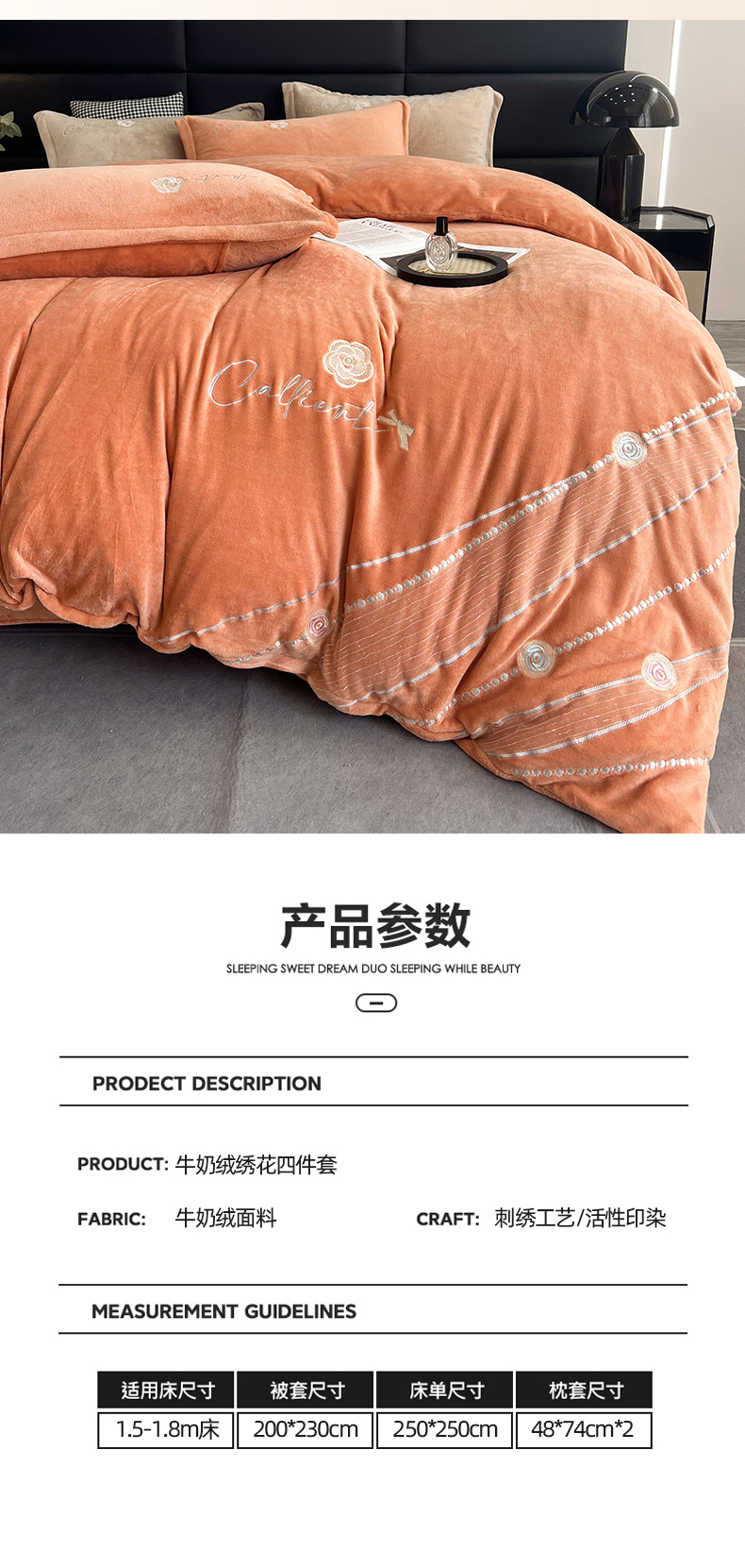 商品名称:丝涟家居 2023牛奶绒绣花四件套-山茶花 橙色