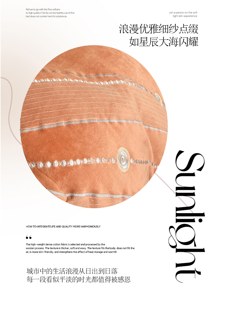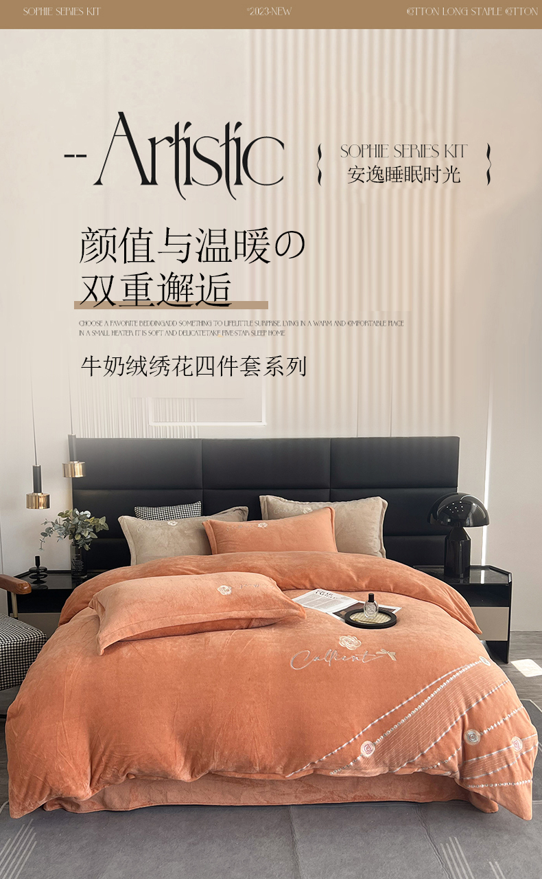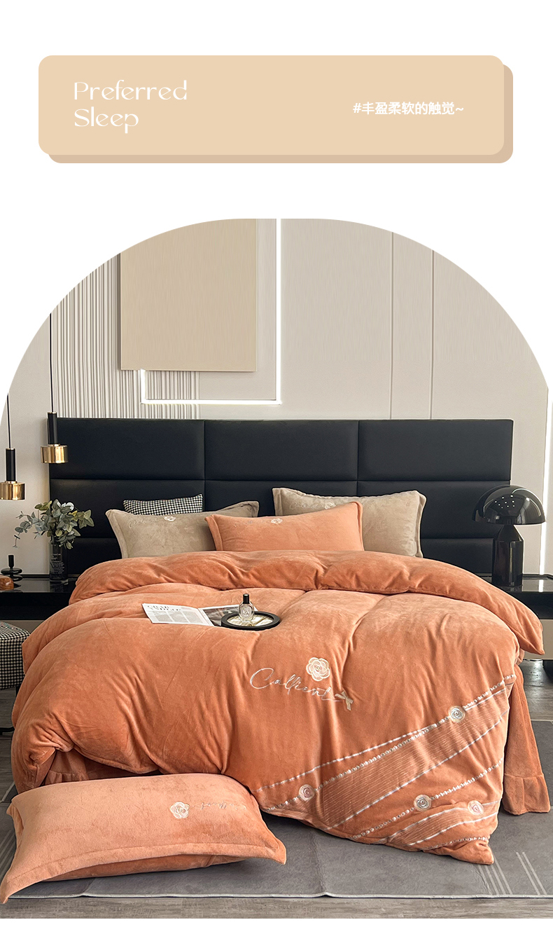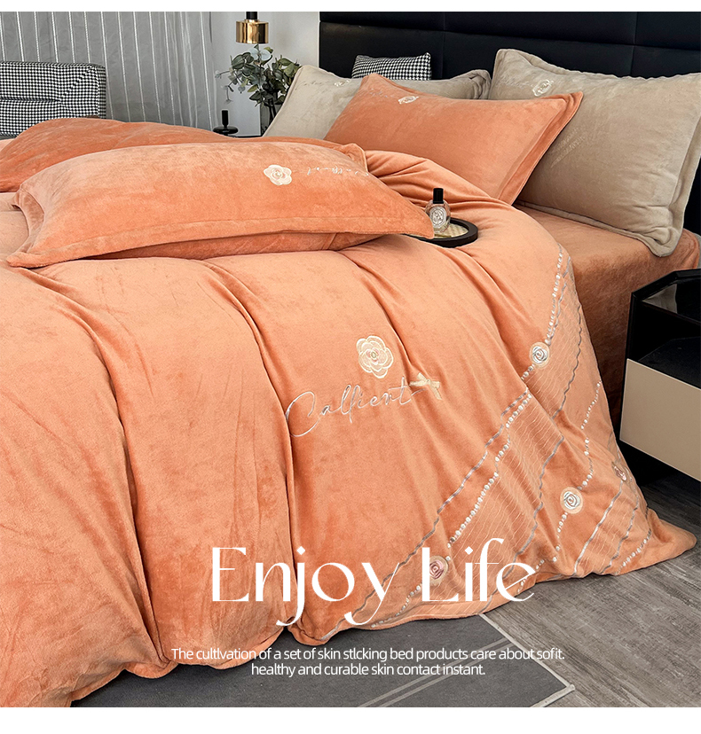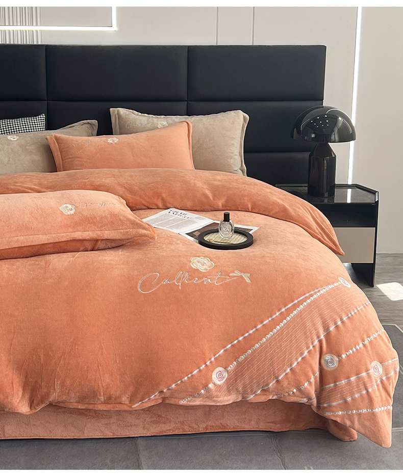 丝涟家居 2023牛奶绒绣花四件套-山茶花 橙色