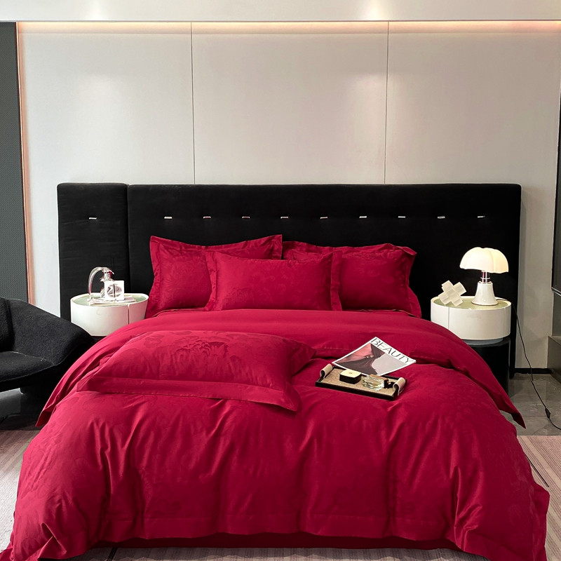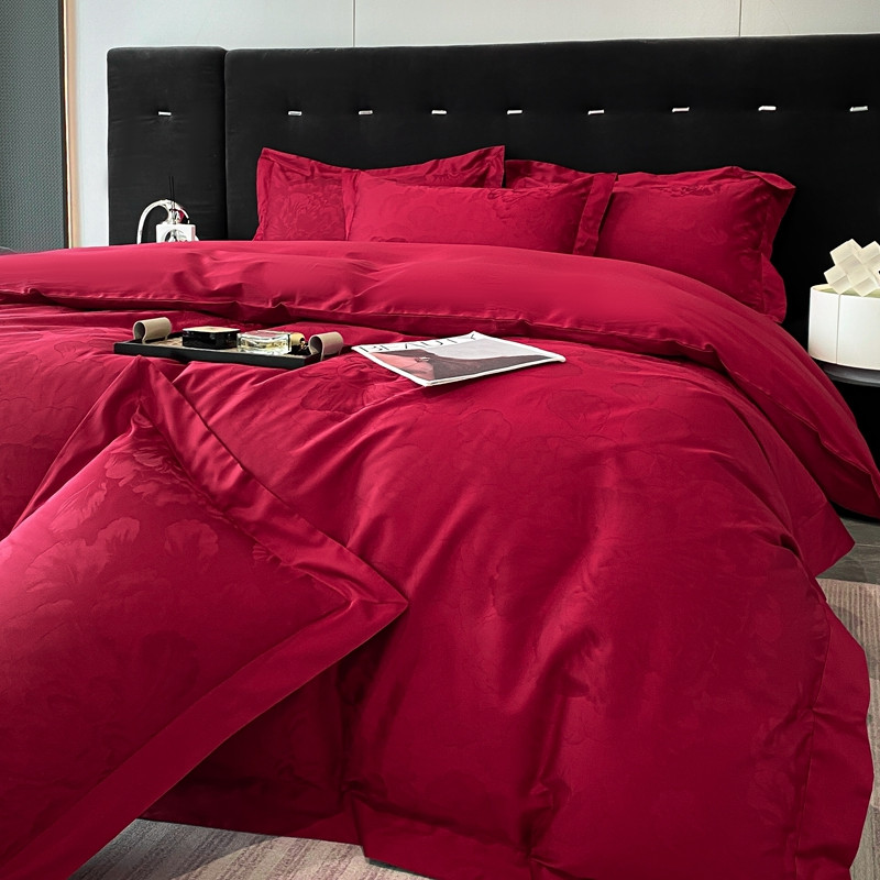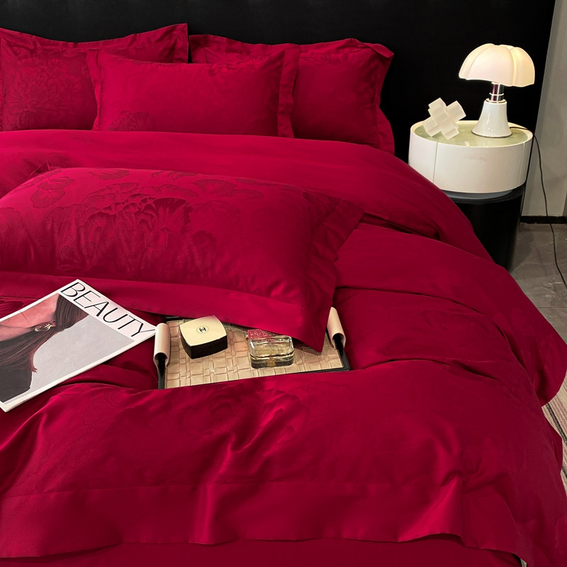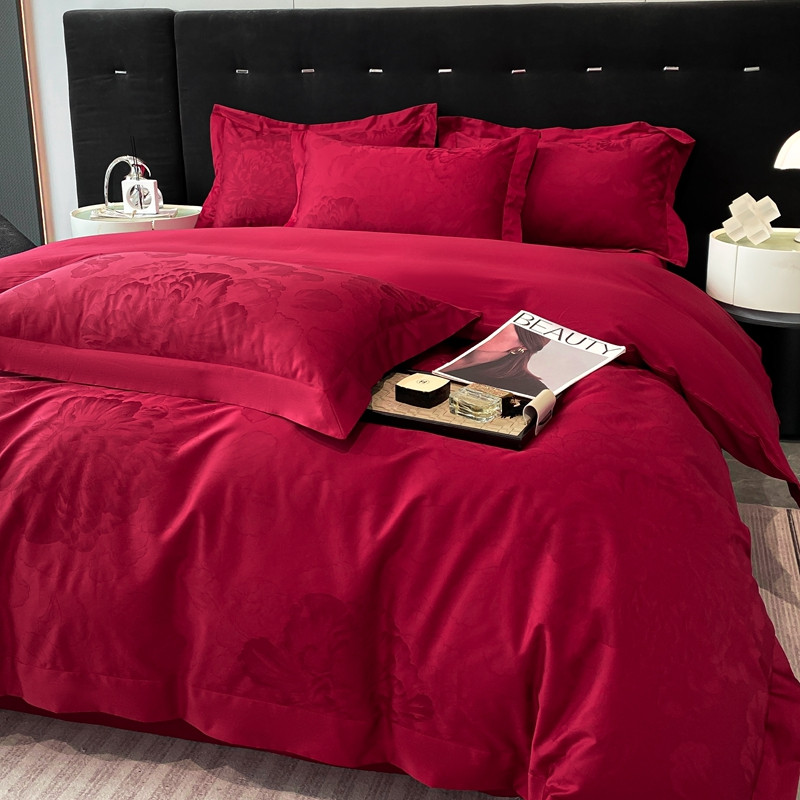 魅都 100s长绒棉提花大拼角四件套 国色牡丹-酒红