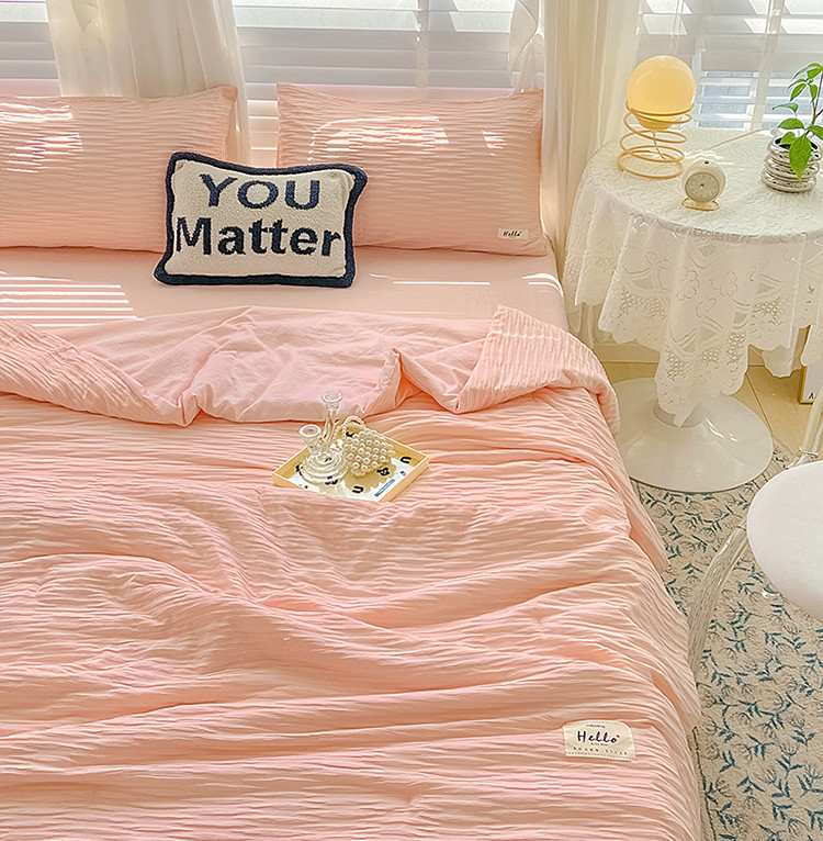 暖芯优选 2023新款韩版泡泡纱水洗棉拼色床单夏被四件套 樱花粉