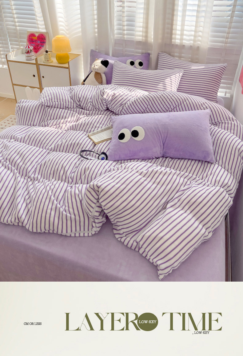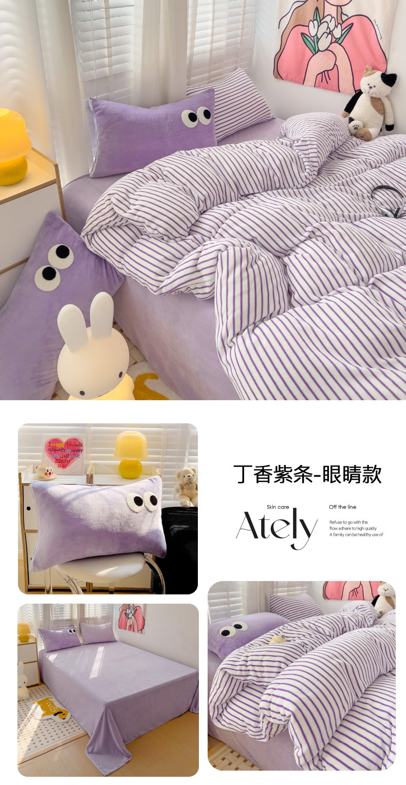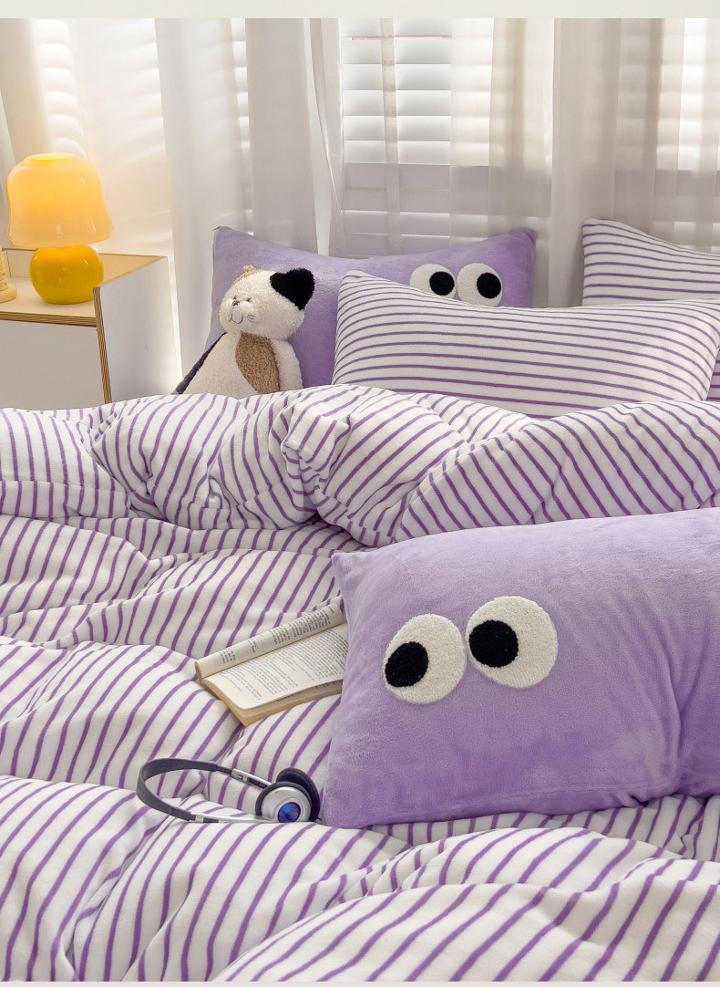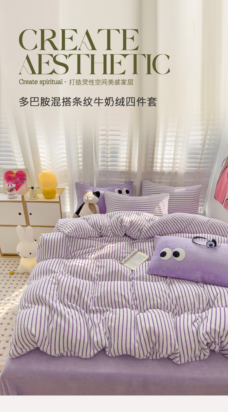 当前位置: 91家纺网 > 商品网购 > 床品套件 > 四件套 > 牛奶绒四件套 > 丽涵 2024秋冬新品牛奶绒博主风多巴胺条纹混搭保暖四件套 丁香紫条-眼睛款