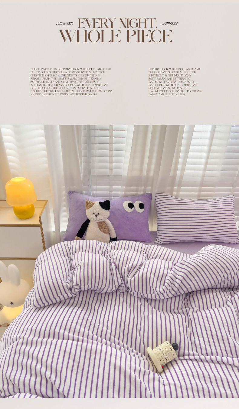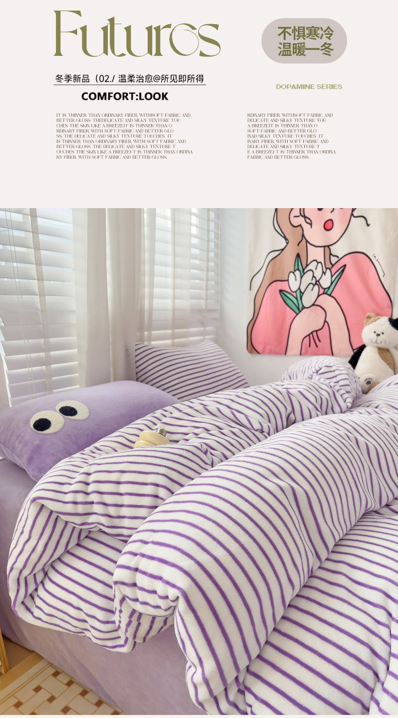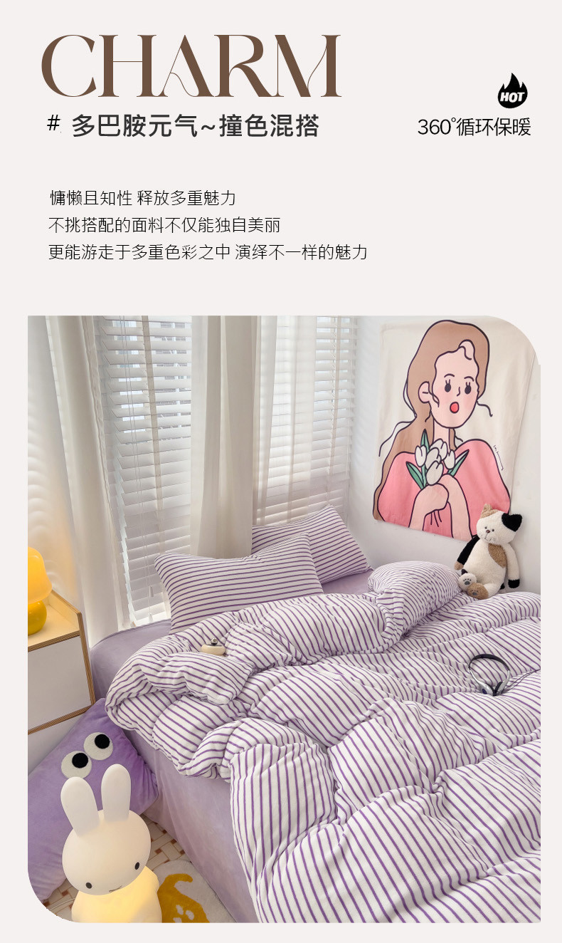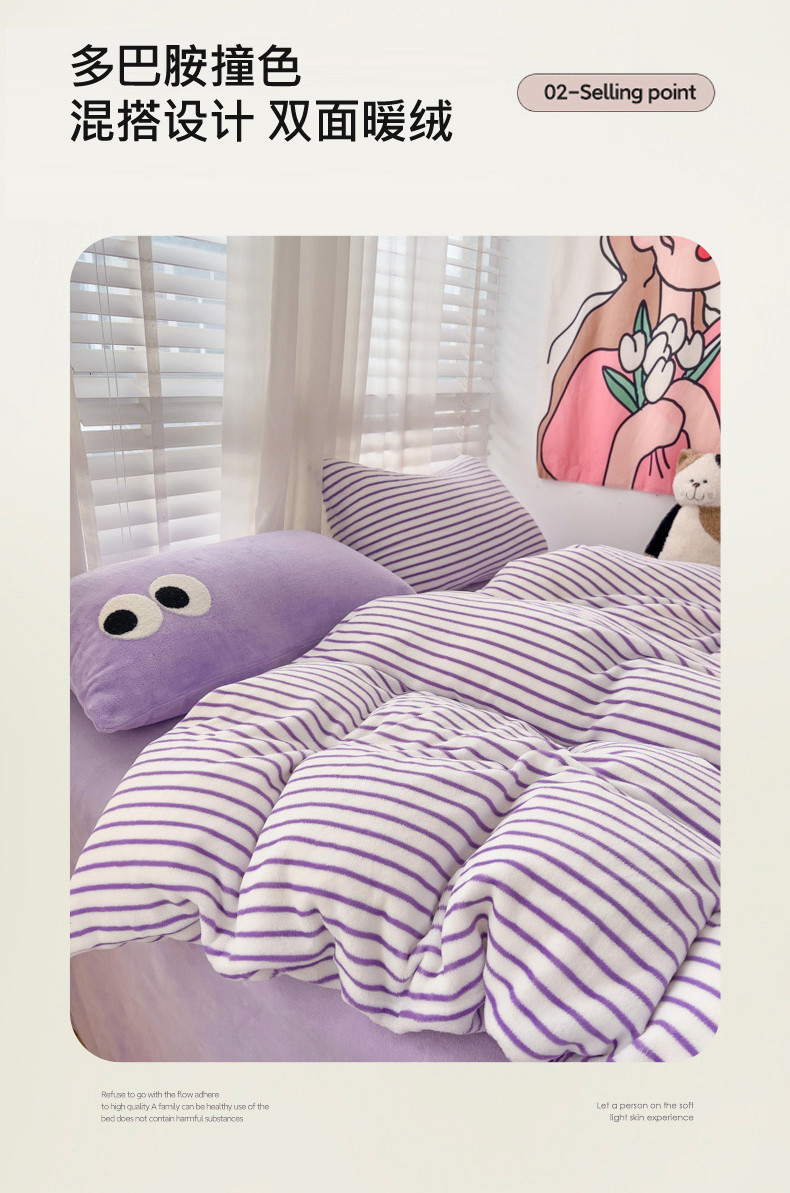 当前位置: 91家纺网 > 商品网购 > 床品套件 > 四件套 > 牛奶绒四件套 > 丽涵 2024秋冬新品牛奶绒博主风多巴胺条纹混搭保暖四件套 丁香紫条-眼睛款