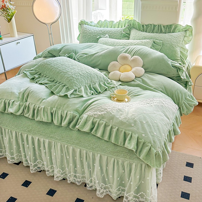 漫布云2025秋冬新款11斤230g全消光牛奶绒夹棉床盖款四件套纯色蕾丝花边刺绣床裙款床盖,蝶恋花-梦幻紫, 蝶恋花-嫩黄 ,蝶恋花-新芽绿, 蝶恋花-婴儿蓝, 蝶恋花-樱花粉
