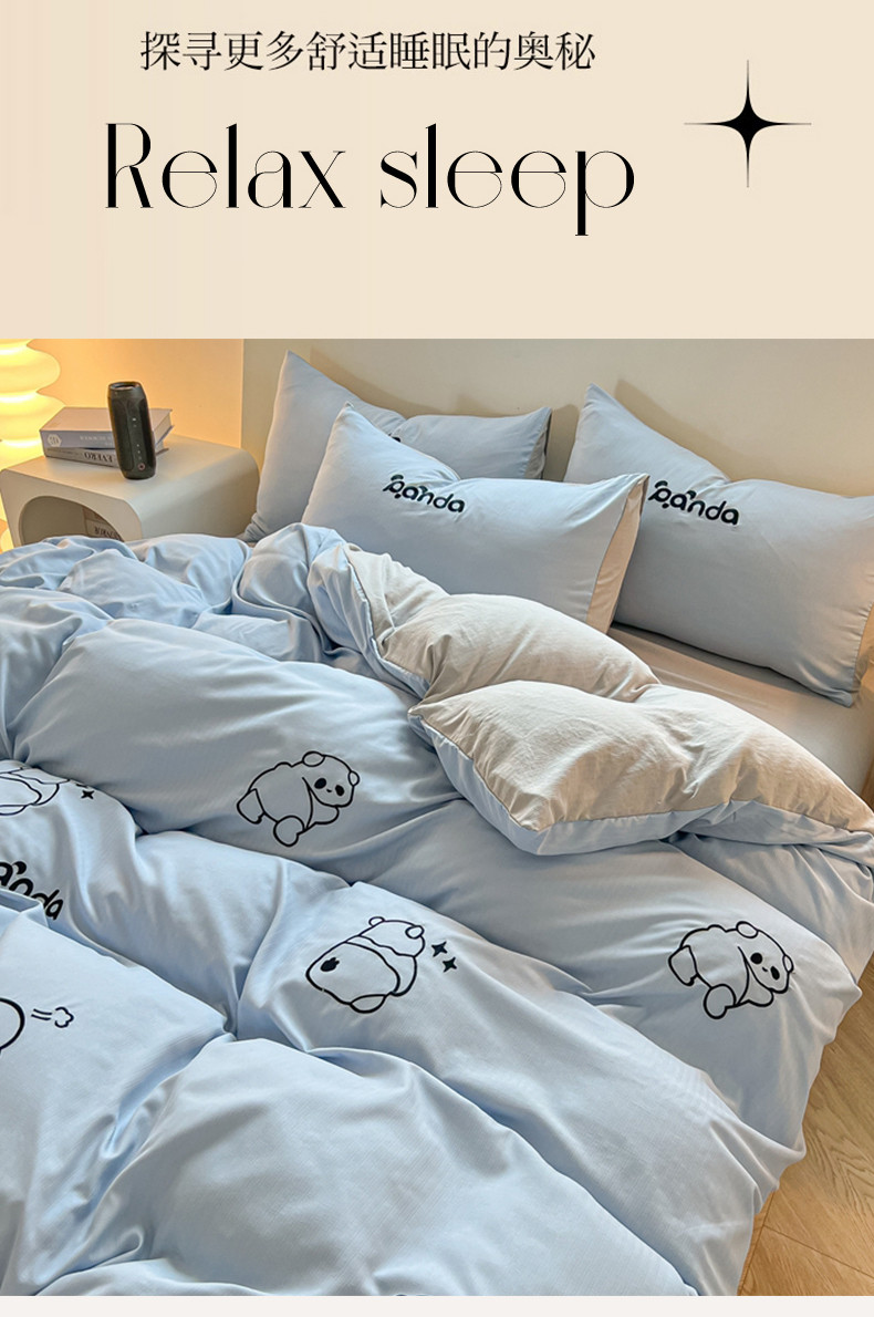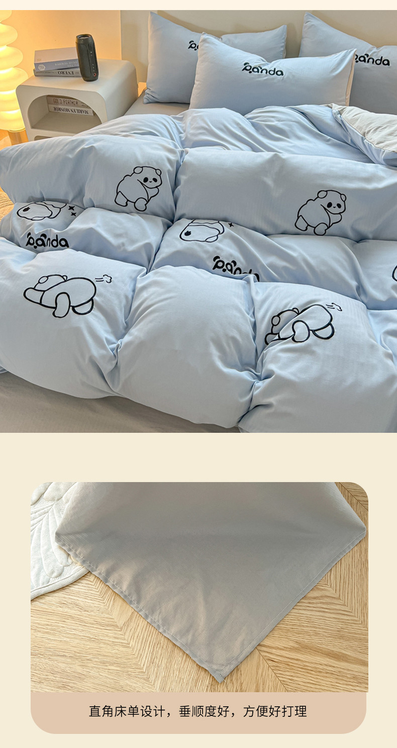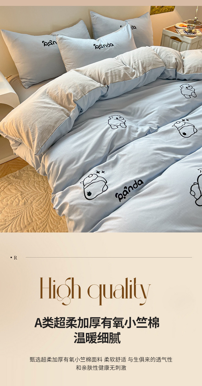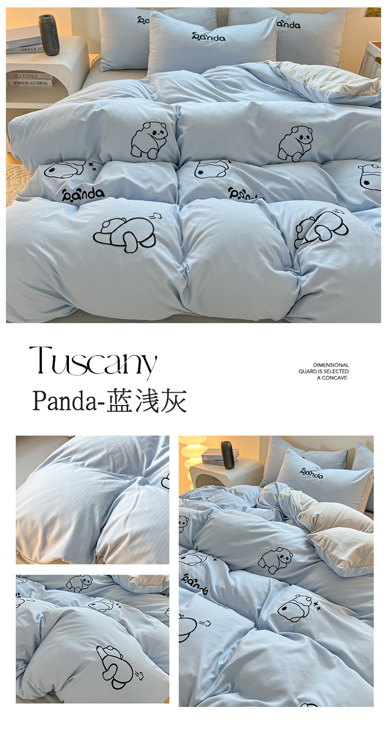 商品名称:2024新款A类超柔加厚有氧提花小竺棉绣花四件套 Panda-蓝浅灰