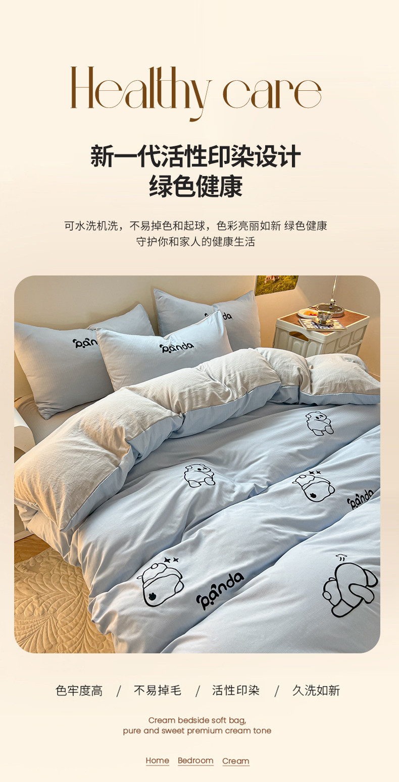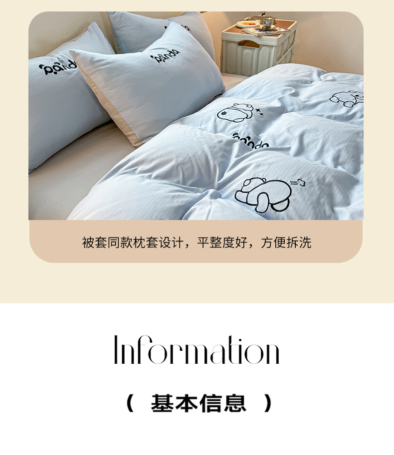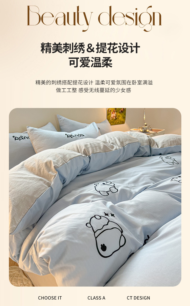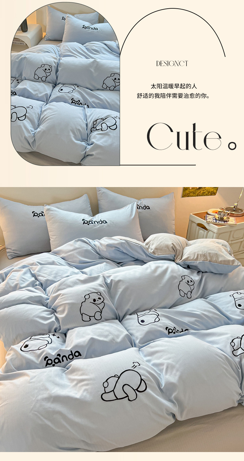 商品名称:2024新款A类超柔加厚有氧提花小竺棉绣花四件套 Panda-蓝浅灰