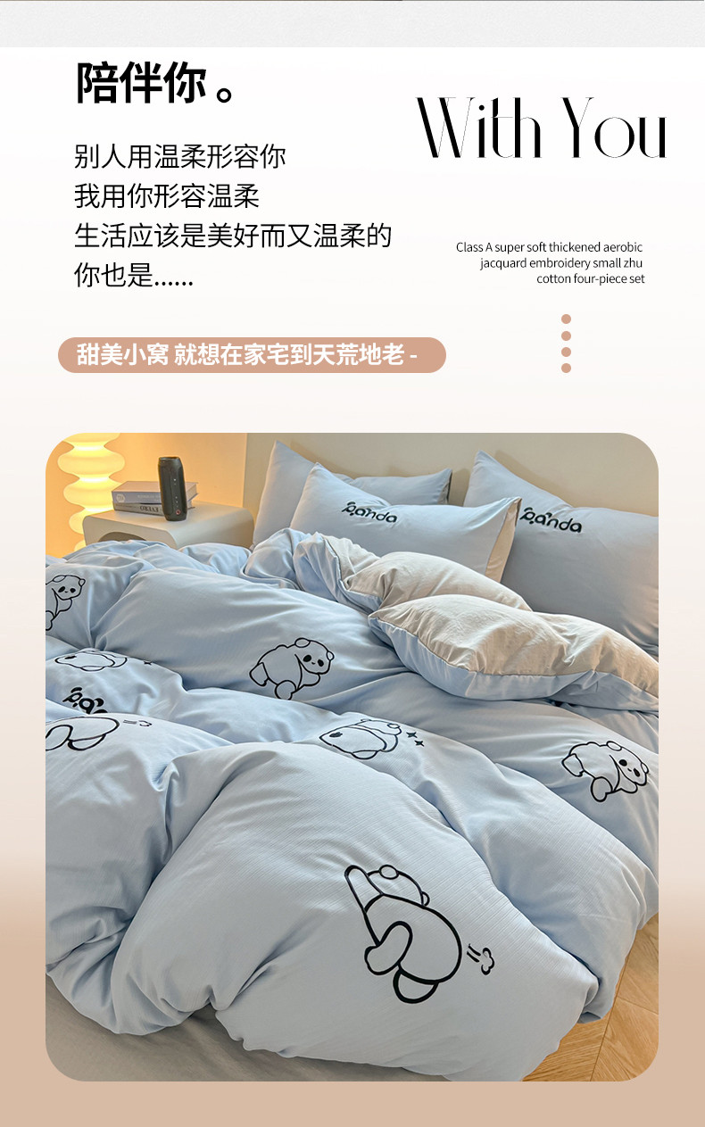 2024新款A类超柔加厚有氧提花小竺棉绣花四件套 Panda-蓝浅灰