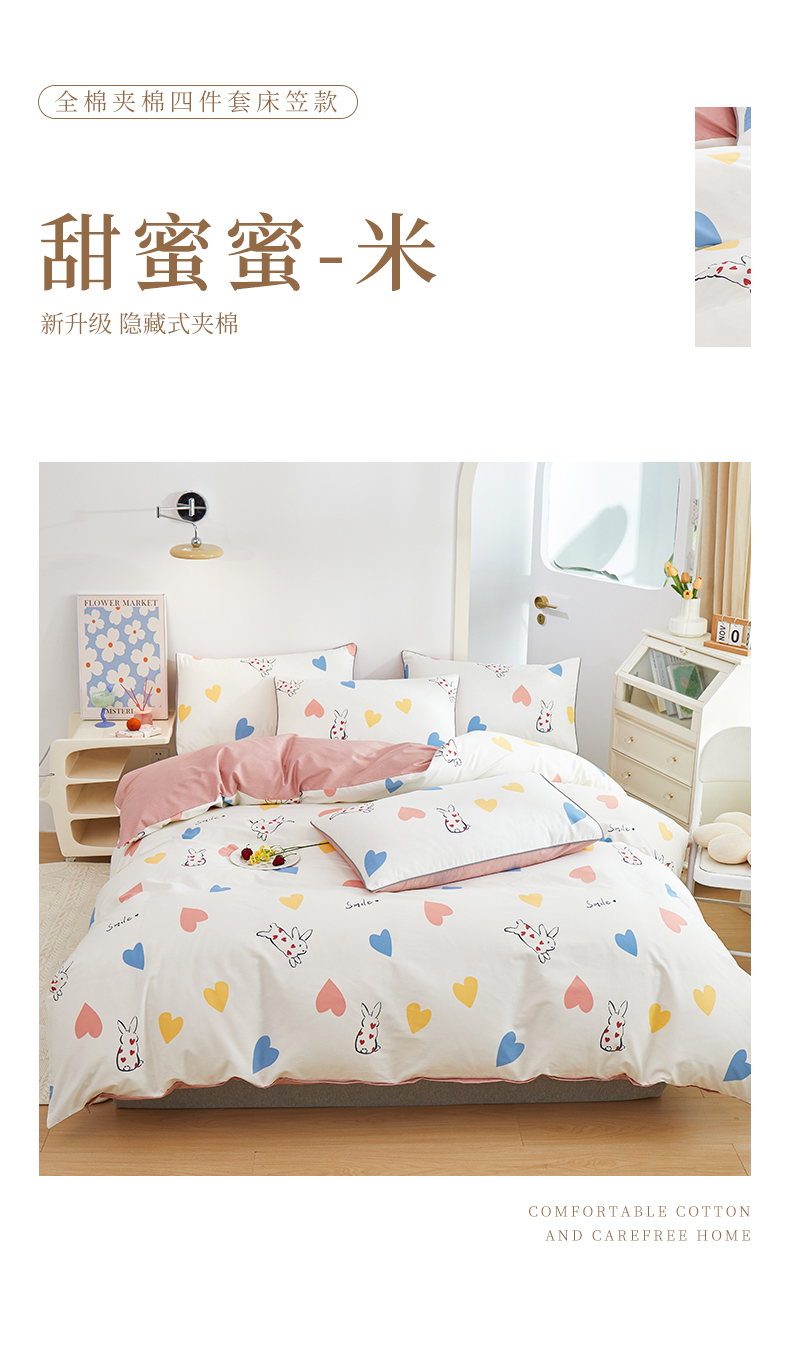 当前位置: 91家纺网 > 商品网购 > 床品套件 > 四件套 > 全棉普通四件套 > 元元被业 2024新款小清新隐藏式全棉夹棉四件套床笠款 甜蜜蜜-米
